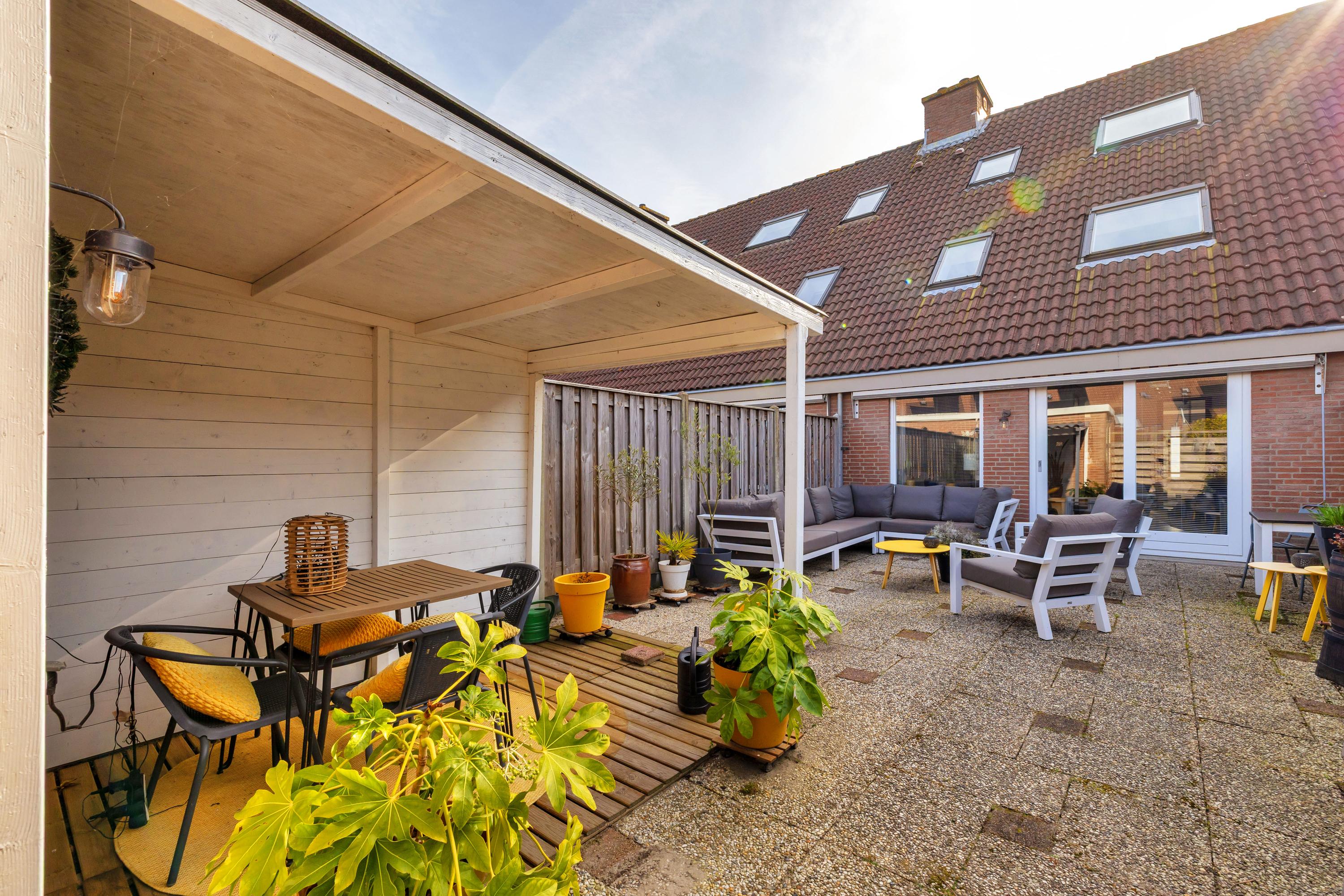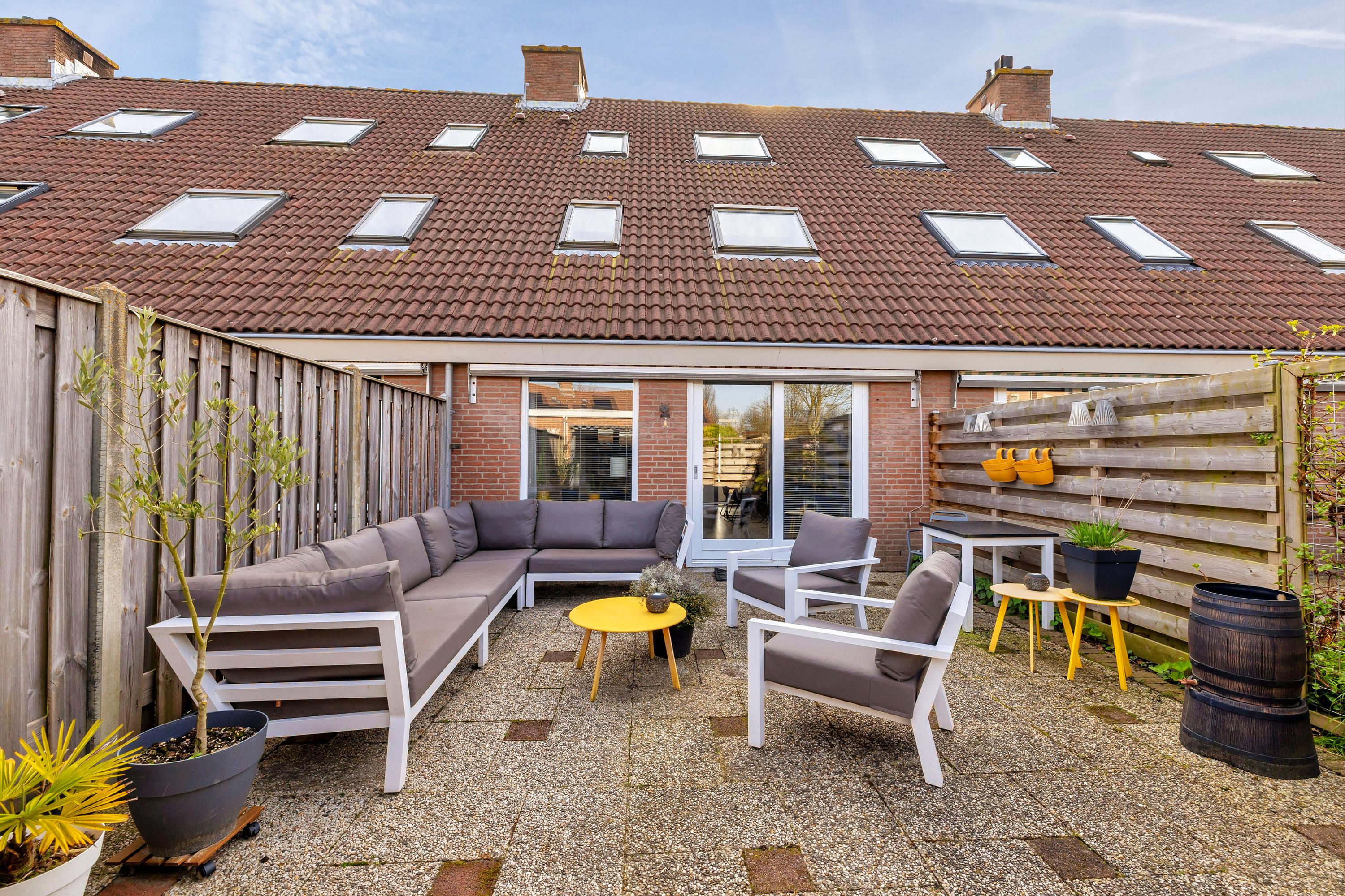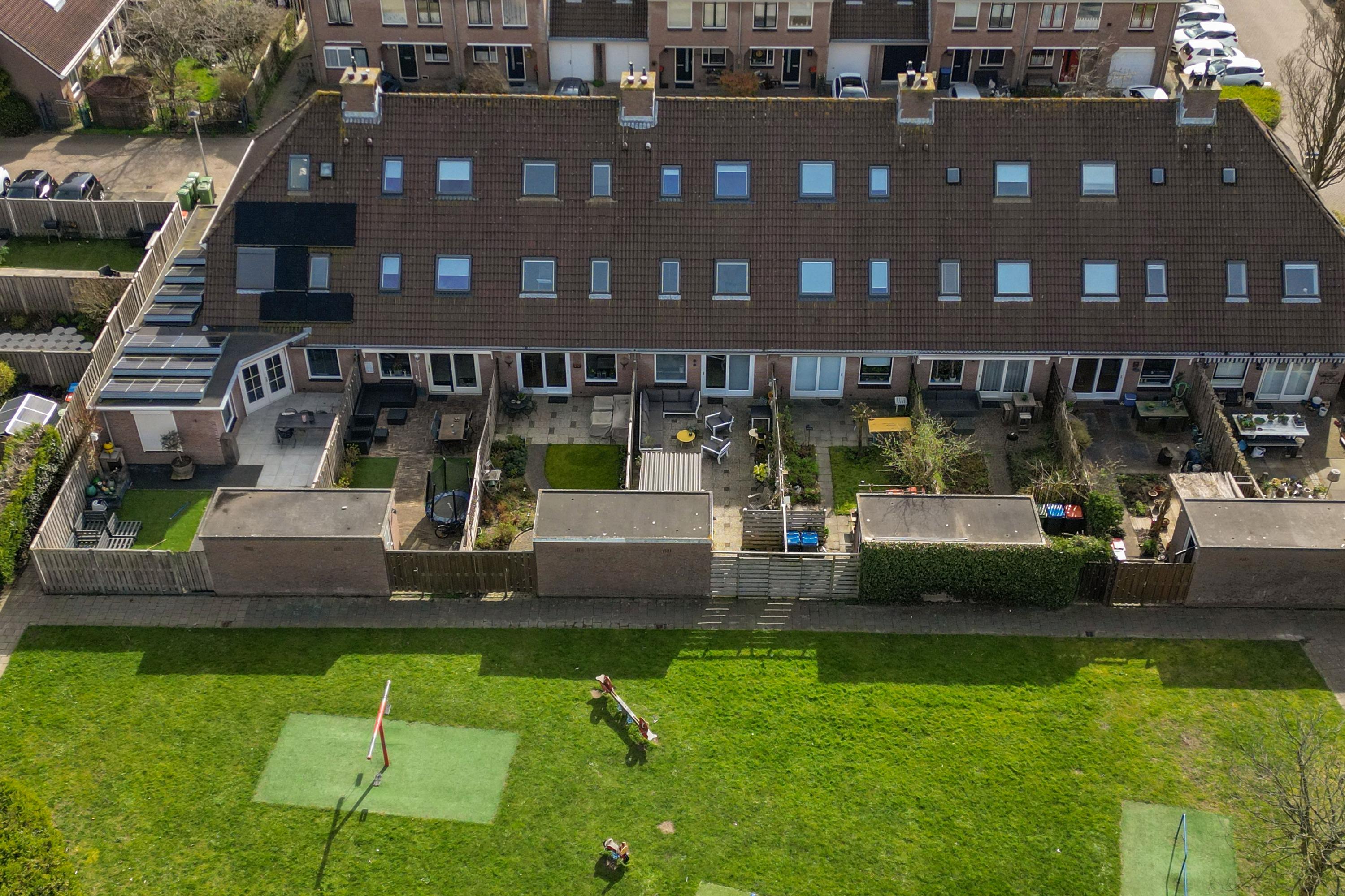 Aan de voorzijde is een ruime oprit met plek voor twee auto’s en er is een buitenkraan. De achtertuin ligt op het noordwesten en is voorzien van verlichting, een buitenkraan, een zonnescherm en is omheind met houten schuttingen. Achterin staat een stenen berging met overkapping en is voorzien elektra. Via de praktische achterom heb je toegang tot het achterliggende pad, direct naast een leuk speeltuintje, wat ideaal is voor gezinnen.
