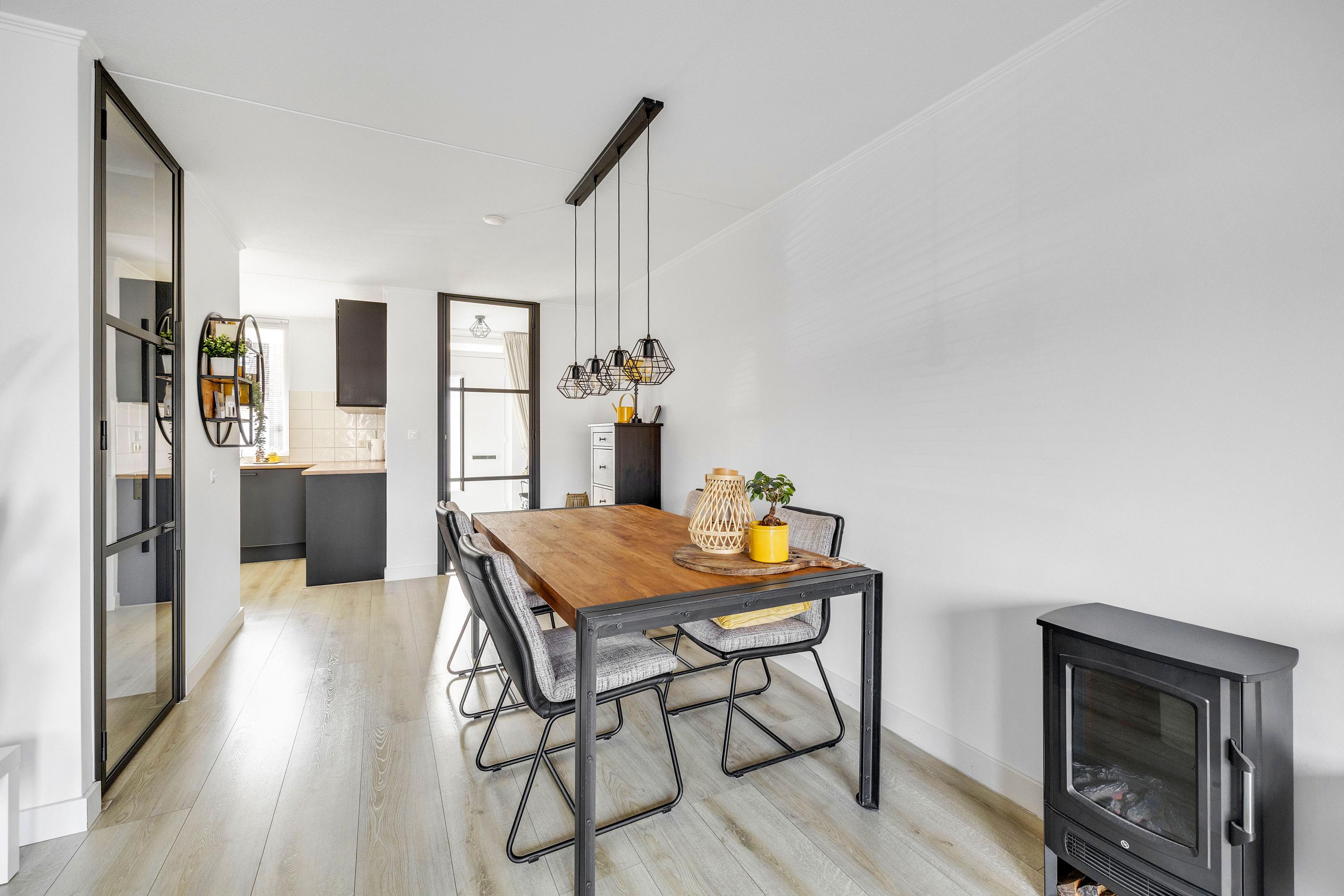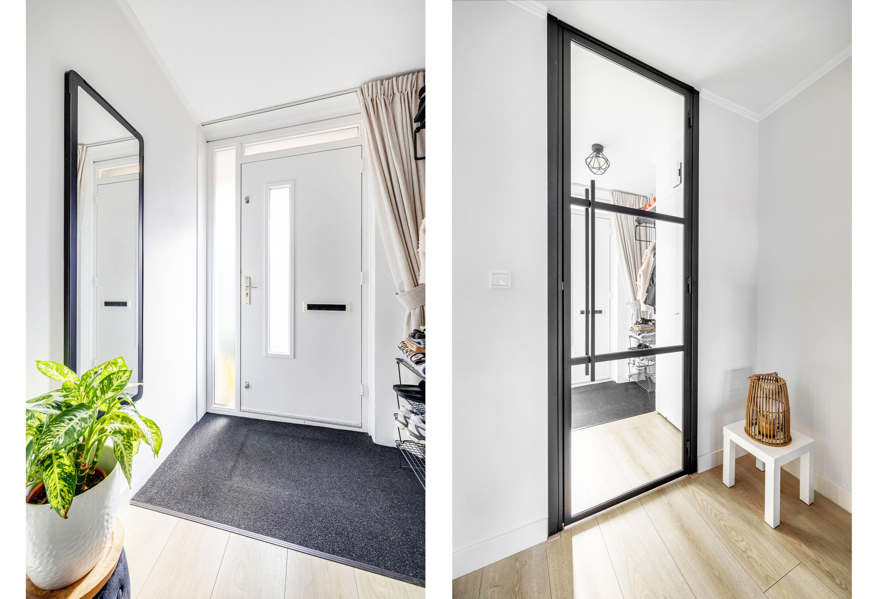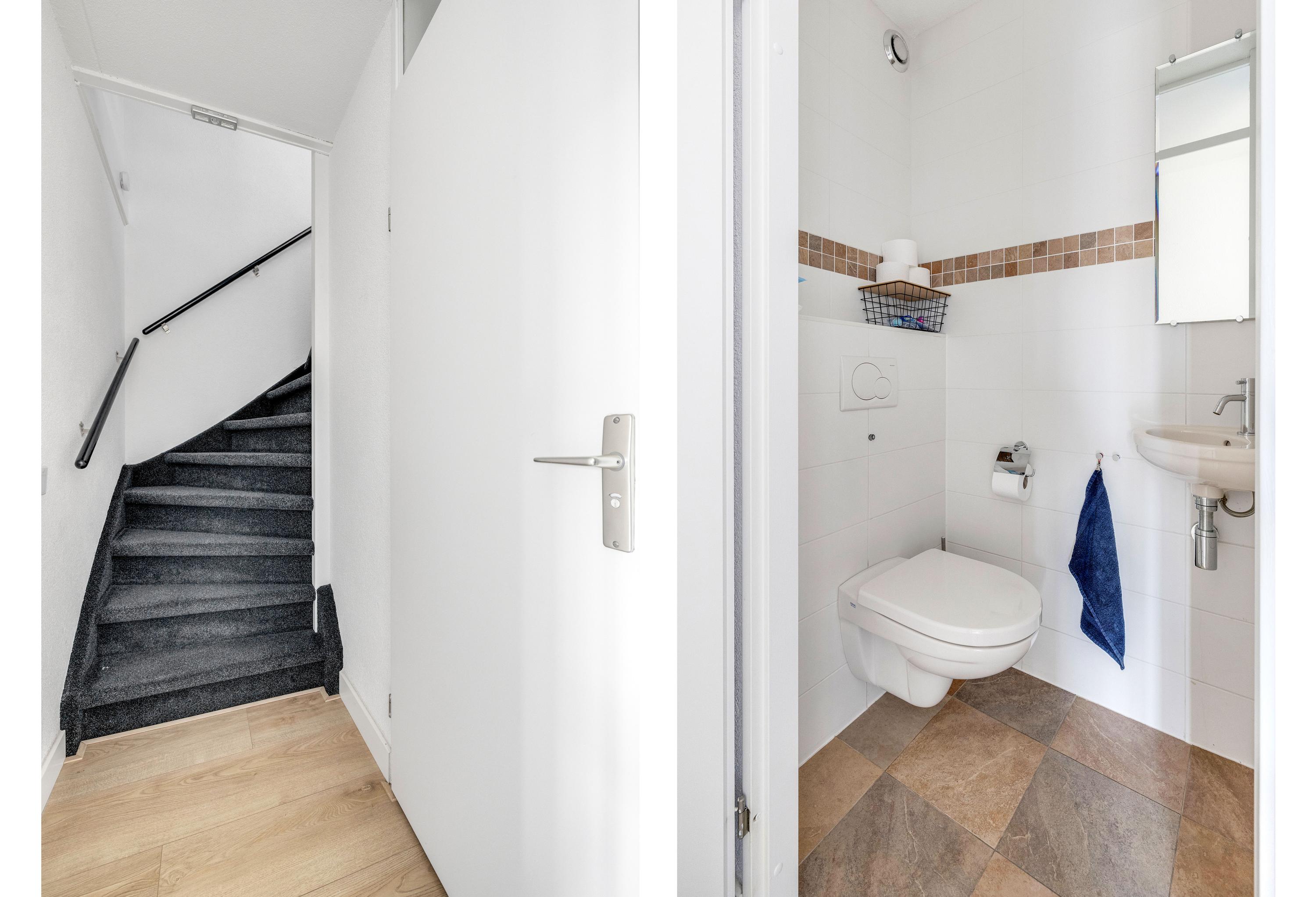 Je komt de woning binnen via de entree met meterkast. Vanuit hier loop je door naar de ruime en lichte woonkamer, waar een eethoek is gecreëerd. Dankzij de schuifpui staat de woonkamer in directe verbinding met de achtertuin en is er veel lichtinval. Aan de achterzijde is bovendien buitenzonwering aanwezig. Aansluitend bevindt zich de half open keuken, voorzien van gaskookplaat, afzuigkap, koelkast, vriezer, Quooker, combi-magnetron en vaatwasser. Vanuit de keuken is er toegang tot een praktische trapkast en hier is de mechanische ventilatie te bedienen. Via de woonkamer bereik je een hal met de trapopgang naar de eerste verdieping en een volledig betegeld toilet met hangend closet en fonteintje. De begane grond is strak afgewerkt met een laminaatvloer, gestucte wanden en stalen deuren.