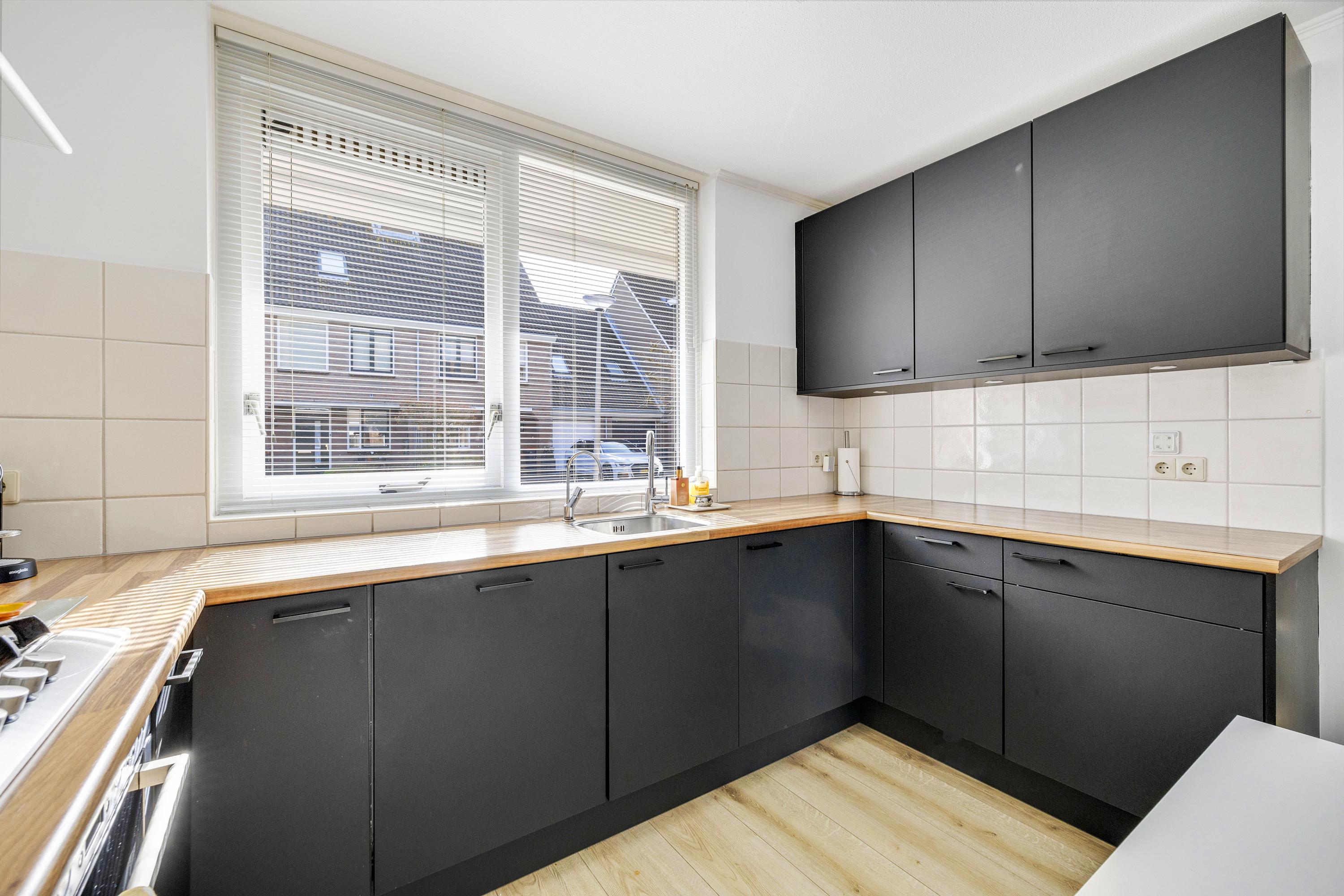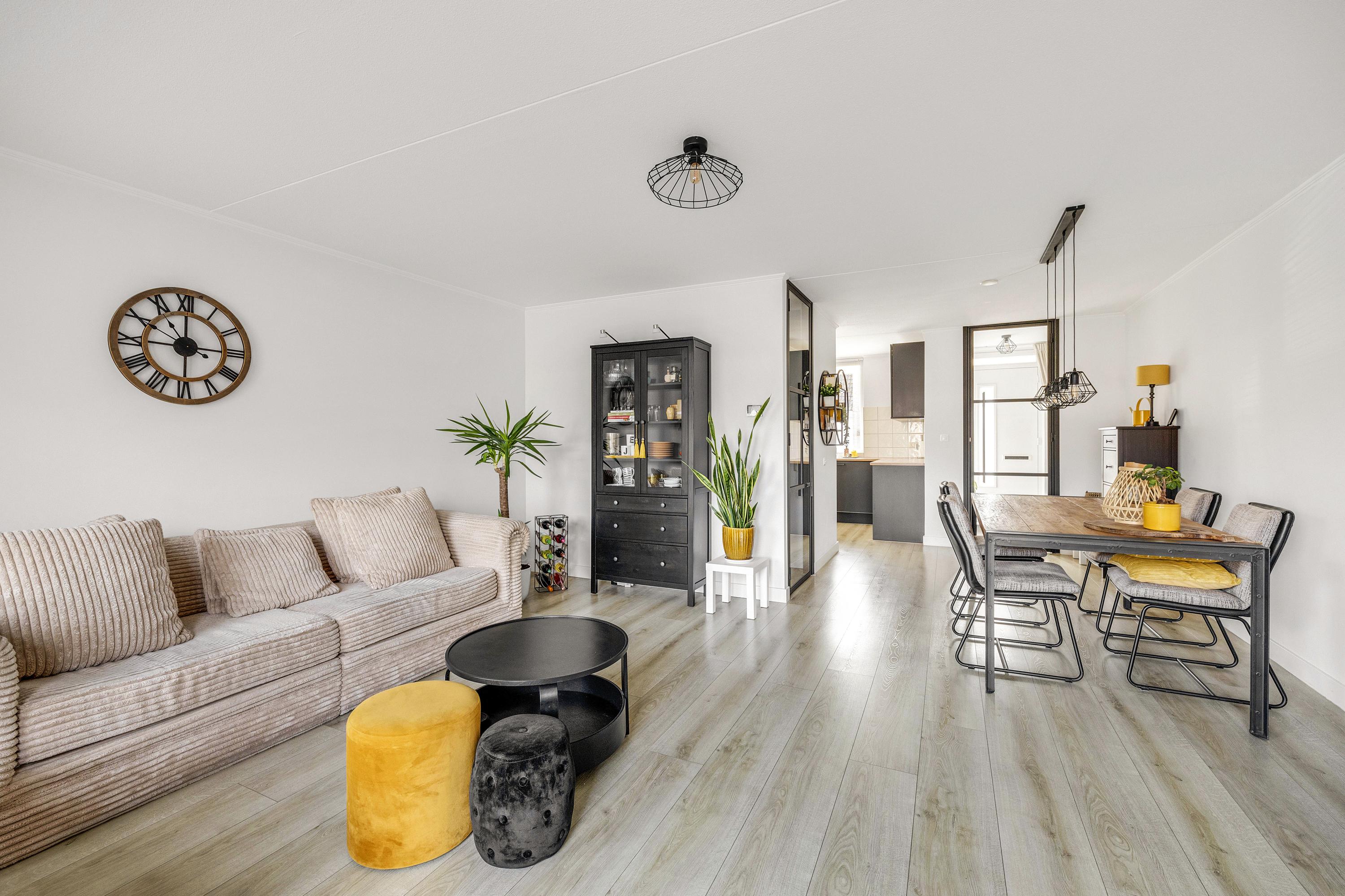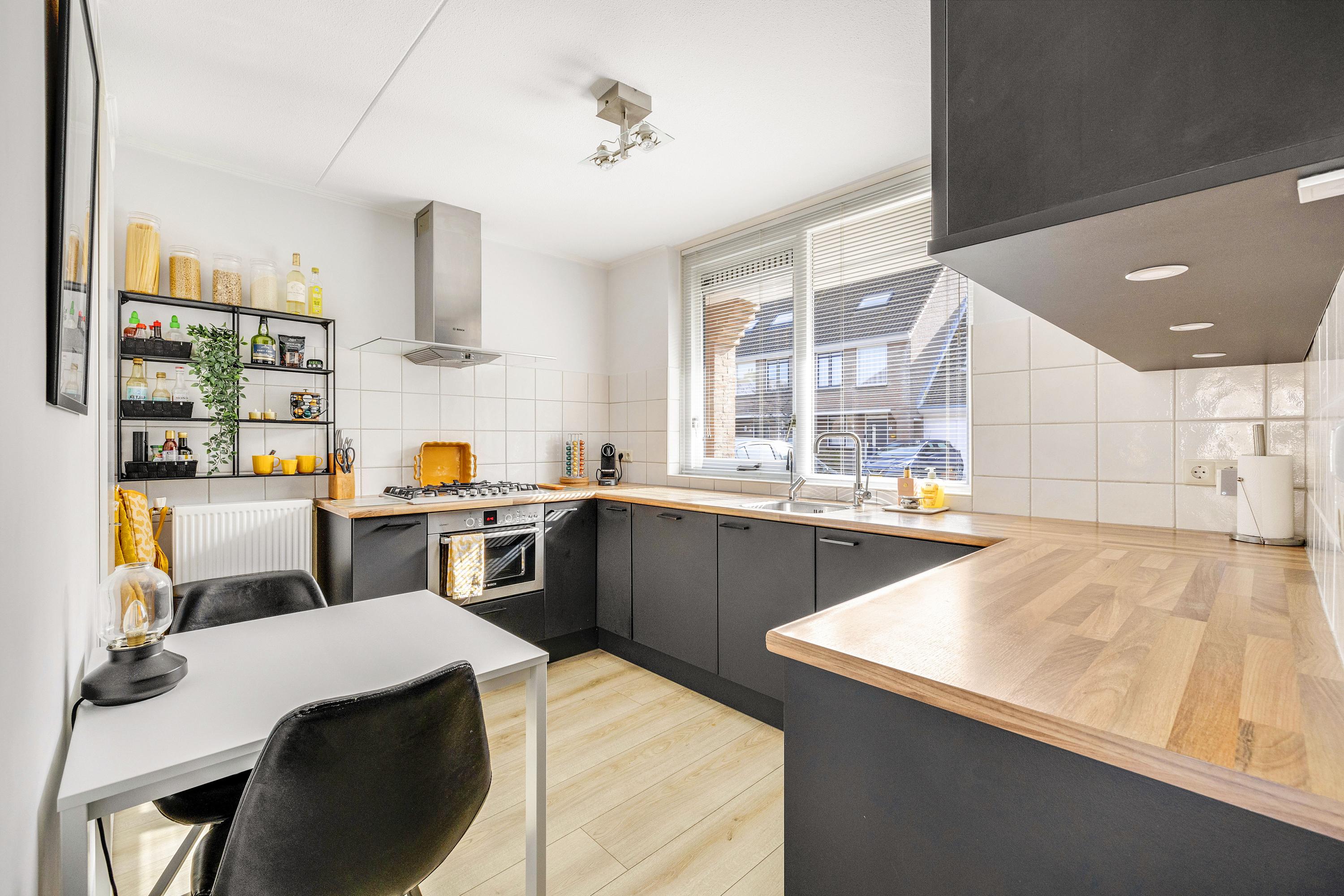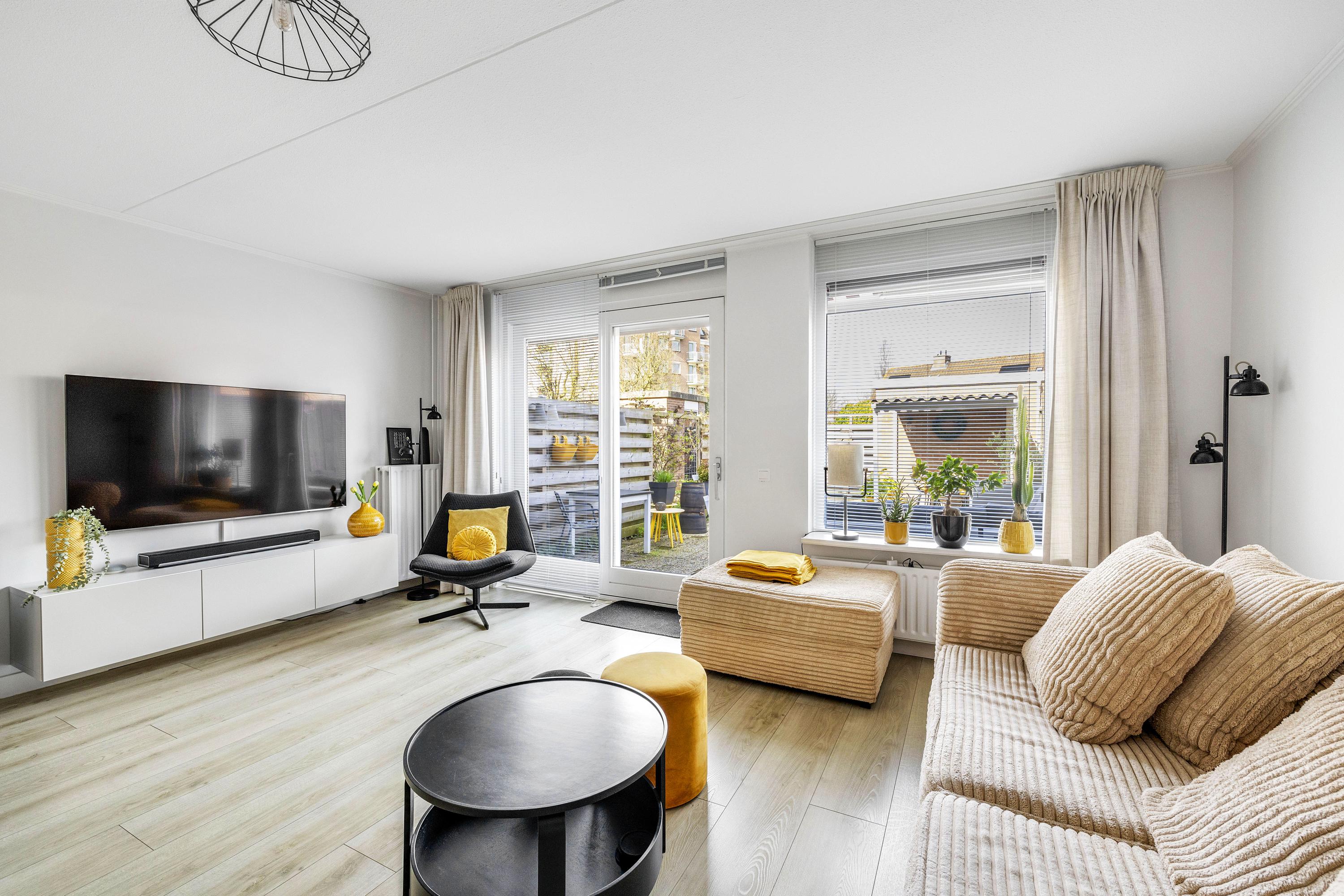 Je komt de woning binnen via de entree met meterkast. Vanuit hier loop je door naar de ruime en lichte woonkamer, waar een eethoek is gecreëerd. Dankzij de schuifpui staat de woonkamer in directe verbinding met de achtertuin en is er veel lichtinval. Aan de achterzijde is bovendien buitenzonwering aanwezig. Aansluitend bevindt zich de half open keuken, voorzien van gaskookplaat, afzuigkap, koelkast, vriezer, Quooker, combi-magnetron en vaatwasser. Vanuit de keuken is er toegang tot een praktische trapkast en hier is de mechanische ventilatie te bedienen. Via de woonkamer bereik je een hal met de trapopgang naar de eerste verdieping en een volledig betegeld toilet met hangend closet en fonteintje. De begane grond is strak afgewerkt met een laminaatvloer, gestucte wanden en stalen deuren.