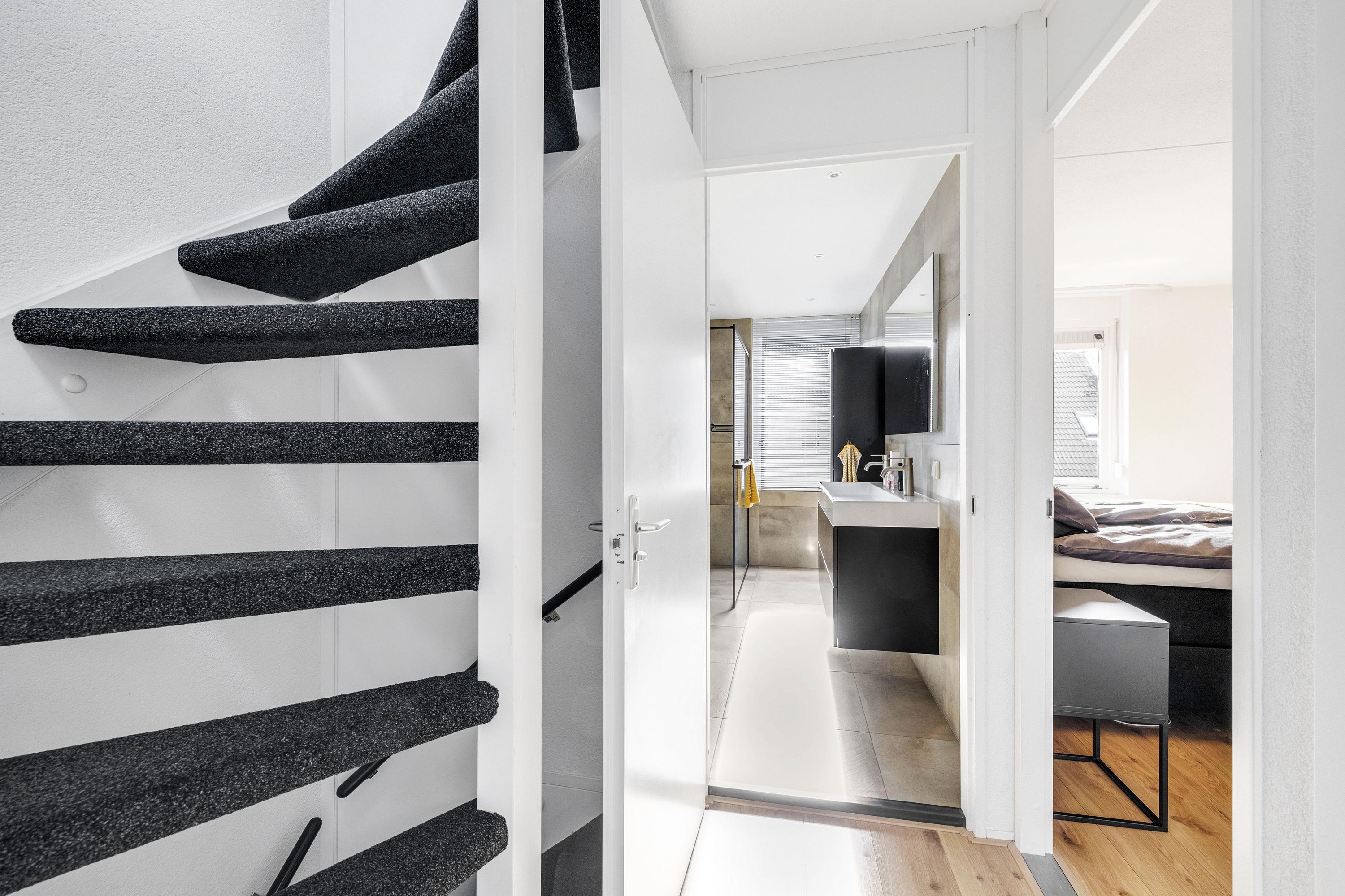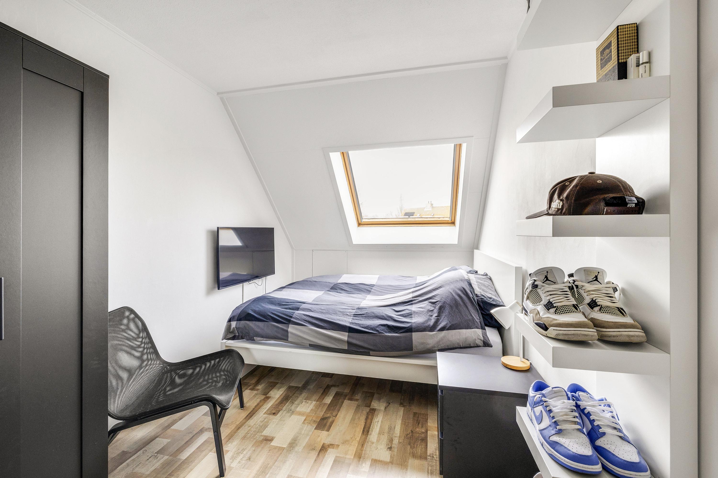 De overloop geeft toegang tot de kamers op deze verdieping. Aan de voorzijde bevindt zich een slaapkamer die is voorzien van een rolluik. Aan de achterzijde liggen nog twee slaapkamers, beide voorzien van dakramen die veel natuurlijk licht binnenlaten. De badkamer is in 2022 volledig vernieuwd en modern afgewerkt; hier vind je een ruime inloop regendouche, hangend closet, designradiator, dubbel wastafelmeubel en elektrische vloerverwarming. Verder zorgt het aanwezige raam zorgt voor natuurlijk licht en ventilatie.