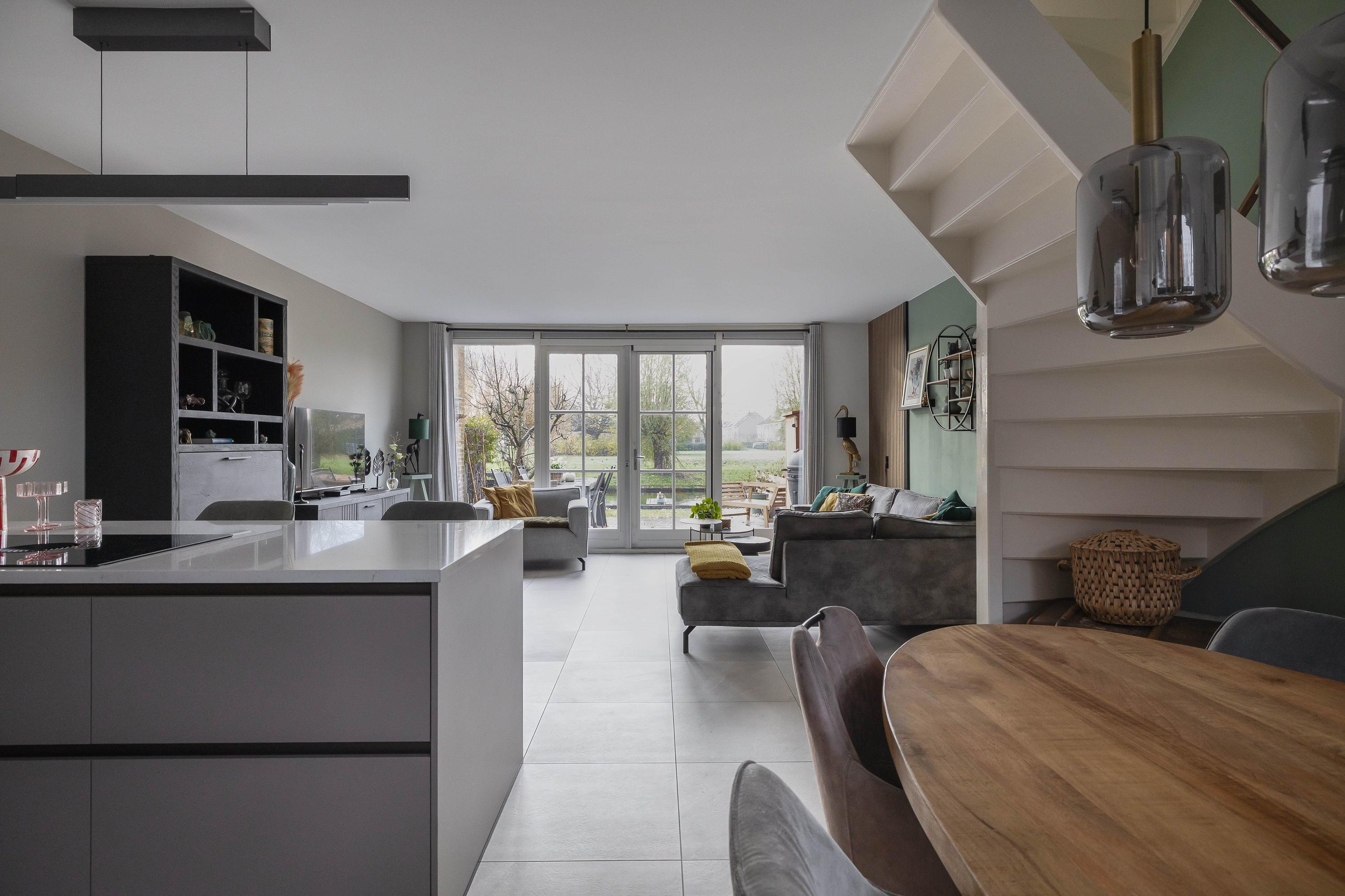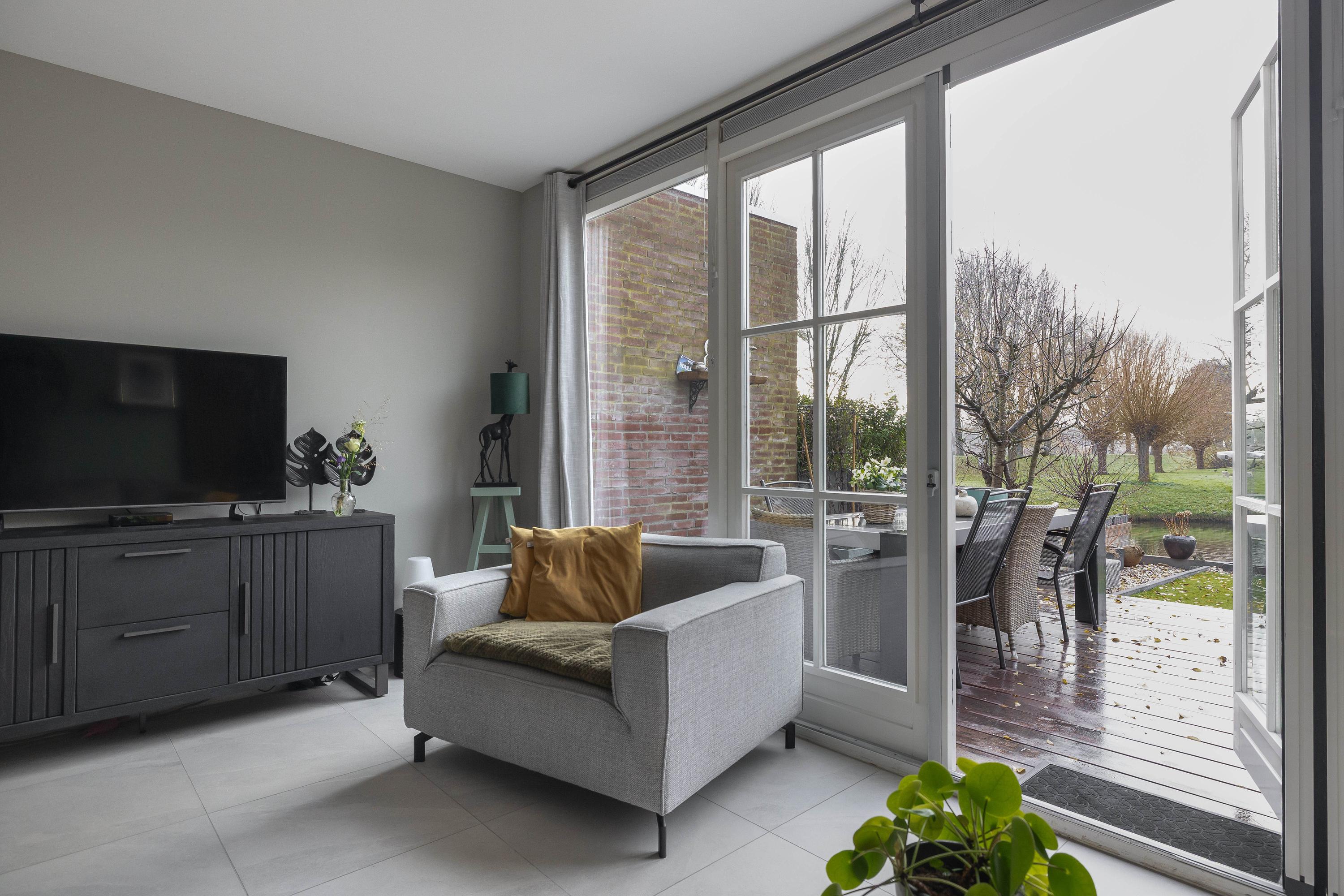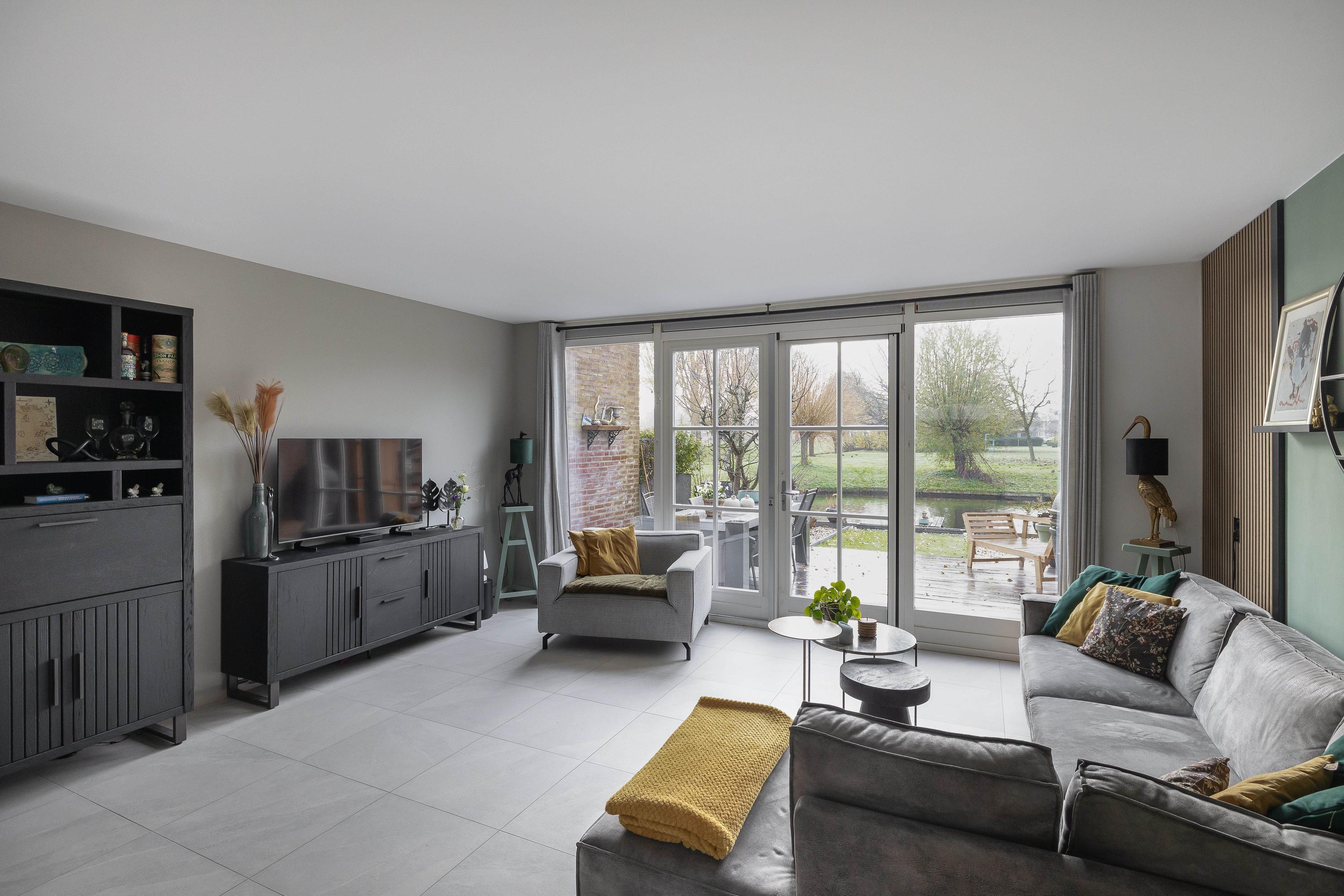 Je stapt binnen in een ruime entree, ontstaan doordat de voormalige berging bij de woning is betrokken, met aan de linkerzijde het deels betegelde toilet met hangend closet en fontein. De open keuken, geheel vernieuwd in 2025 en in L-opstelling, is voorzien van inductiekookplaat met afzuiging, combi-magnetron, stoomoven, Quooker en vaatwasser. Naast de keuken ligt de eethoek, ideaal om samen te koken en te tafelen. Door de uitbreiding en slimme indeling is de woonkamer aan de achterzijde ruimer geworden, deze is voorzien van openslaande deuren naar de zonnige achtertuin aan het water. De gehele begane grond is vernieuwd in 2025 en voorzien van vloerverwarming en een plavuizen vloer, wat zorgt voor een comfortabele en moderne uitstraling.