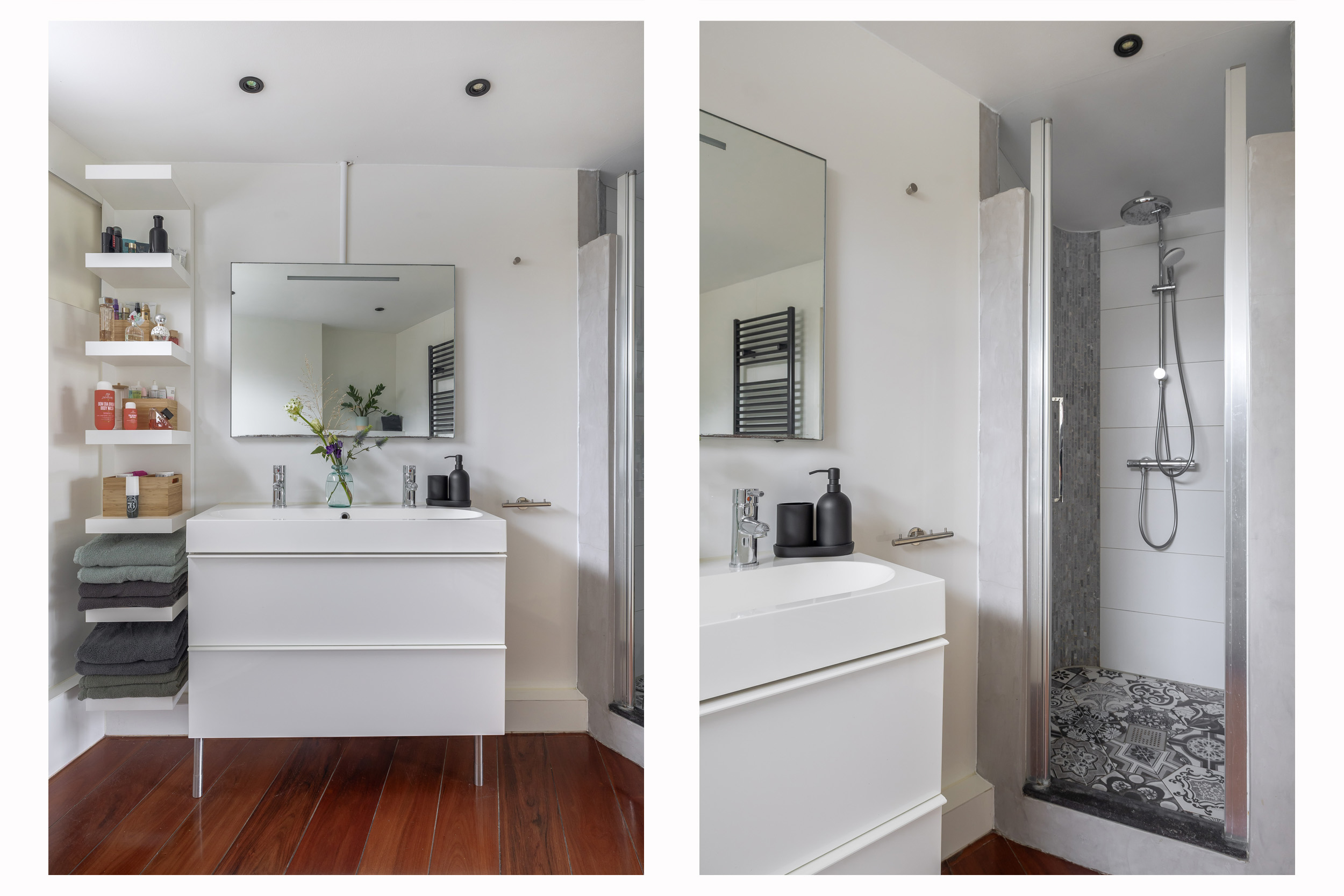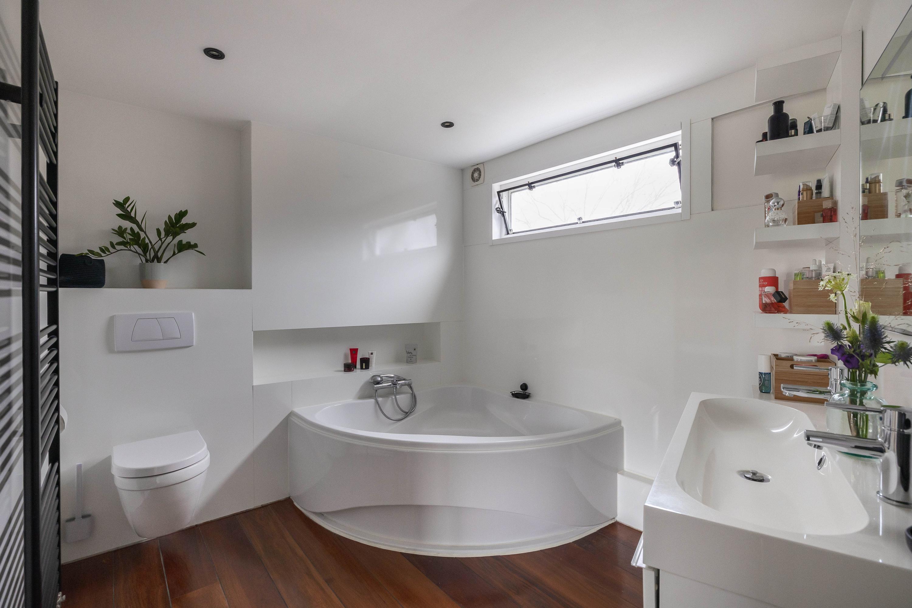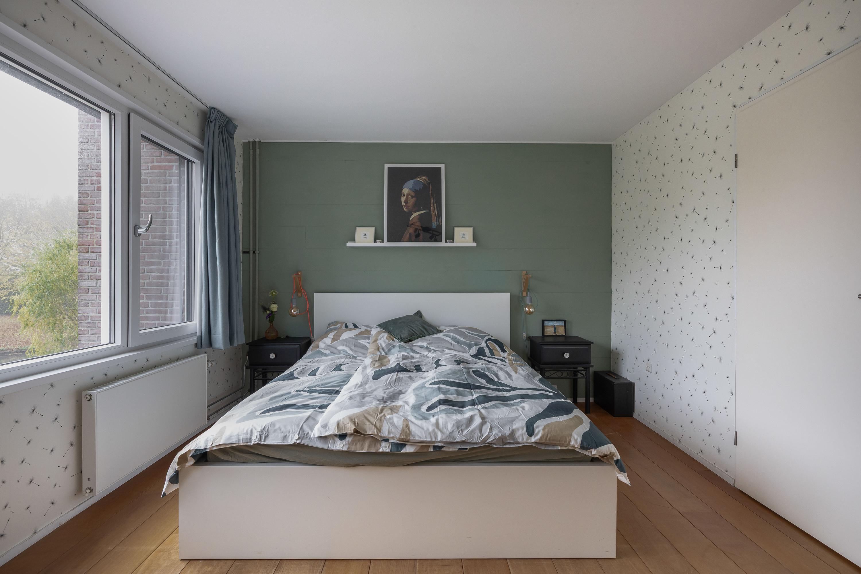 Via de trap in de woonkamer kom je op de overloop, die toegang geeft tot twee slaapkamers en de badkamer. De hoofdslaapkamer bevindt zich aan de achterzijde, is voorzien van een ruime inloopkast, elektrische rolluiken, houten vloer en biedt een prachtig uitzicht over het water en het achtergelegen parkje. De tweede slaapkamer ligt aan de voorzijde en is eveneens netjes afgewerkt. De badkamer is ruim en ingericht met een zitbad, douchecabine, een dubbel wastafelmeubel en toilet. Het aanwezige raam zorgt voor natuurlijk licht en ventilatie. De badkamer is voorzien van een houten vloer. De overloop en slaapkamer aan de voorzijde zijn voorzien van een nette pvc-vloer, wat zorgt voor een strakke en onderhoudsvriendelijke uitstraling.