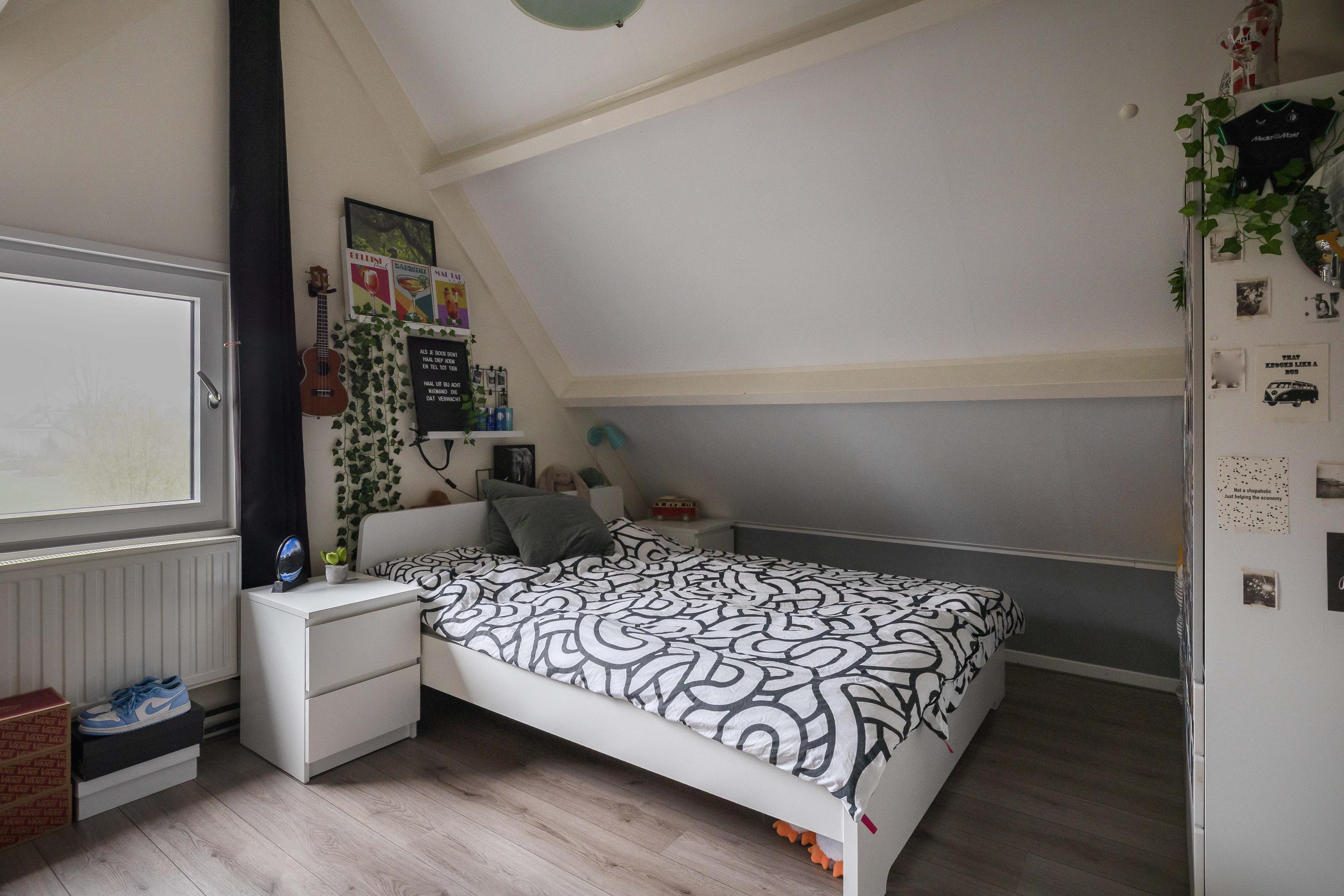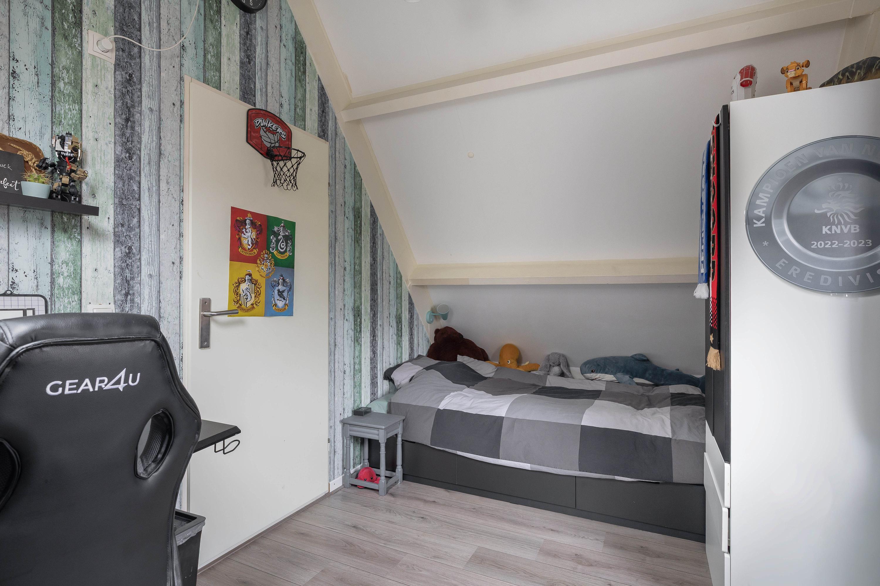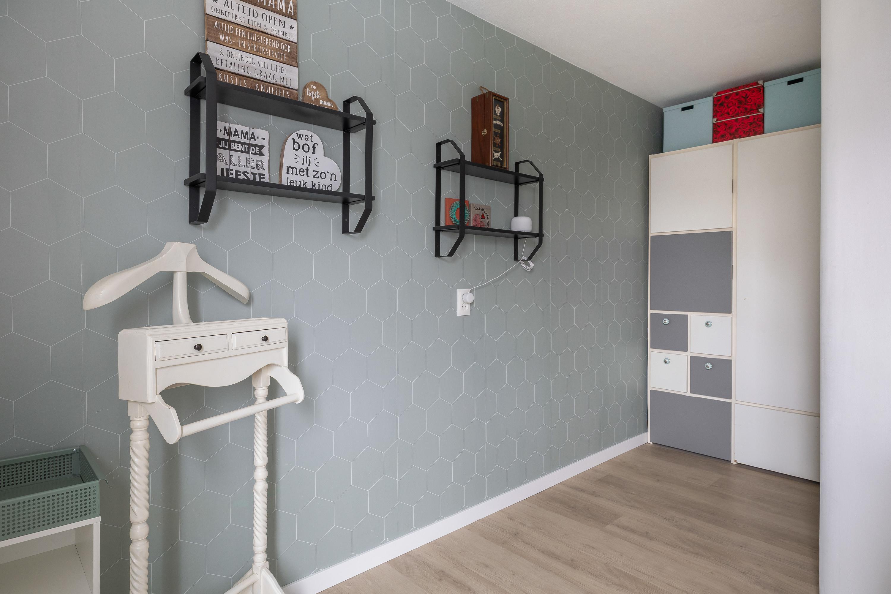 Via de overloop bereik je twee slaapkamers en de stook- en wasruimte. In deze ruimte bevindt zich de opstelling van de cv-combiketel (Vaillant, 2016) en de aansluitingen voor de wasmachine en droger. De twee slaapkamers zijn beide voorzien van een kopgevelraam, en de slaapkamer aan de achterzijde is uitgerust met elektrische rolluiken. Ook is er nog een handige bergkast te vinden op de overloop. De gehele verdieping is afgewerkt met een laminaatvloer, wat zorgt voor een nette en onderhoudsvriendelijke uitstraling.