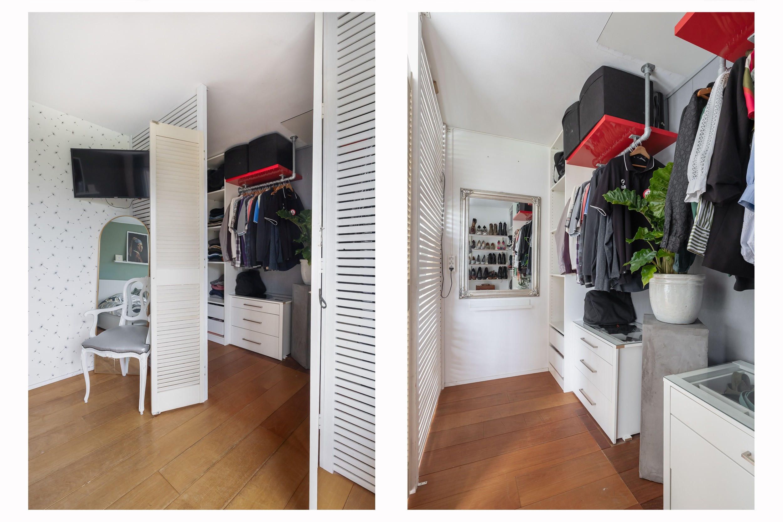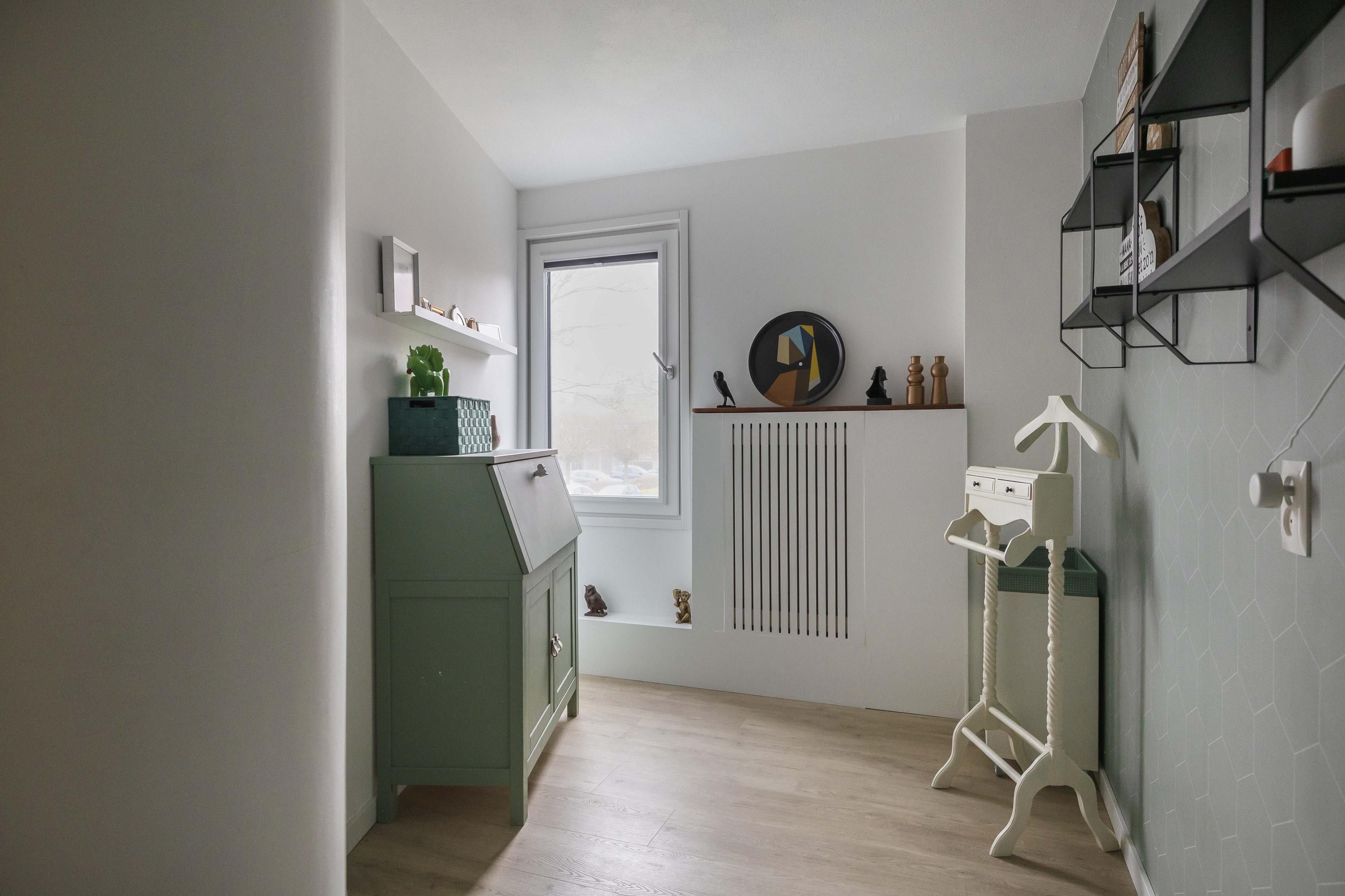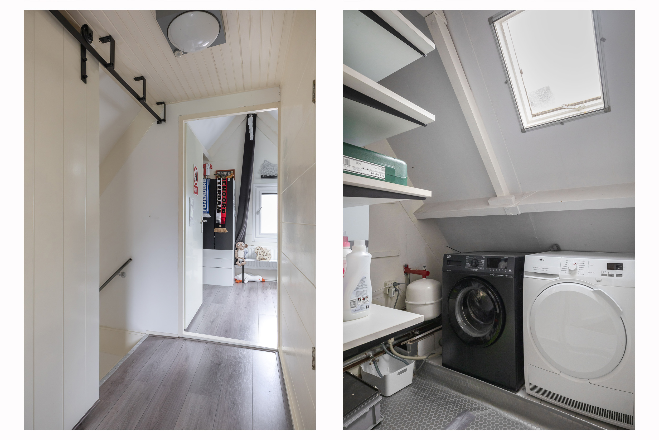 Via de overloop bereik je twee slaapkamers en de stook- en wasruimte. In deze ruimte bevindt zich de opstelling van de cv-combiketel (Vaillant, 2016) en de aansluitingen voor de wasmachine en droger. De twee slaapkamers zijn beide voorzien van een kopgevelraam, en de slaapkamer aan de achterzijde is uitgerust met elektrische rolluiken. Ook is er nog een handige bergkast te vinden op de overloop. De gehele verdieping is afgewerkt met een laminaatvloer, wat zorgt voor een nette en onderhoudsvriendelijke uitstraling.