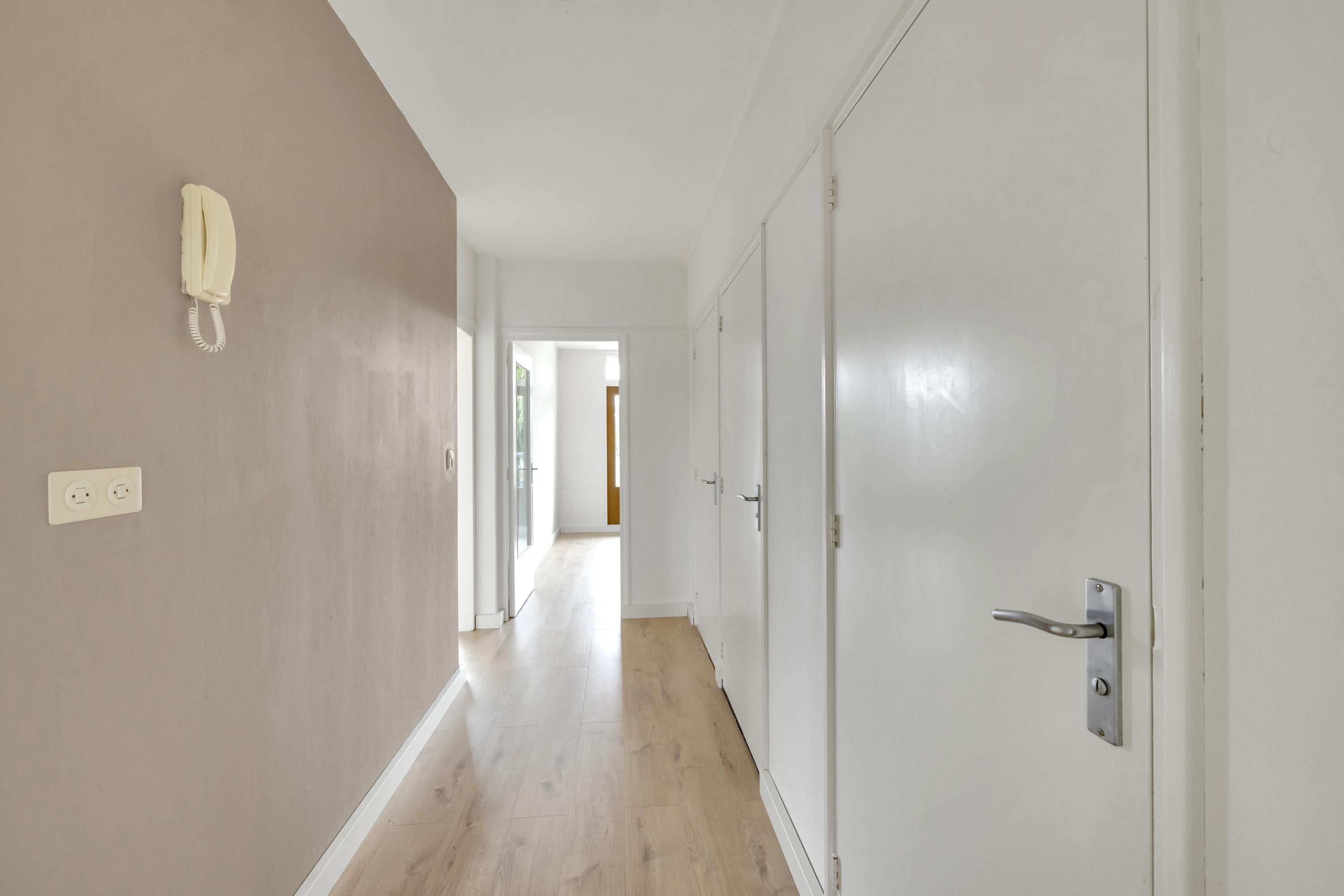 Aangekomen bij de entree van het complex, gelegen in de hoek van de voorzijde van het gebouw, betreed je de nette, gezamenlijke entree met de brievenbussen en het bellentableau die toegang geeft tot de centrale hal. Vanuit de hal bereik je eenvoudig het trappenhuis, de liften en de kelderruimte.