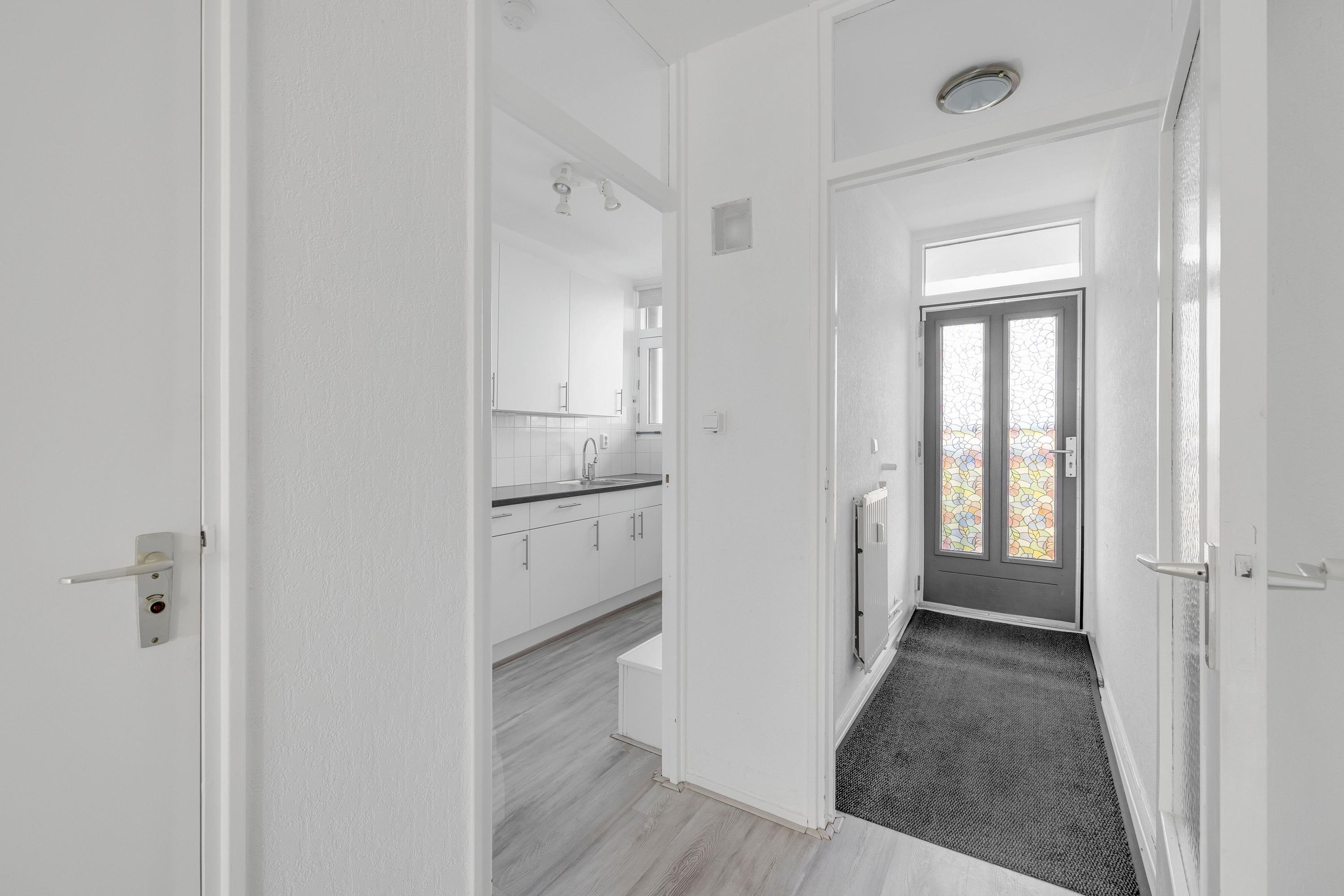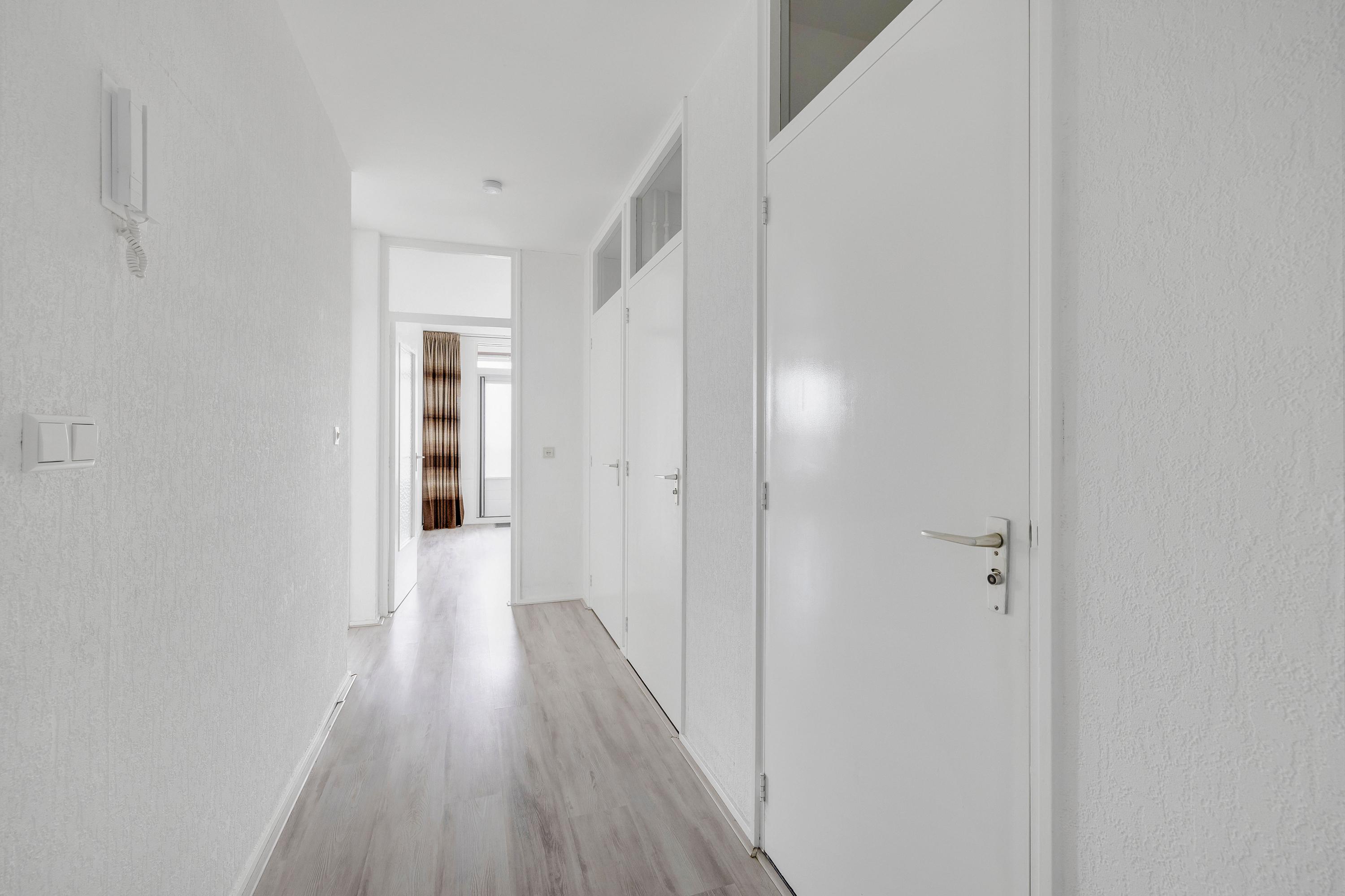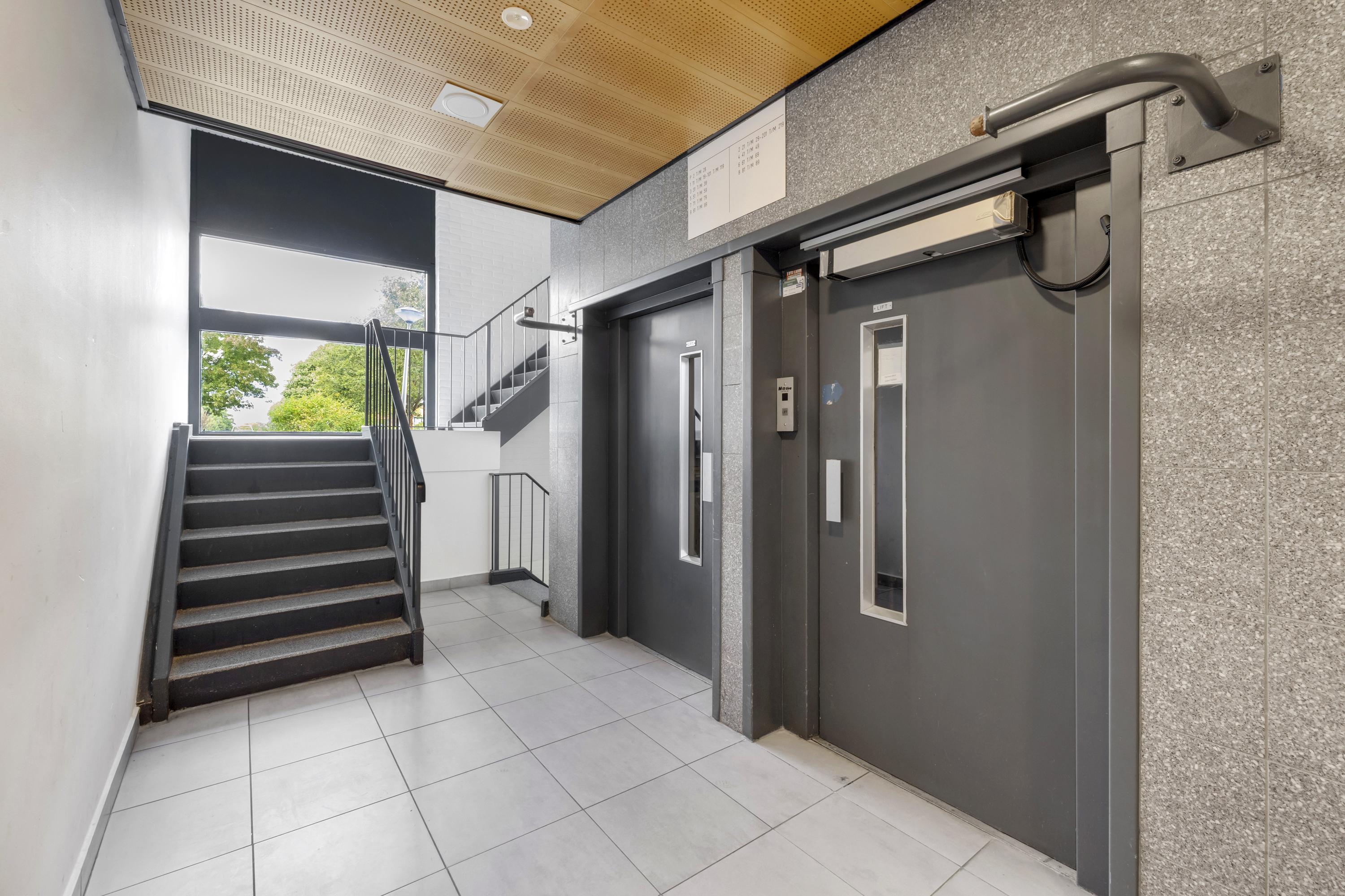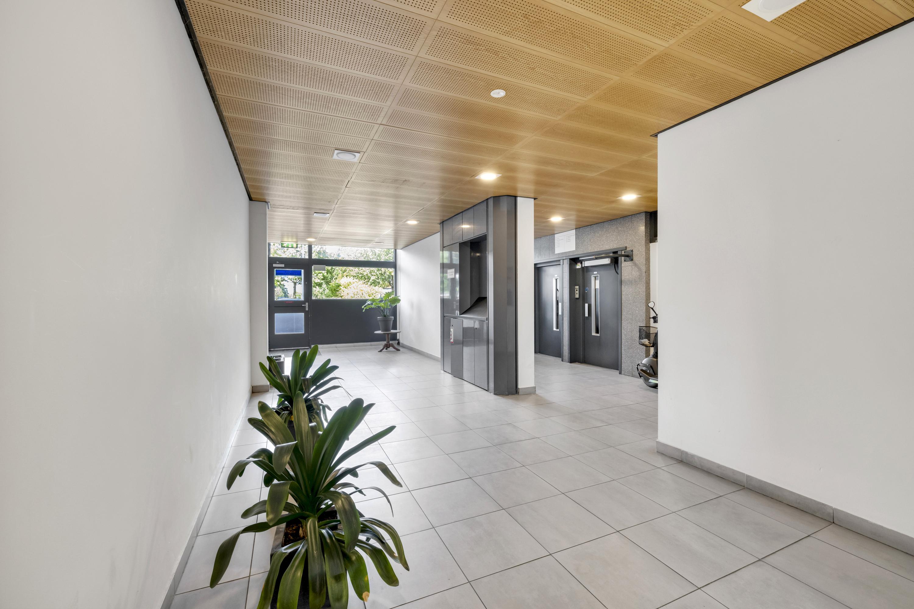 Aangekomen bij de entree van het complex, gelegen in de hoek van de voorzijde van het gebouw, betreed je de nette, gezamenlijke entree met de brievenbussen en het bellentableau die toegang geeft tot de centrale hal. Vanuit de hal bereik je eenvoudig het trappenhuis, de liften en de kelderruimte.