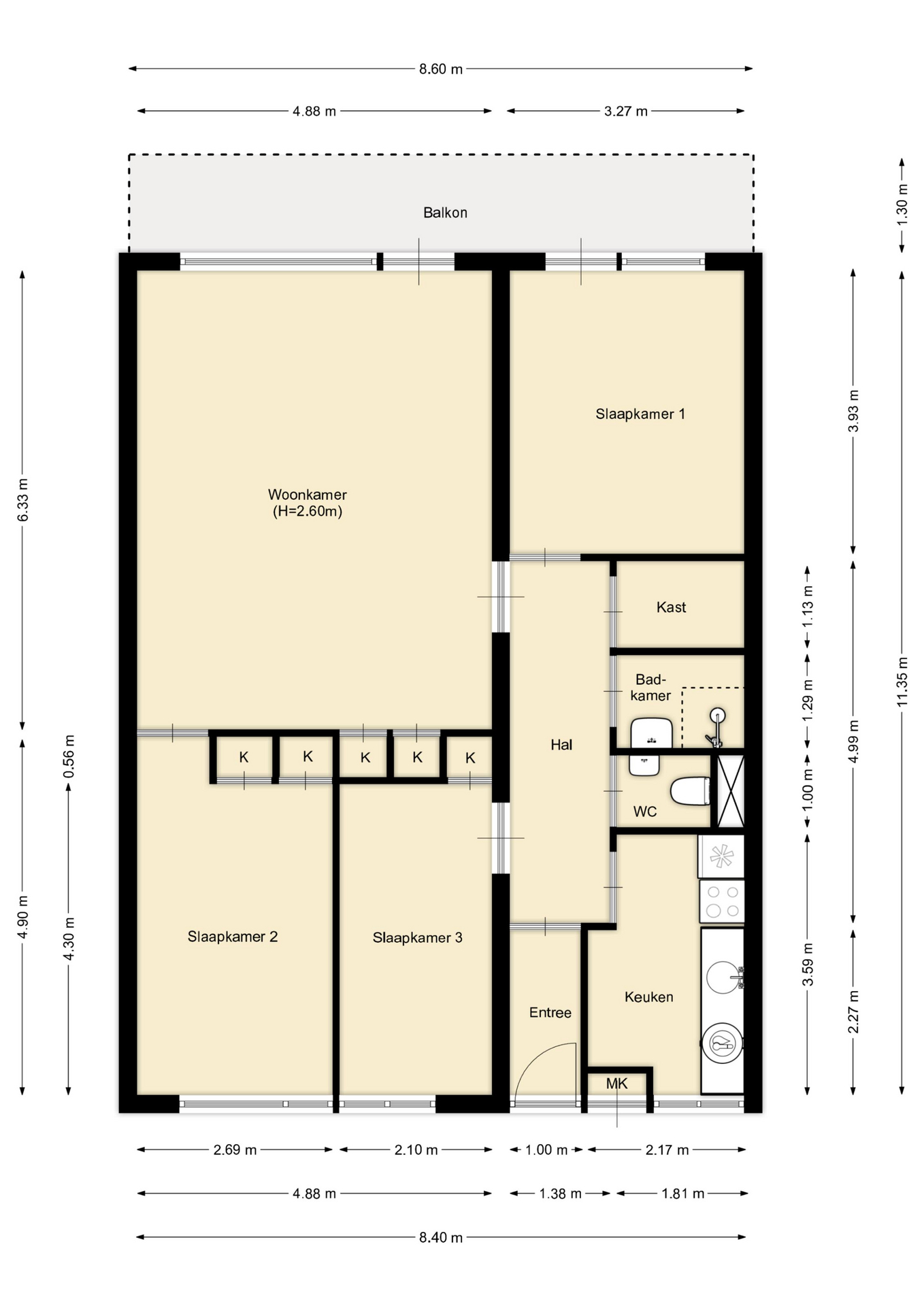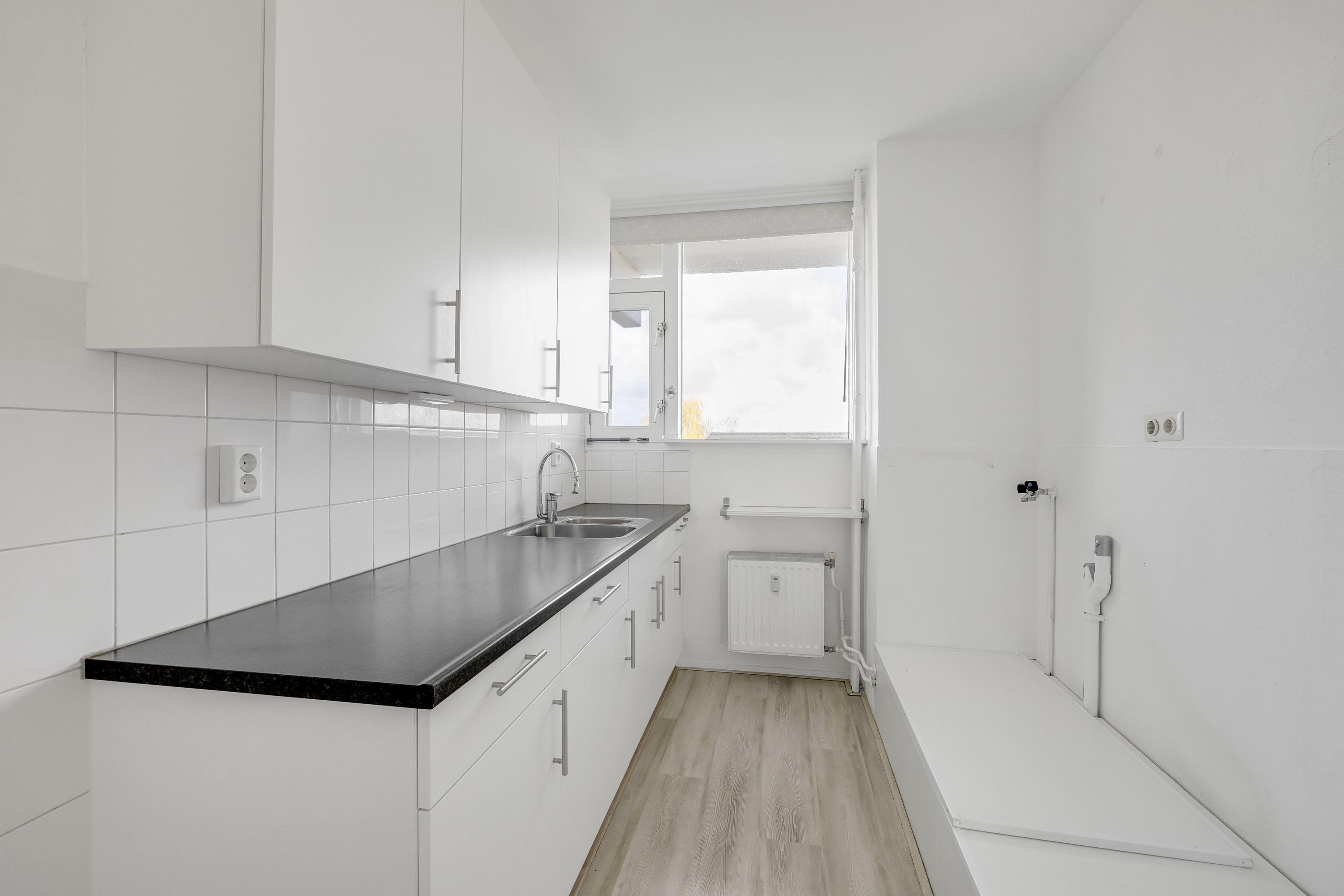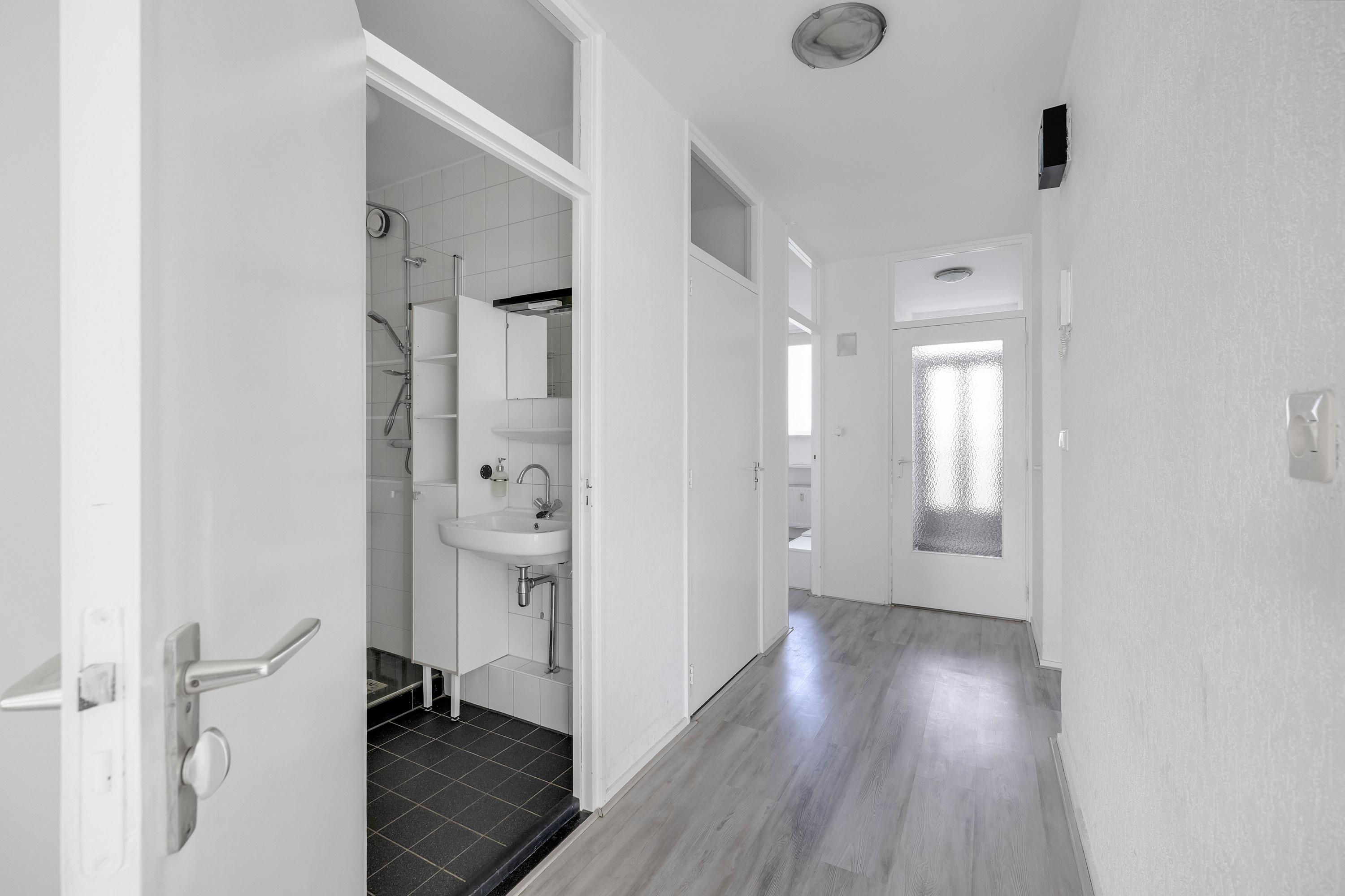 Je betreedt dit appartement via de galerij van het complex, waarbij je direct naast de voordeur de meterkast vindt. Vanuit de entree stap je de hal van het appartement binnen, waar direct aan de voorzijde de keuken is gesitueerd. Deze is voorzien van voldoende werk- en opbergruimte. Ook liggen aan de voorzijde twee slaapkamers met vaste kastruimten, ook ideaal om te gebruiken als kastenkamer, werkkamer of hobbyruimte. Verder bevinden zich in de hal de ruime vaste kast met de elektrische boiler, toiletruimte en de badkamer, voorzien van een inloopdouche, wastafel en designradiator. De woonkamer ligt aan de achterzijde van het appartement en is dankzij de grote raampartijen heerlijk licht. De woonkamer heeft vaste kastruimte en je hebt direct toegang tot het zonnige balkon van 11 m² op het zuidoosten, waar je optimaal kunt genieten van de middag- en avondzon. Ook ligt aan de achterzijde de 3e slaapkamer, eveneens voorzien van grote ramen en een deur naar het balkon, waardoor ook hier veel natuurlijk licht binnenkomt.