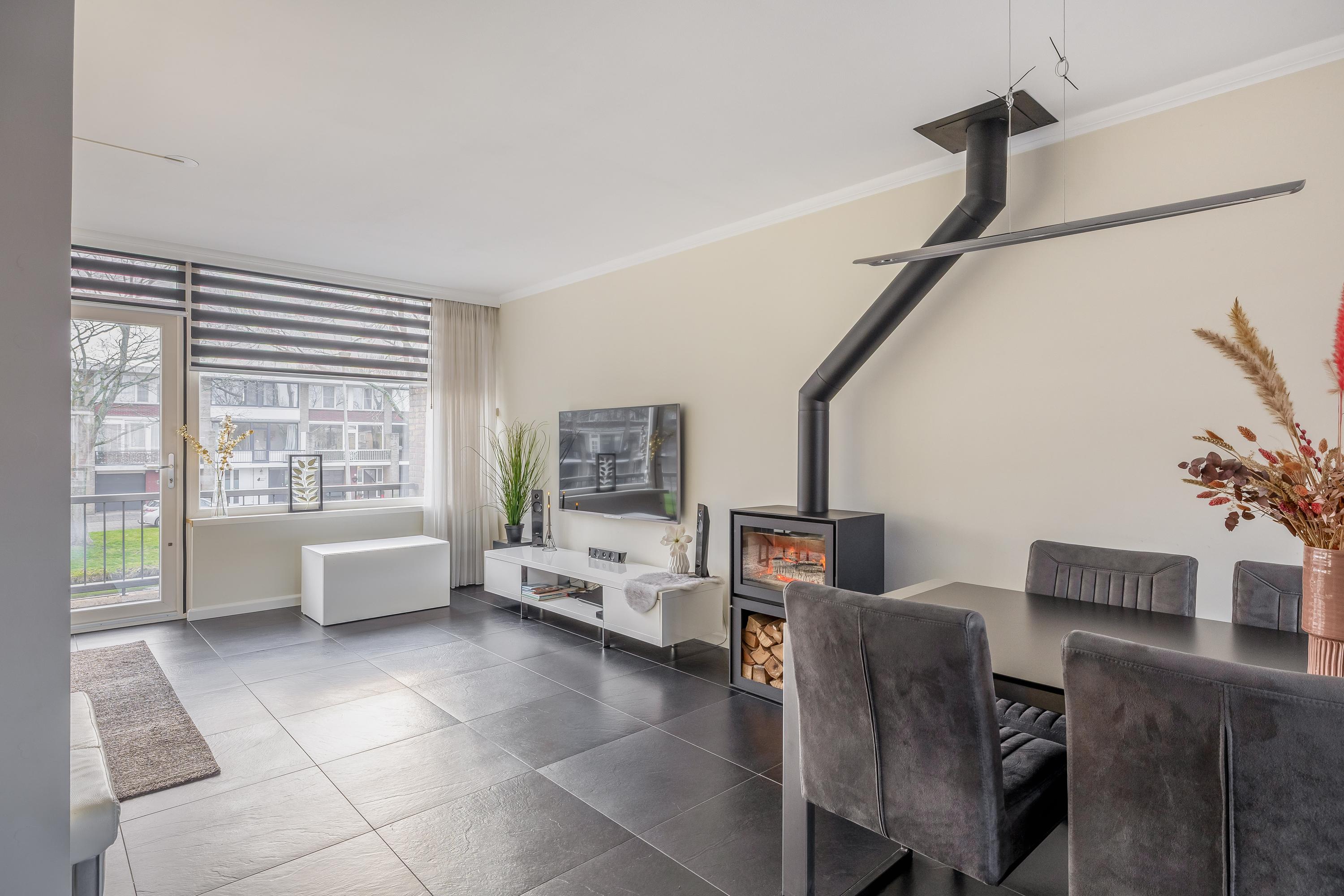 Via de trap bereik je de 1e verdieping. Op de overloop bevindt zich de modern afgewerkte toiletruimte, volledig betegeld en voorzien van een hangend closet en fontein. De woonkamer bevindt zich aan de voorzijde van de woning en is sfeervol en comfortabel ingericht en is voorzien van een houtkachel en airconditioning. Hier bevindt zich ook een deur die toegang geeft tot een balkon op het zuidoosten, dit balkon is voorzien van elektrische zonwering en hier bevindt zich de unit van de airconditioning. Aangrenzend aan de woonkamer bevindt zich de open keuken, uitgerust met diverse inbouwapparatuur, waaronder een keramische kookplaat, afzuigkap, koel-vriescombinatie, combimagnetron en vaatwasser. Via de keuken is er toegang tot het balkon aan de achterzijde, via dit balkon is de achtertuin bereikbaar doormiddel van een trap. Ook bevindt hier een kast met de opstelling van de cv-combiketel (Remeha 2017). De vloer is afgewerkt met keramische tegels en de gehele verdieping is voorzien van vloerverwarming, wat zorgt voor een aangenaam wooncomfort.