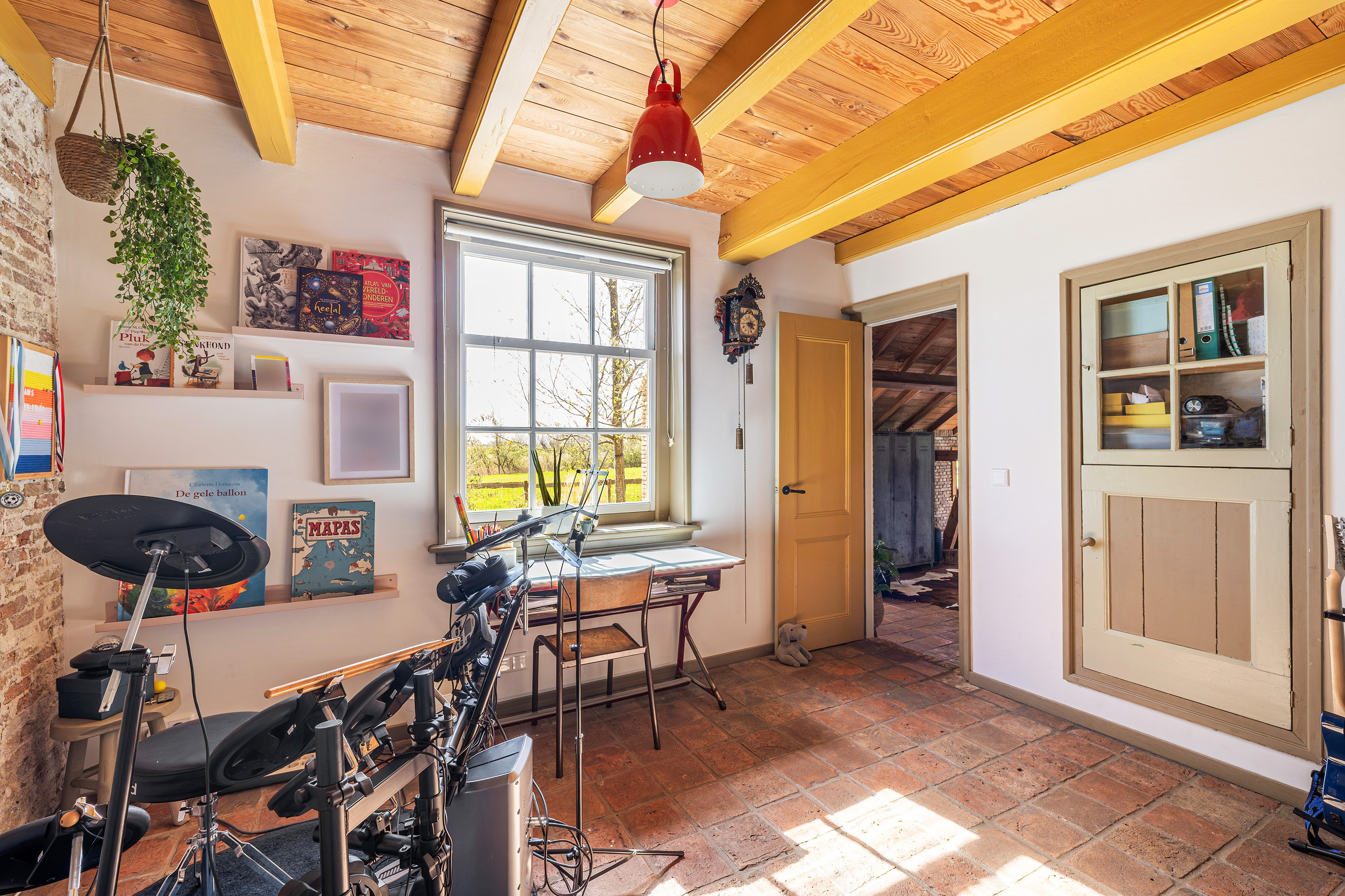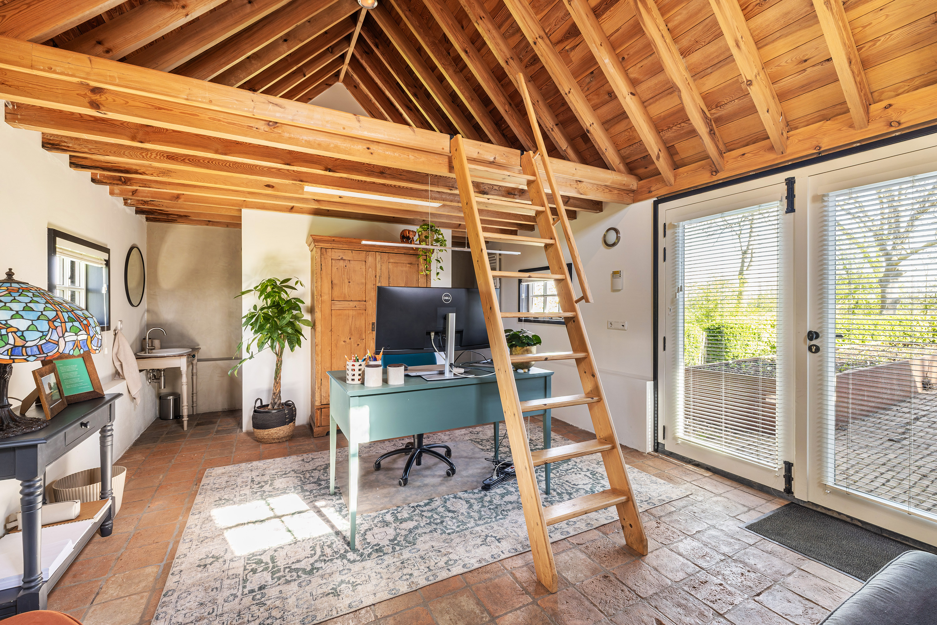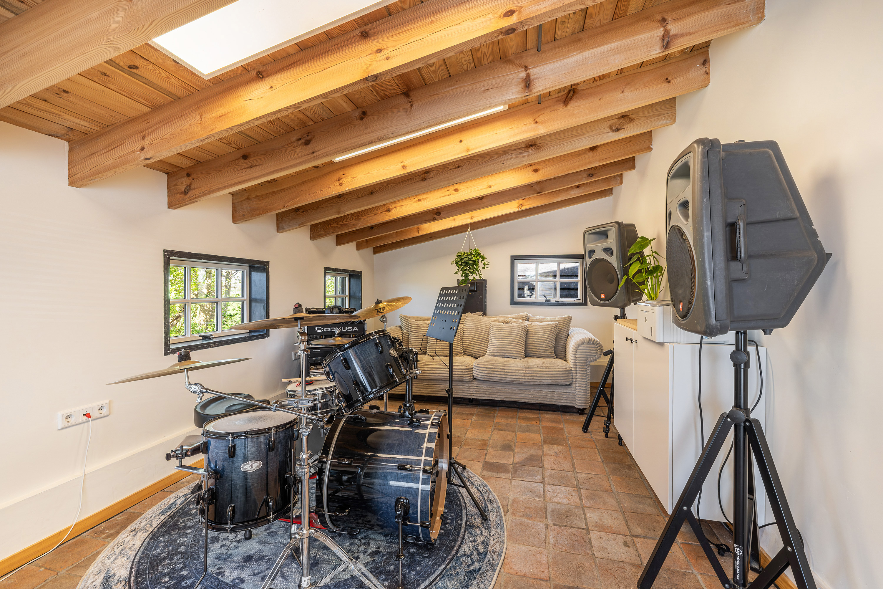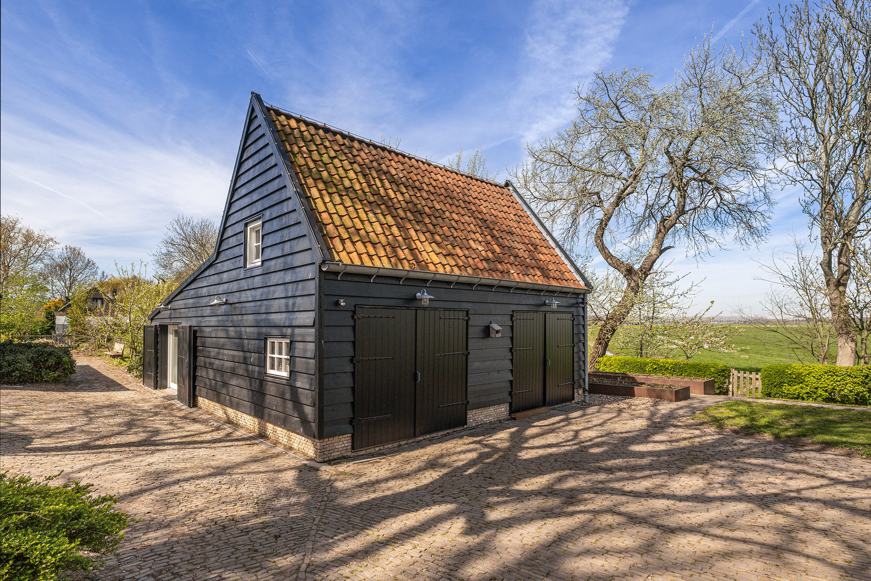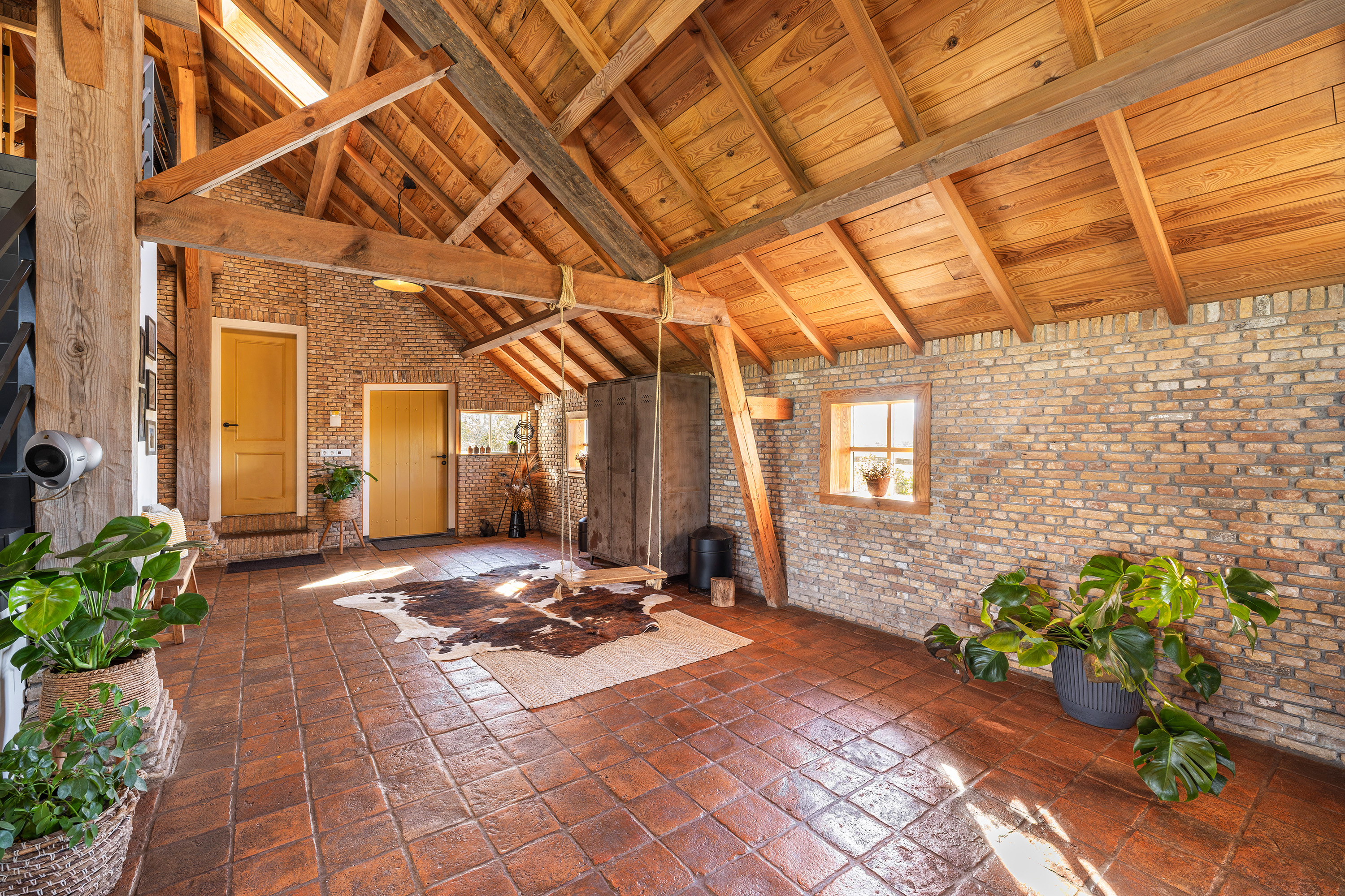 Achter op het erf staat de volledig geïsoleerde "zwingelschuur". Momenteel ingericht met eigen sanitair en voorzien van vloerverwarming/koeling en een vide, is dit de perfecte plek voor een gastenverblijf of praktijkruimte. Dankzij de openslaande deuren voelt het hier licht en ruim, met een directe verbinding naar buiten.