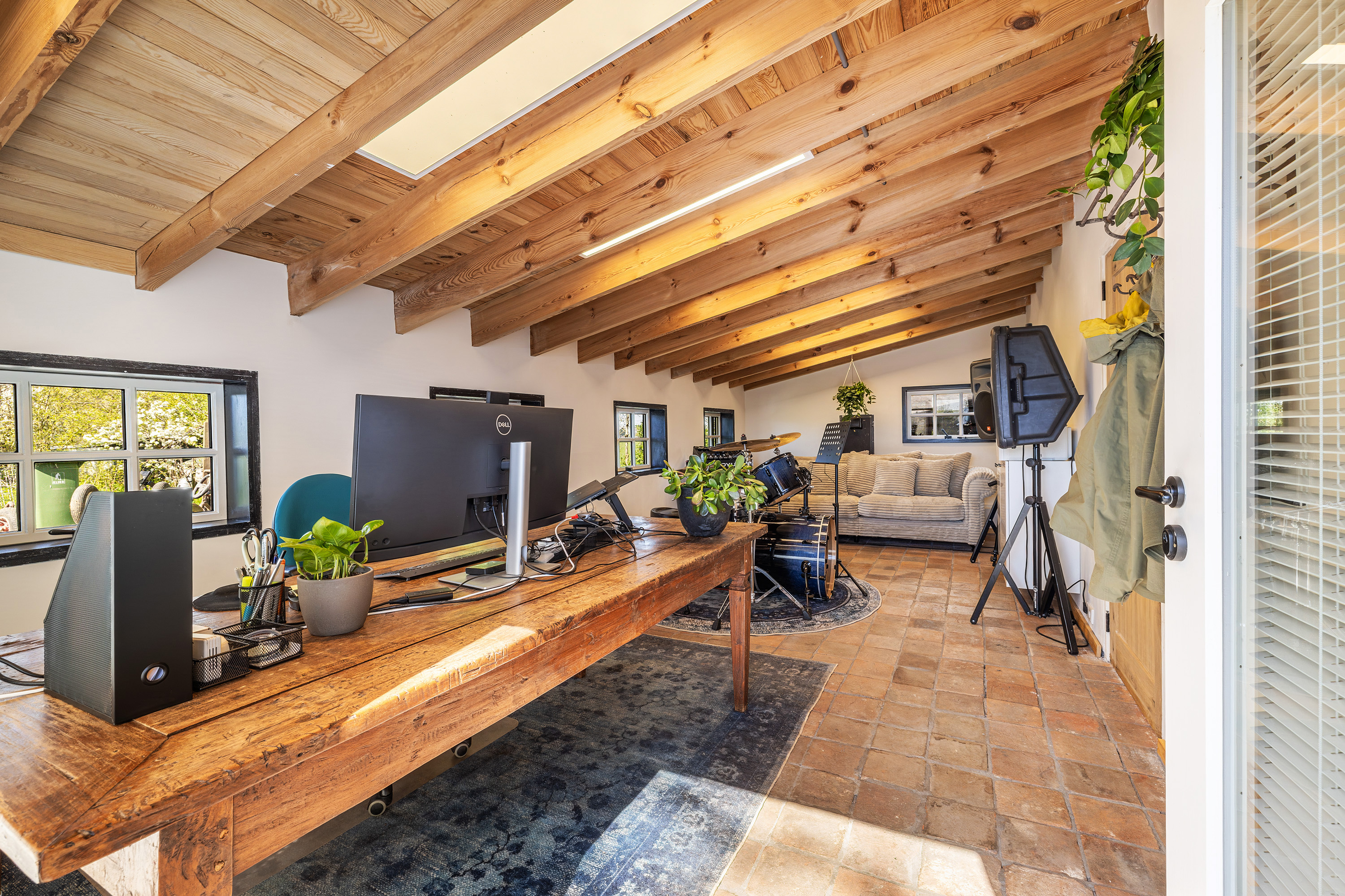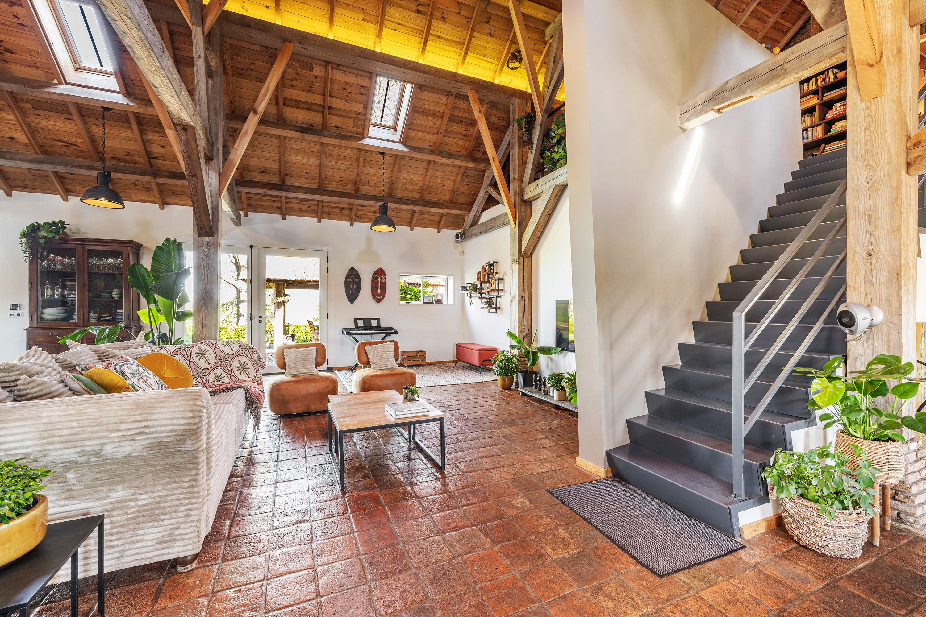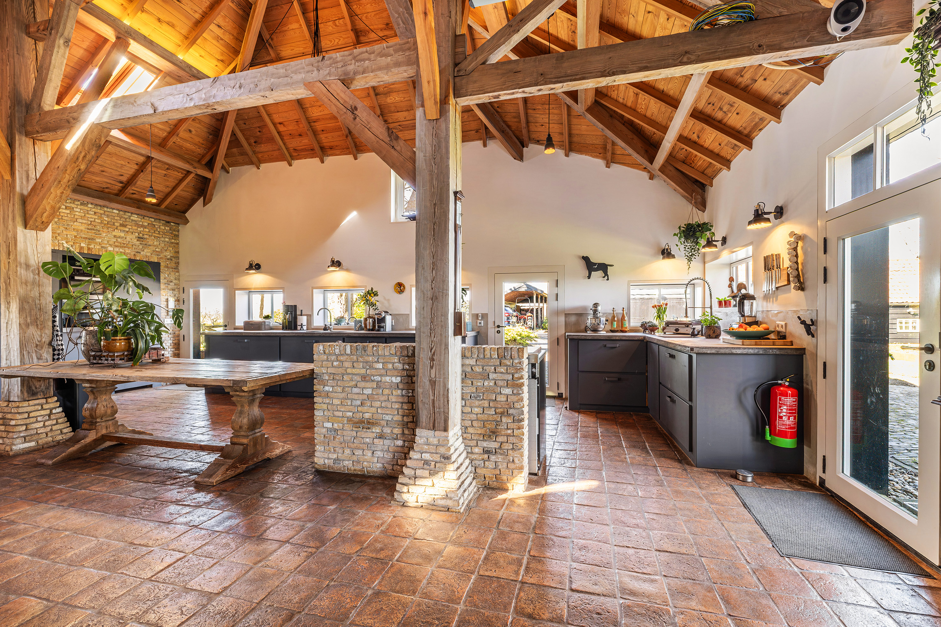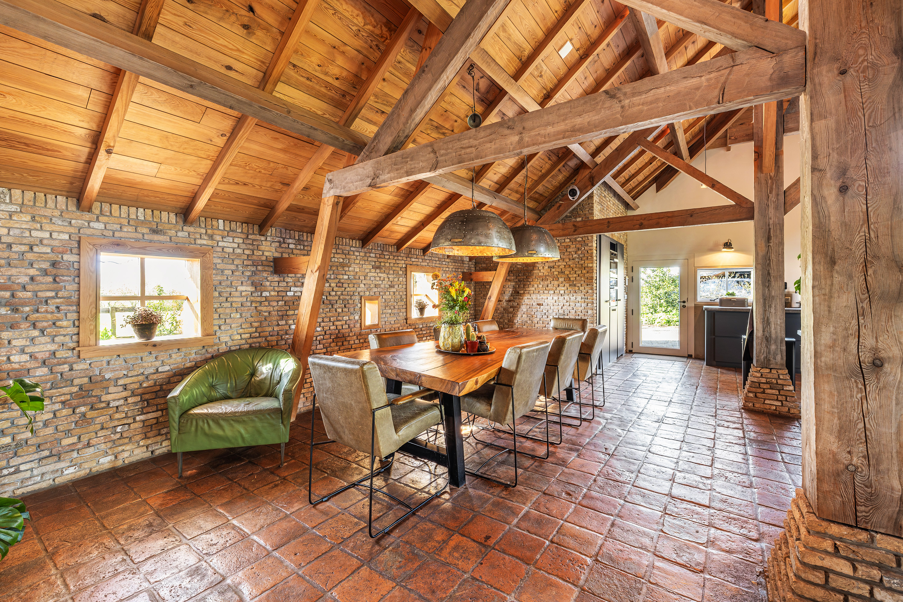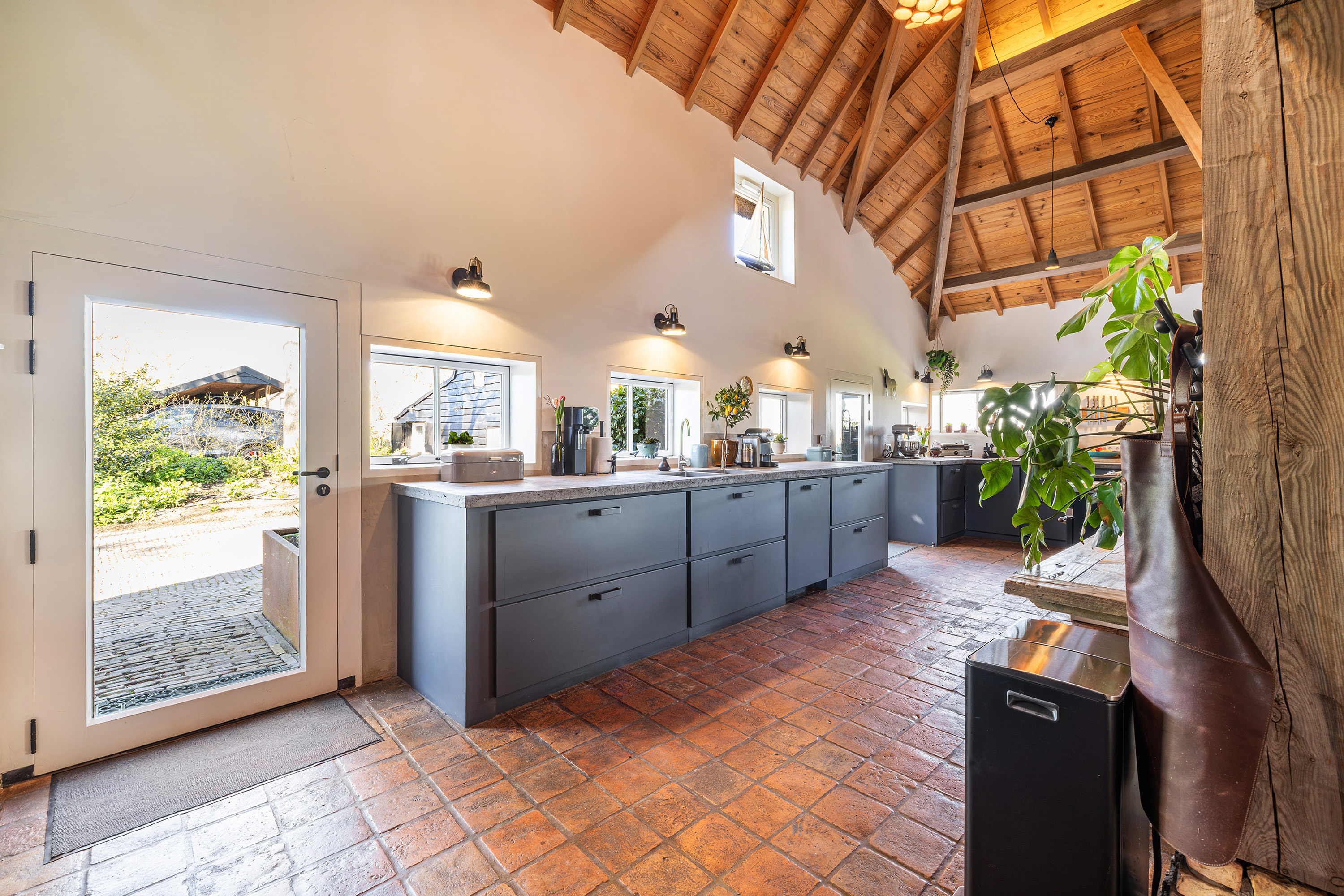 Achter op het erf staat de volledig geïsoleerde "zwingelschuur". Momenteel ingericht met eigen sanitair en voorzien van vloerverwarming/koeling en een vide, is dit de perfecte plek voor een gastenverblijf of praktijkruimte. Dankzij de openslaande deuren voelt het hier licht en ruim, met een directe verbinding naar buiten.