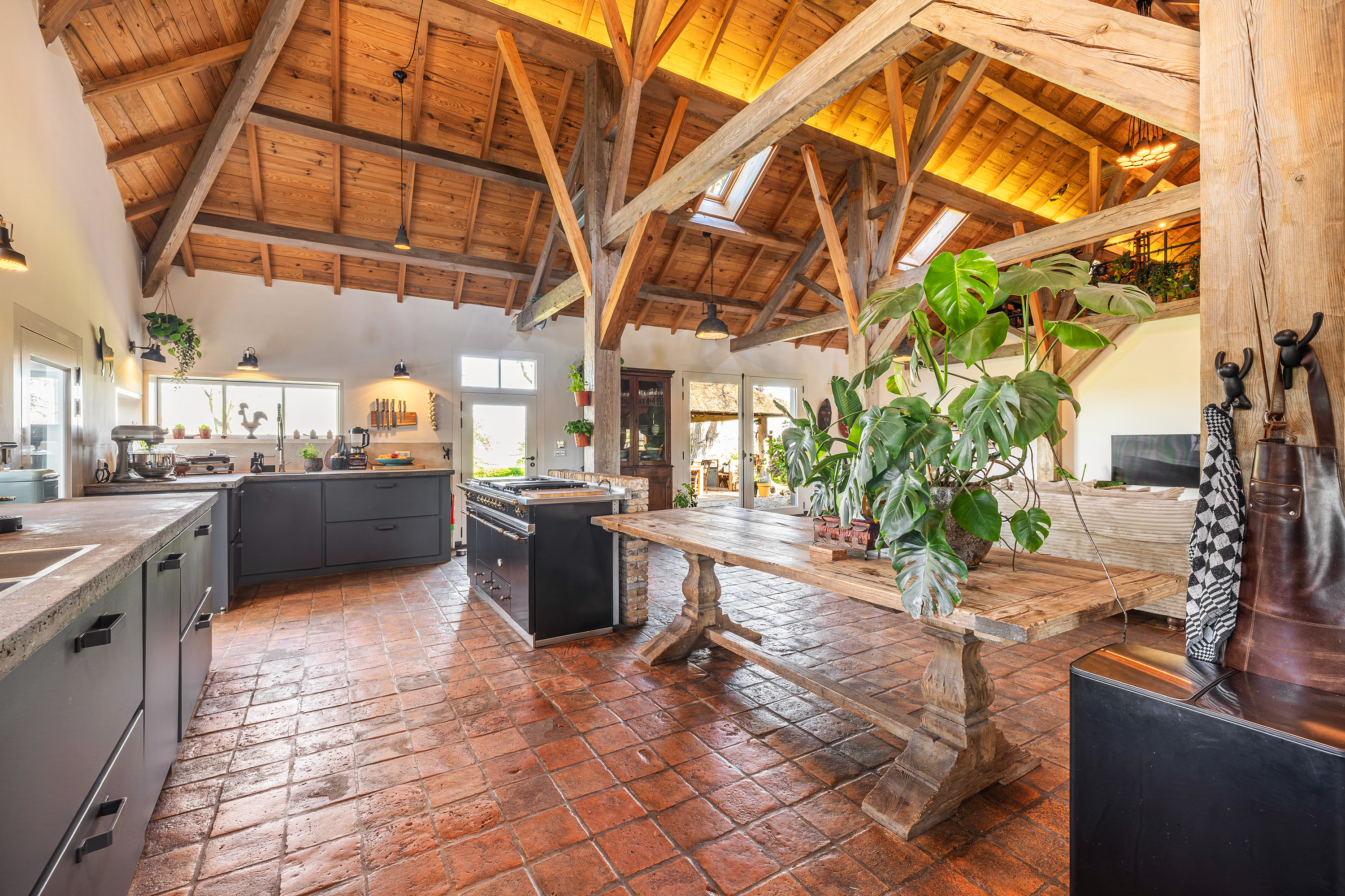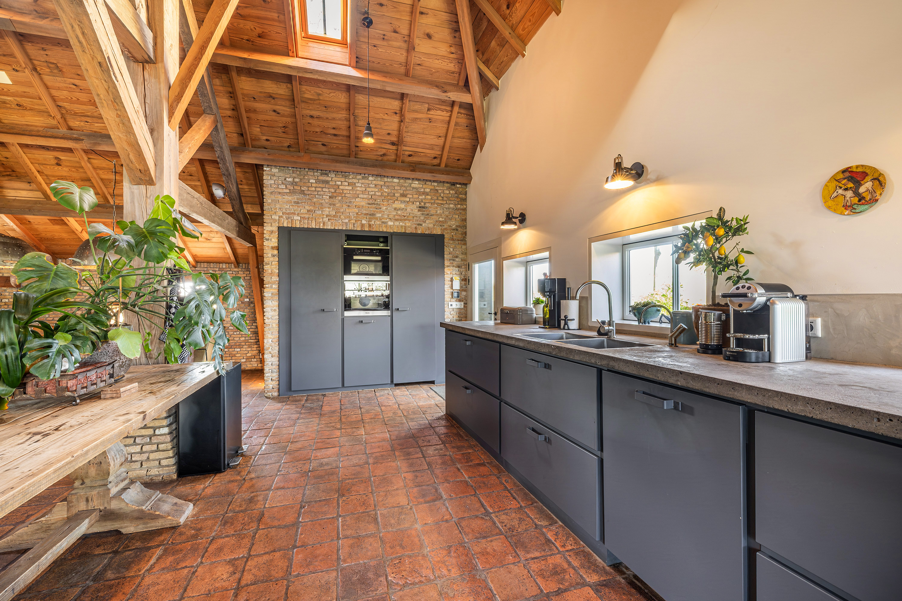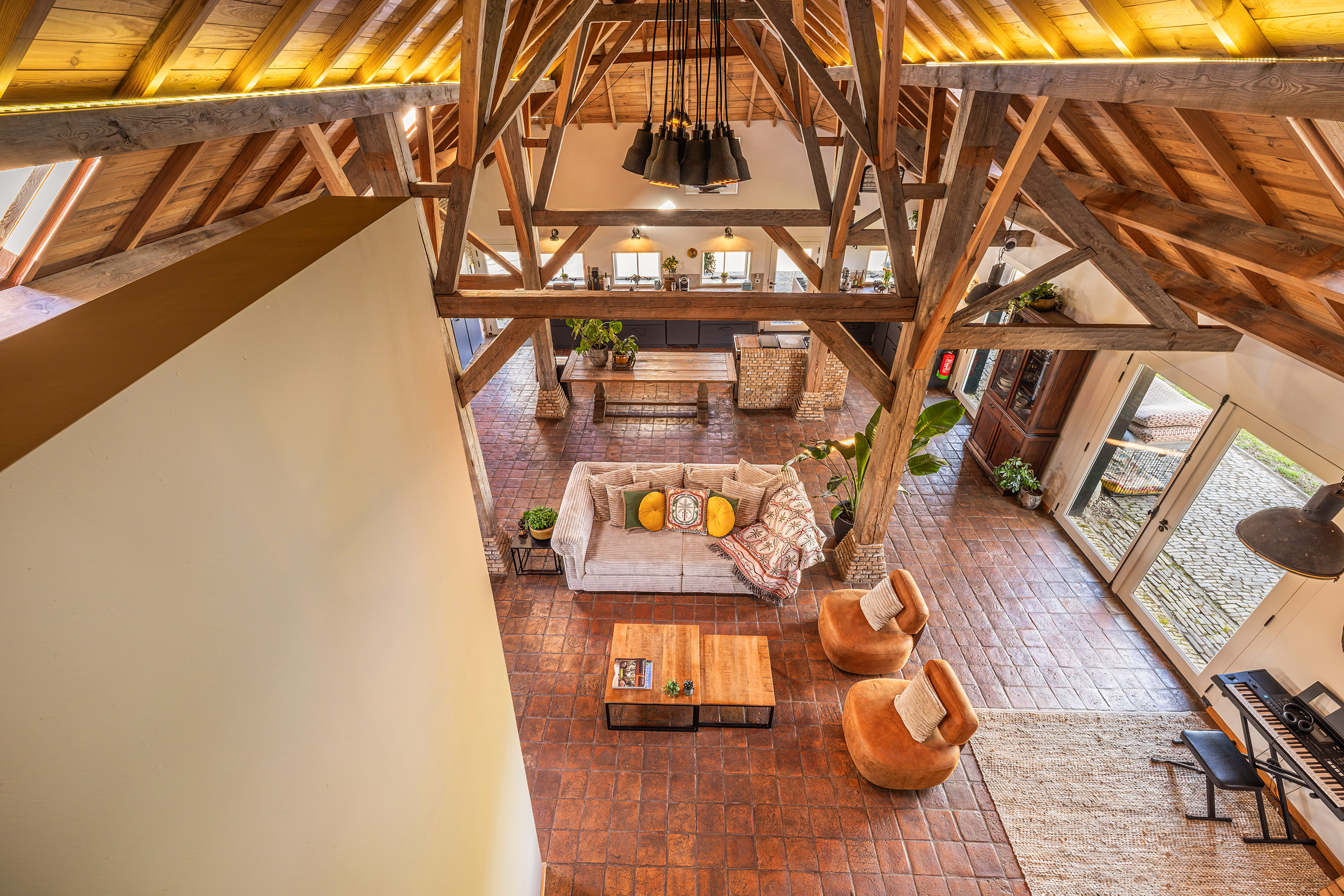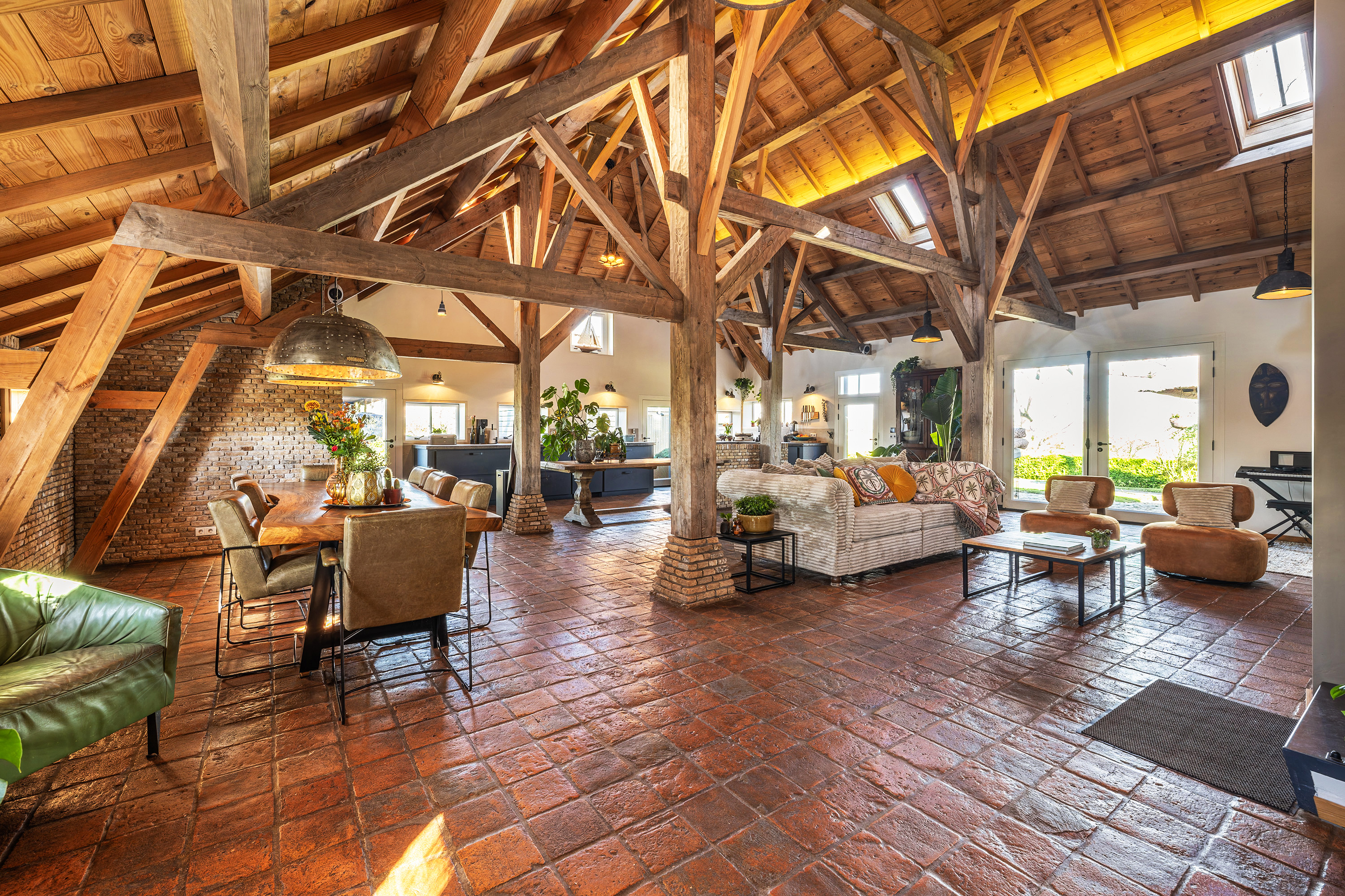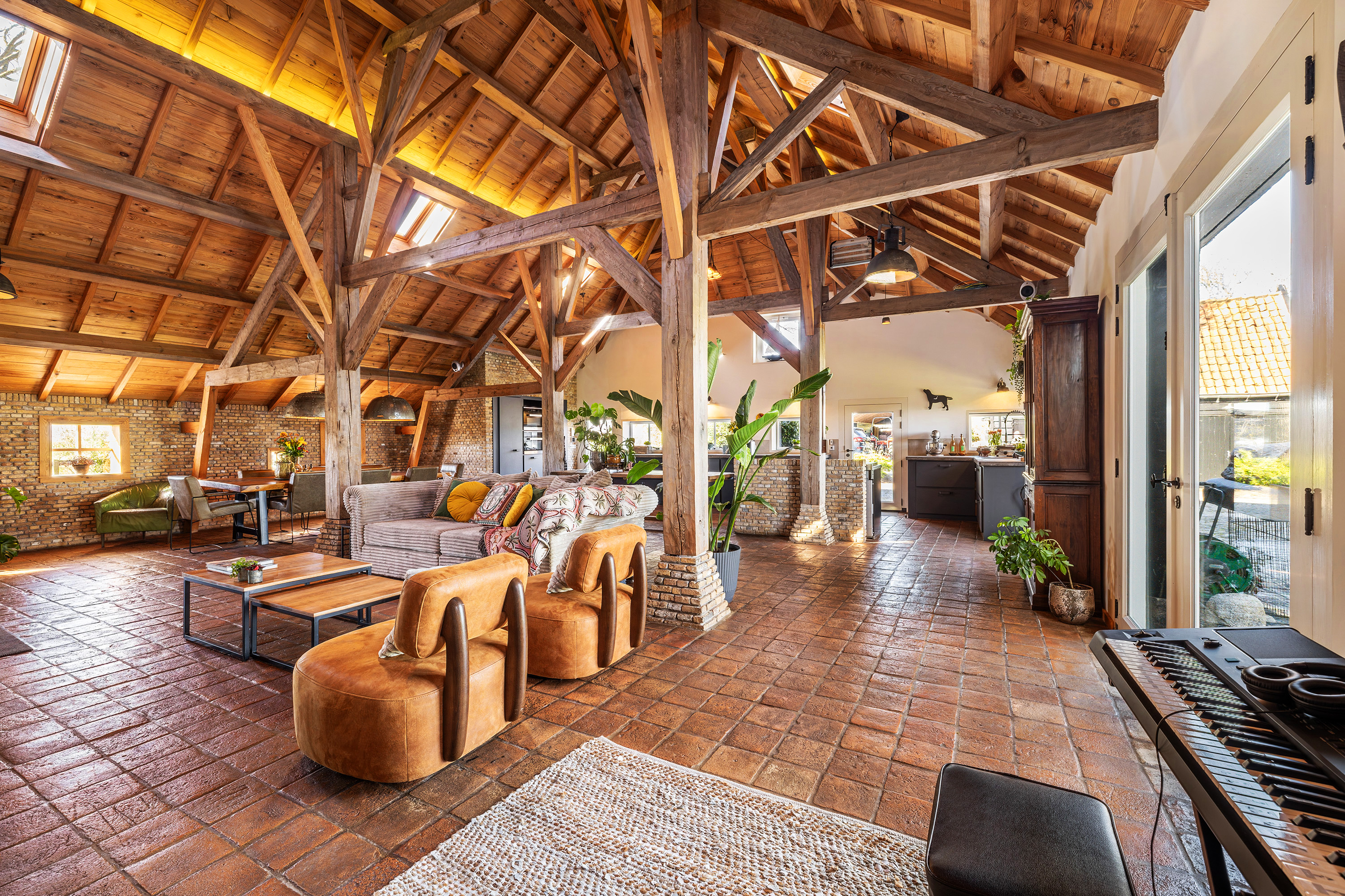 Achter op het erf staat de volledig geïsoleerde "zwingelschuur". Momenteel ingericht met eigen sanitair en voorzien van vloerverwarming/koeling en een vide, is dit de perfecte plek voor een gastenverblijf of praktijkruimte. Dankzij de openslaande deuren voelt het hier licht en ruim, met een directe verbinding naar buiten.