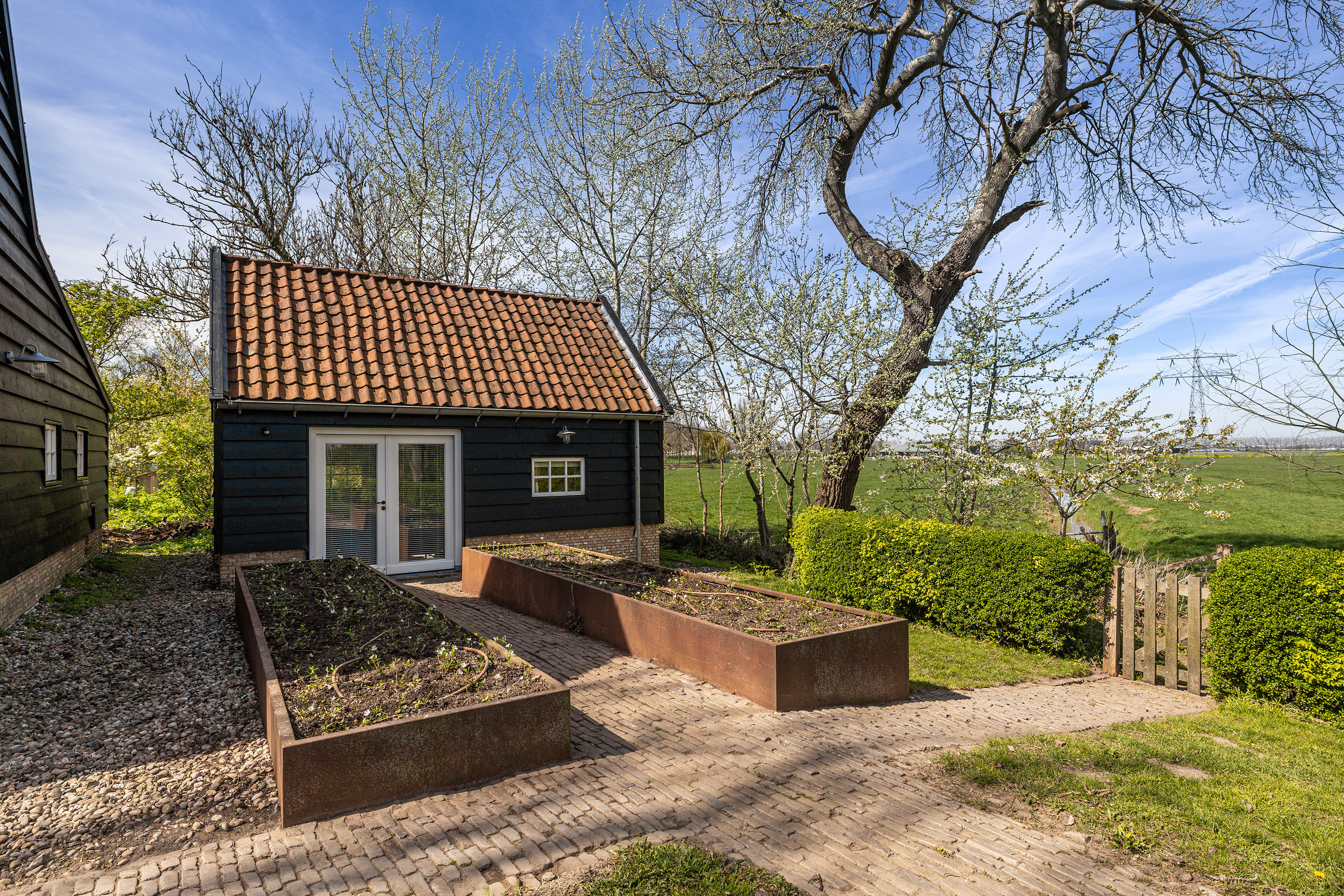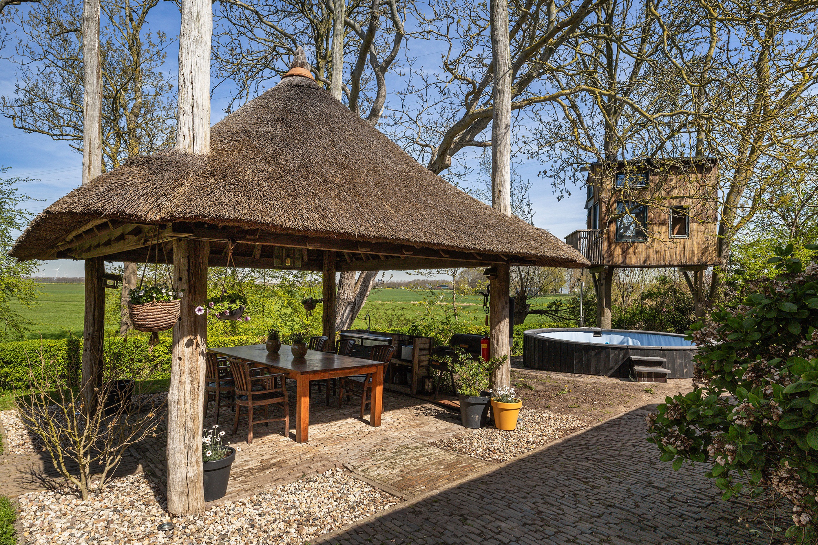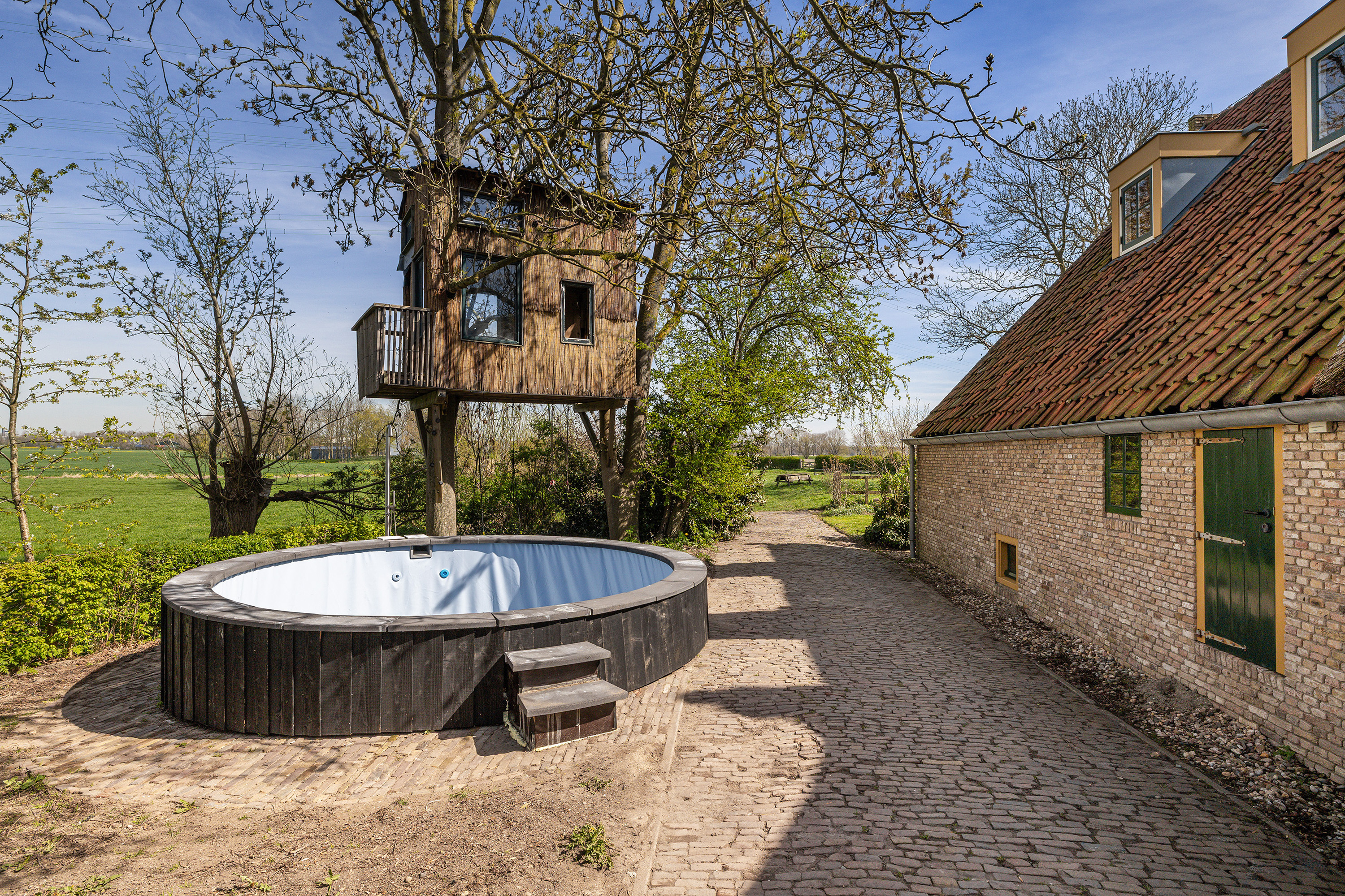 Het erf rondom de woning is met zorg ingericht en ademt rust en vrijheid. Op warme dagen vormt het verwarmde zwembad met een diepte van 1,5 meter een heerlijke plek om af te koelen, terwijl het rietgedekte prieel uitnodigt tot lange avonden buiten met vrij uitzicht over uitgestrekte polders. De tuin is volledig omsloten en bereikbaar via een elektrische houten poort, wat zorgt voor privacy en comfort. Voor kinderen is er bovendien een speelrijke boomhut die het erf een speels en levendig karakter geeft en het geheel nog meer tot een echt familieparadijs maakt. Op eigen terrein is er parkeergelegenheid voor meerdere auto's.