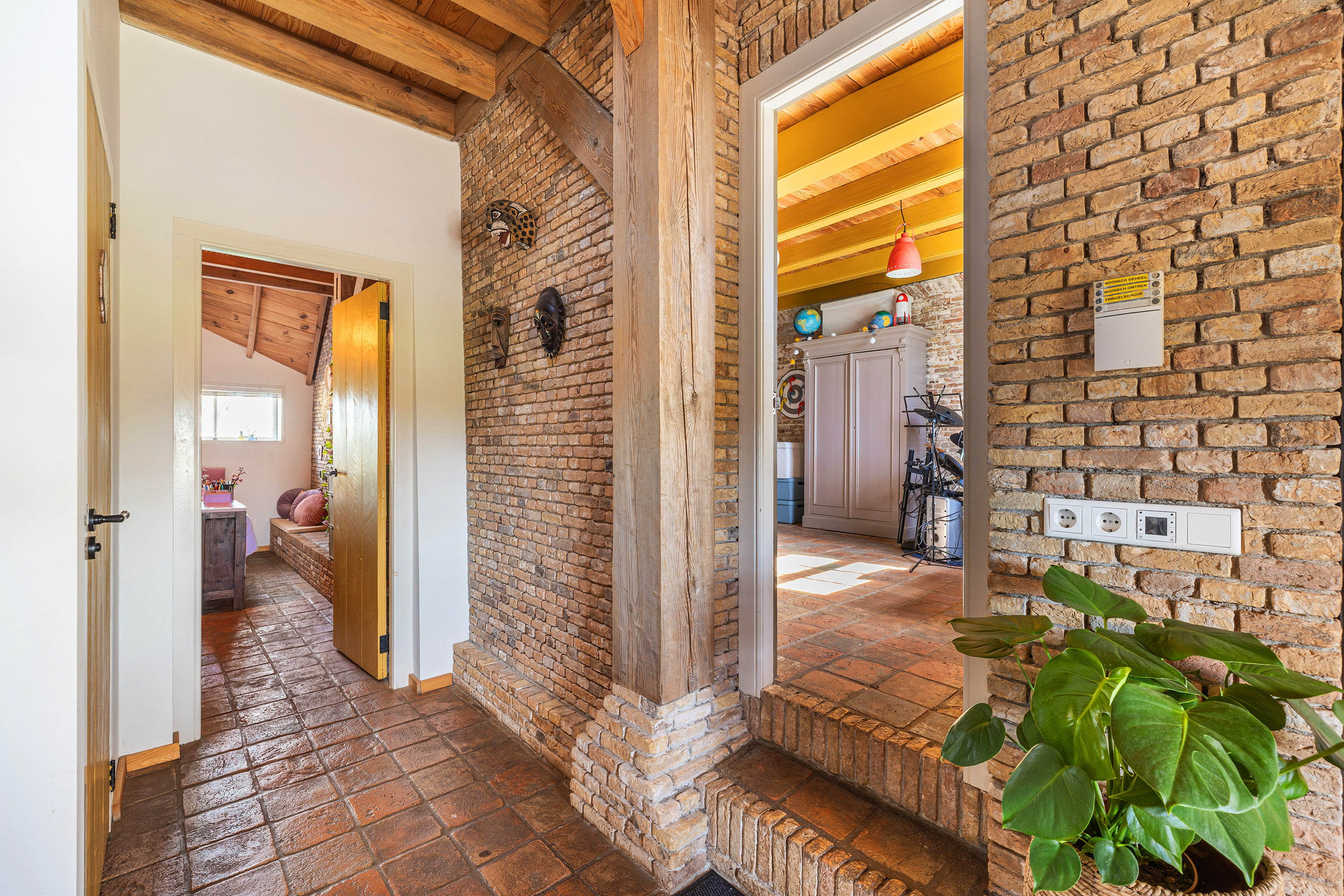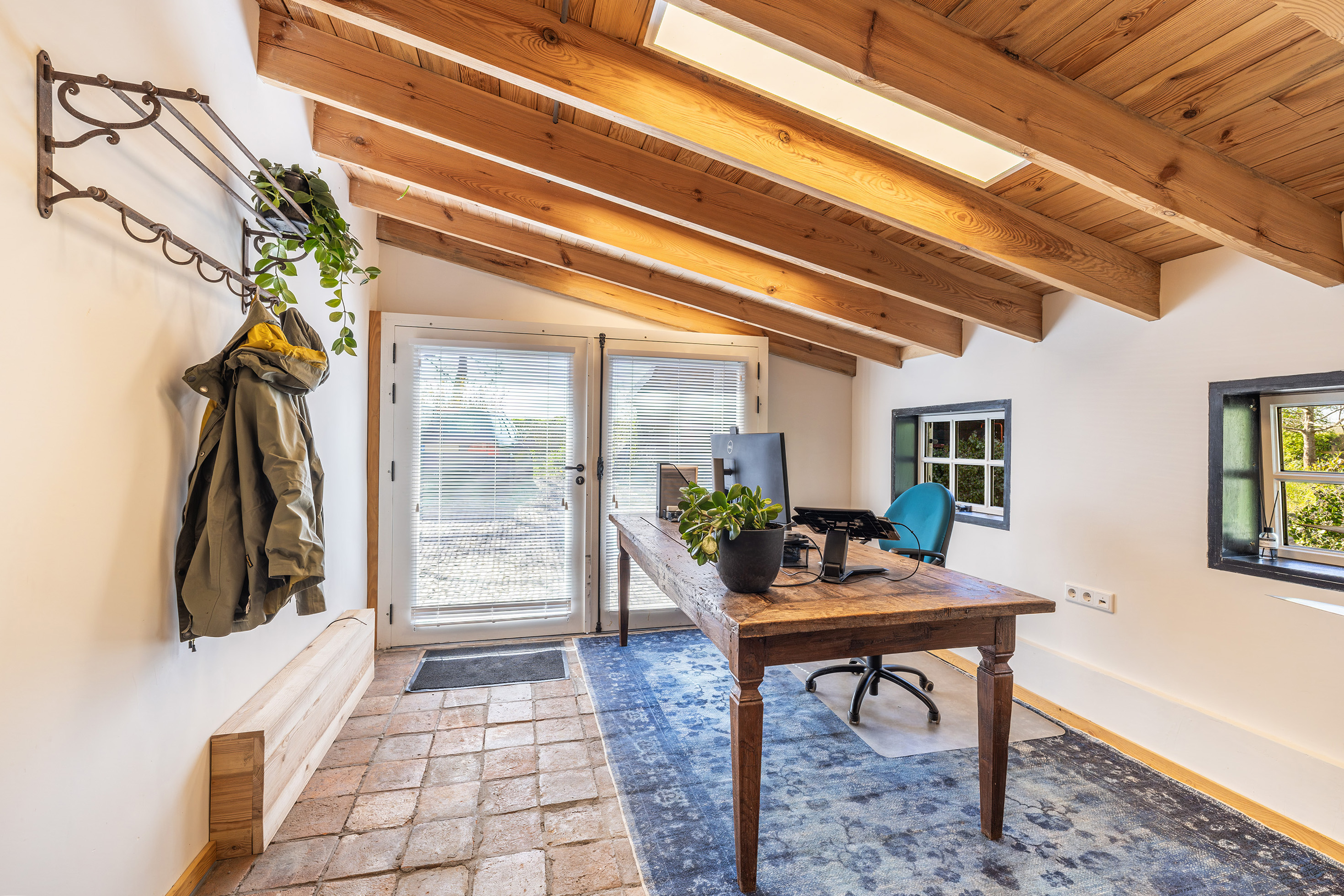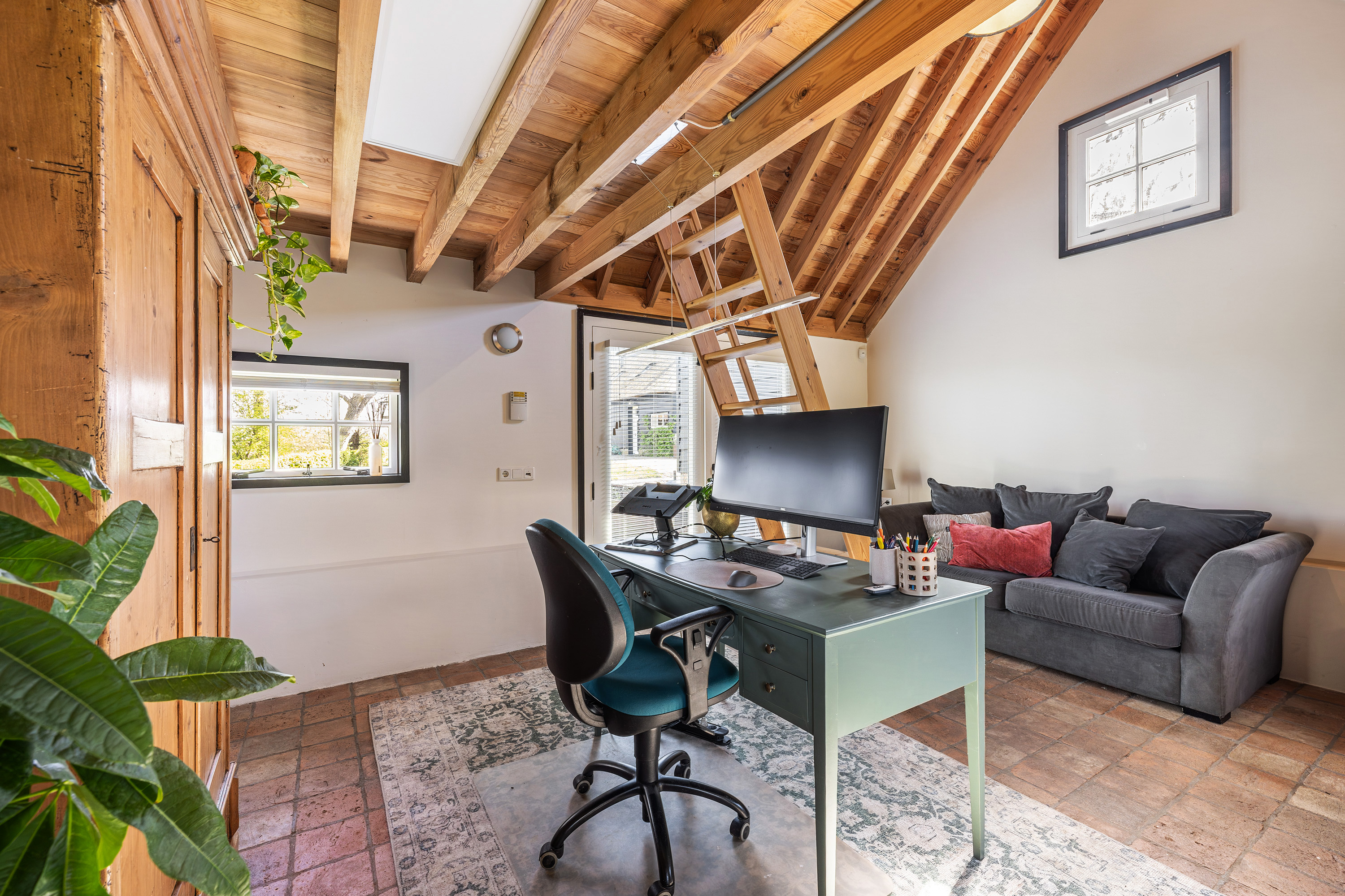 Naast de zwingelschuur staat de volledig geïsoleerde dubbele garage met kantoorruimte, ook voorzien van vloerverwarming/koeling. De garage beschikt over ruimte voor auto’s, opslag of hobby’s. Verder is er een boiler aanwezig en de omvormer van de zonnepanelen. Boven de garage vind je een royale bergvliering, bereikbaar via een stalen trap. Aangrenzend bevindt zich een kantoorruimte, ideaal voor wie vanuit huis werkt maar toch een duidelijke scheiding wil tussen privé en zakelijk. Deze ruimte biedt bovendien interessante mogelijkheden voor herontwikkeling naar woonruimte. Met de juiste aanpassingen kan hier een volwaardige (zelfstandige) woning worden gerealiseerd, voorzien van een woonkamer, keuken, badkamer en 1 à 2 slaapkamers (zolder). Ideaal voor bijvoorbeeld mantelzorg, gastenverblijf of verhuur (mits toestemming gemeente).