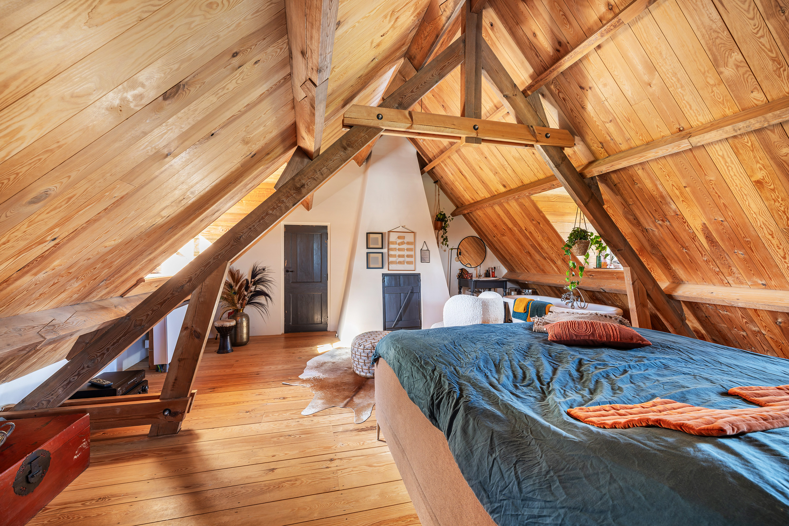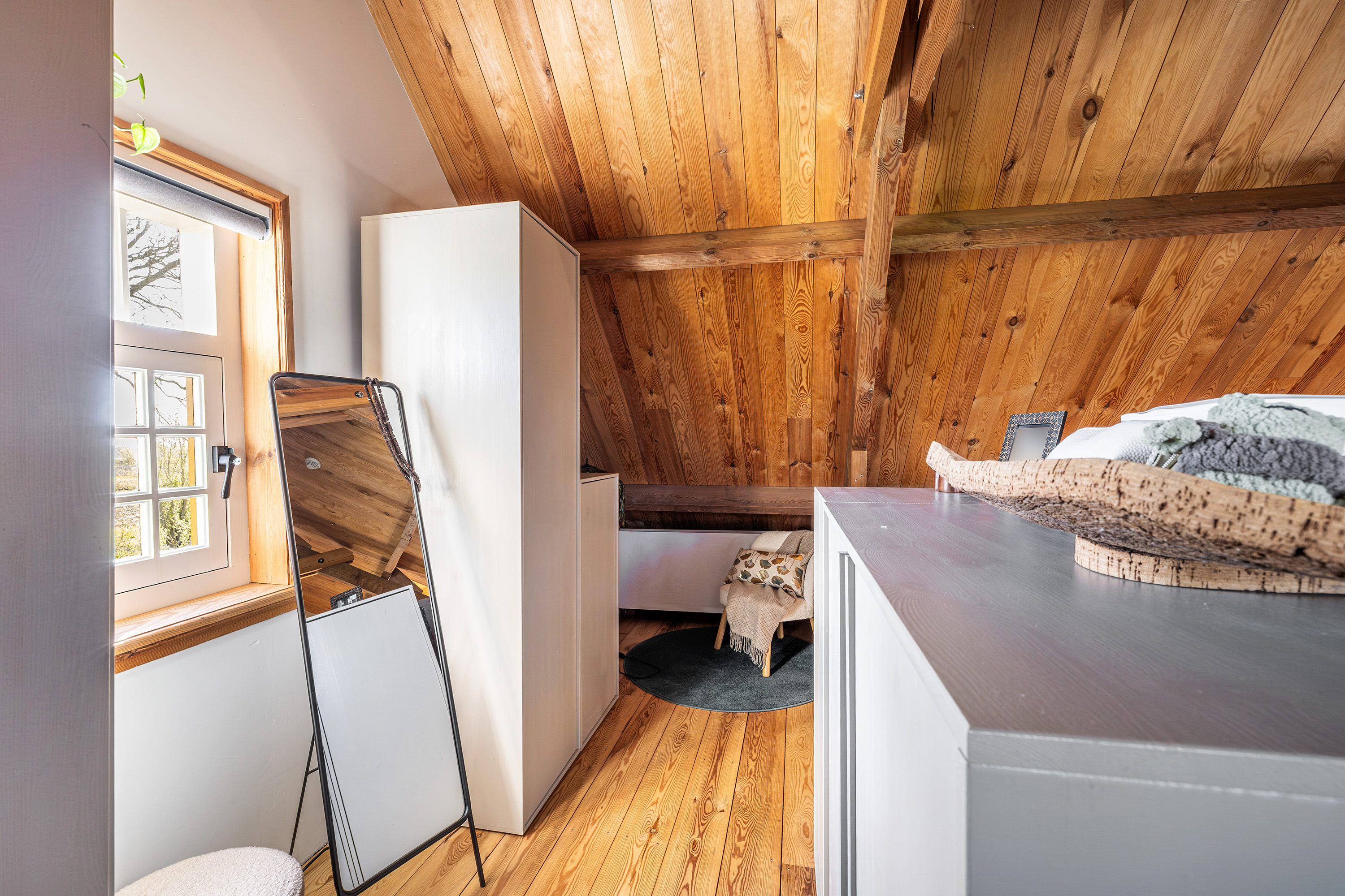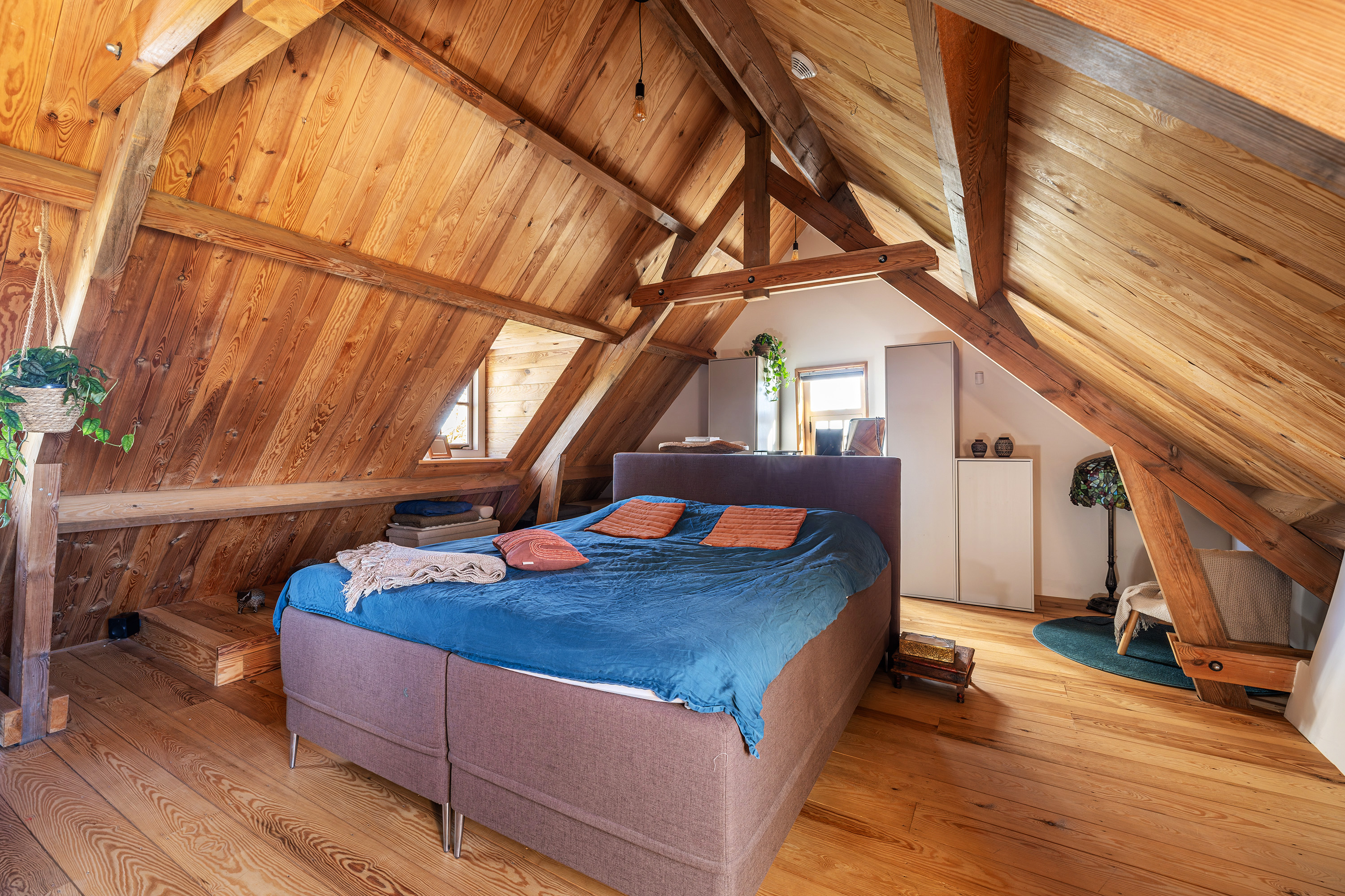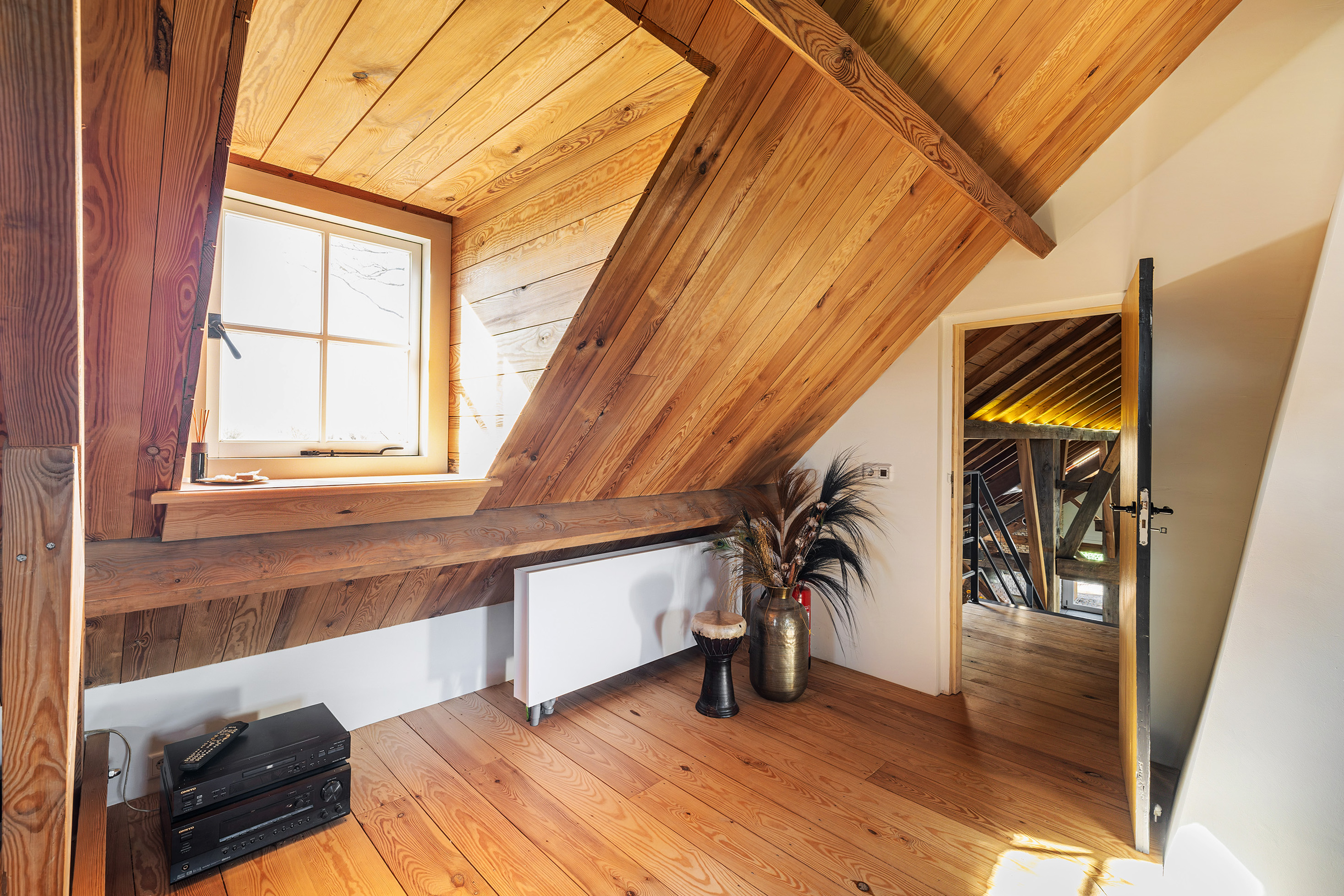 Via de vide bereik je door middel van een op maat gemaakte stalen trap de eerste verdieping. Hier bevindt zich een riante en sfeervolle slaapkamer met ligbad en 3 dakkapellen voor een fijne lichtinval. Verder heeft deze ruimte een prachtige houten kapconstructie met zichtbare gordingen en spanten.