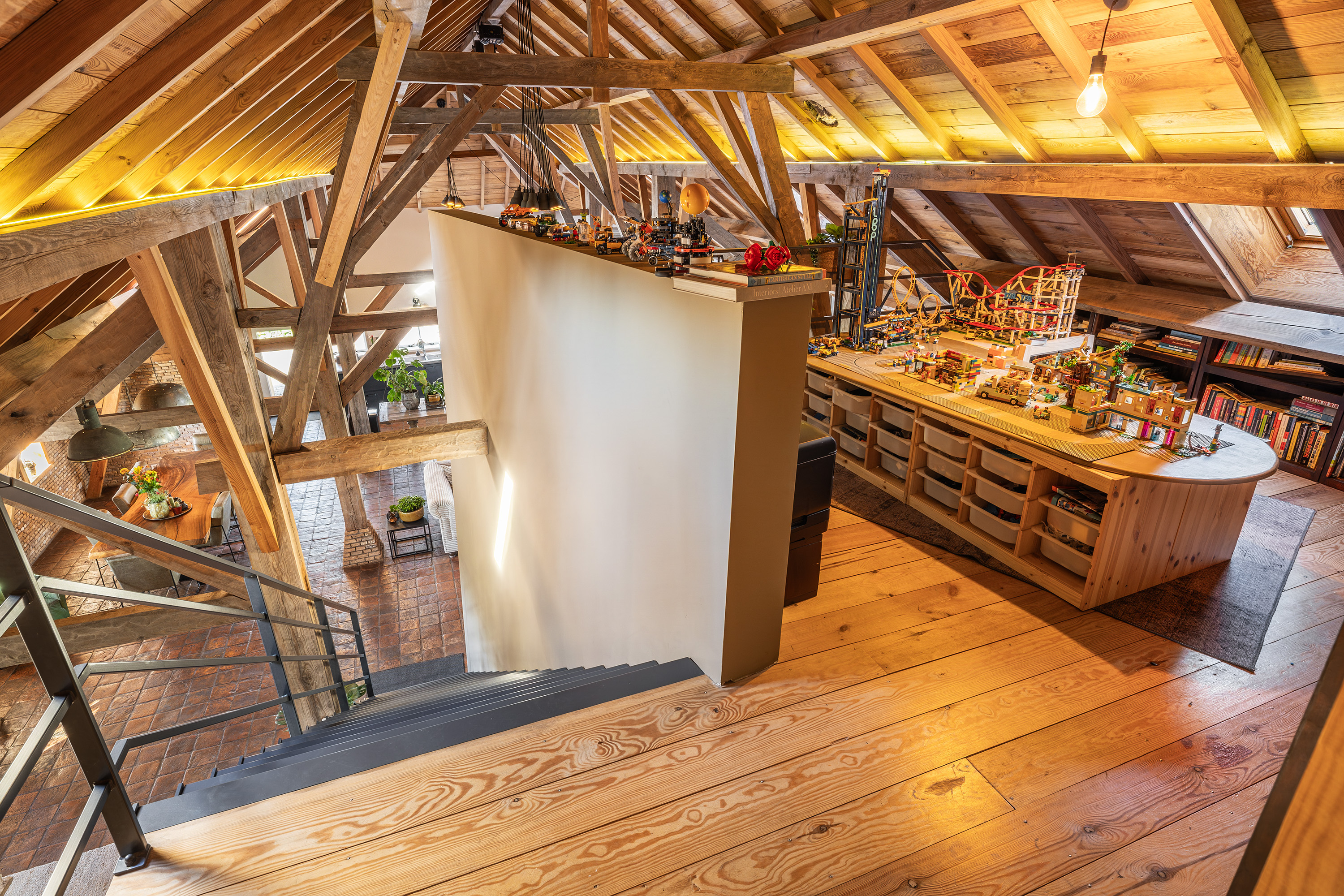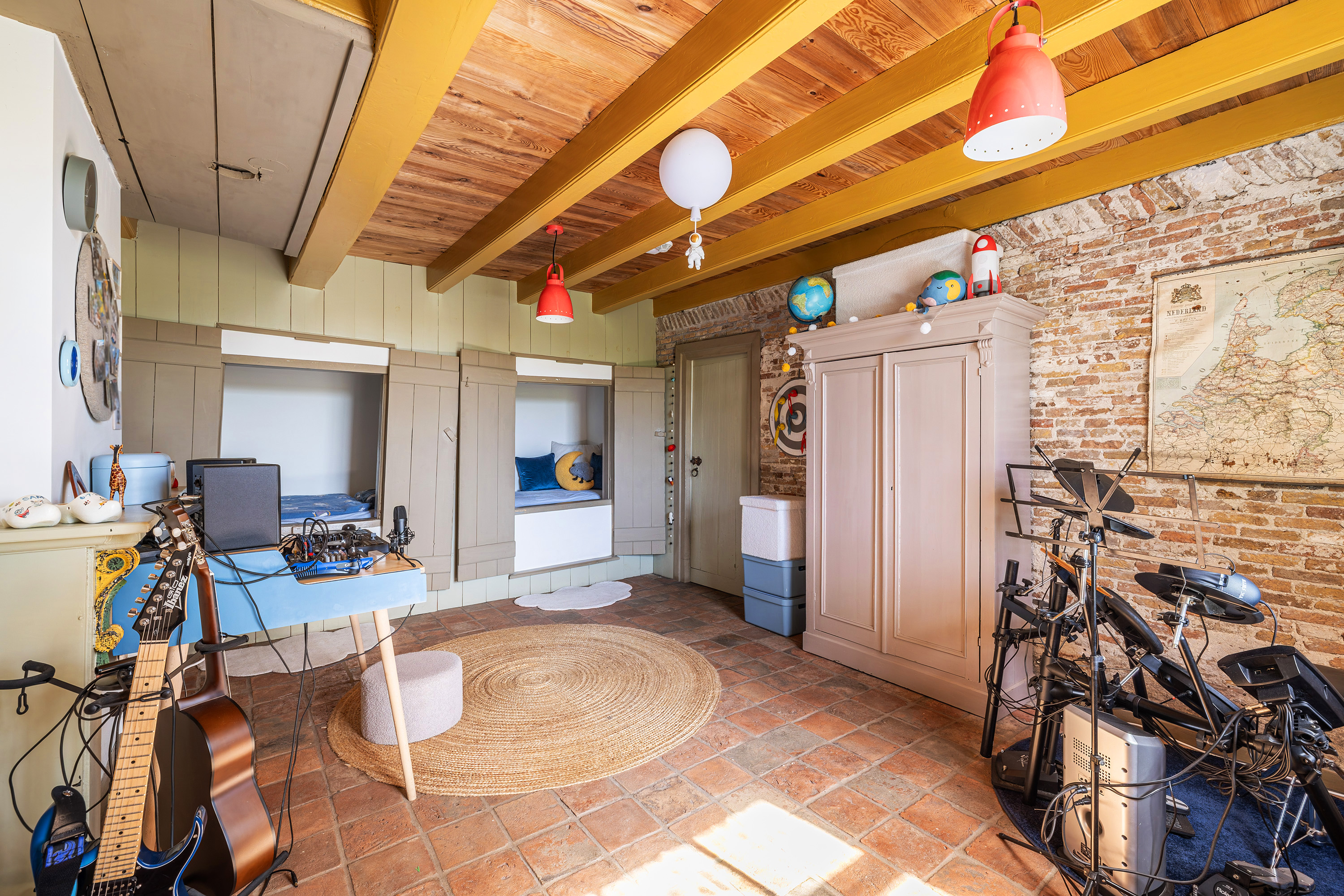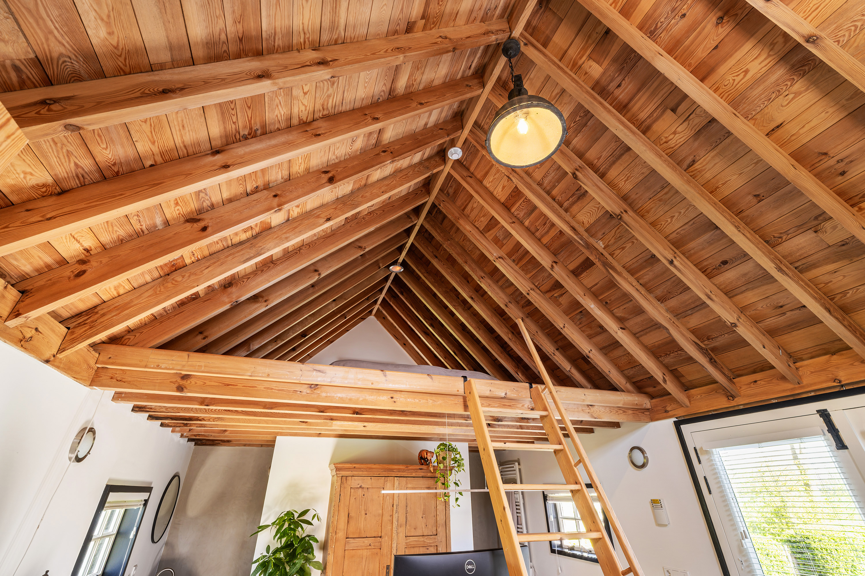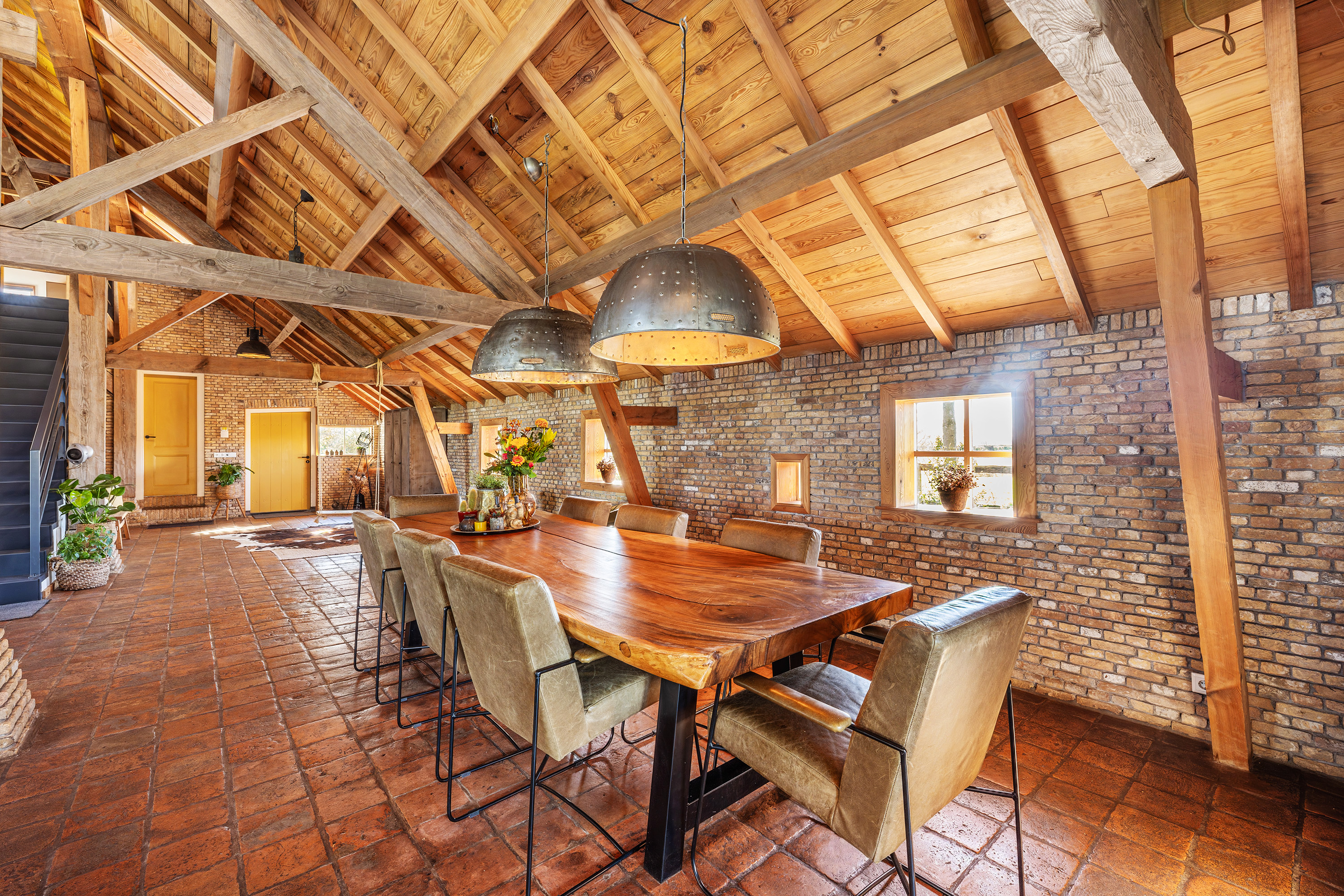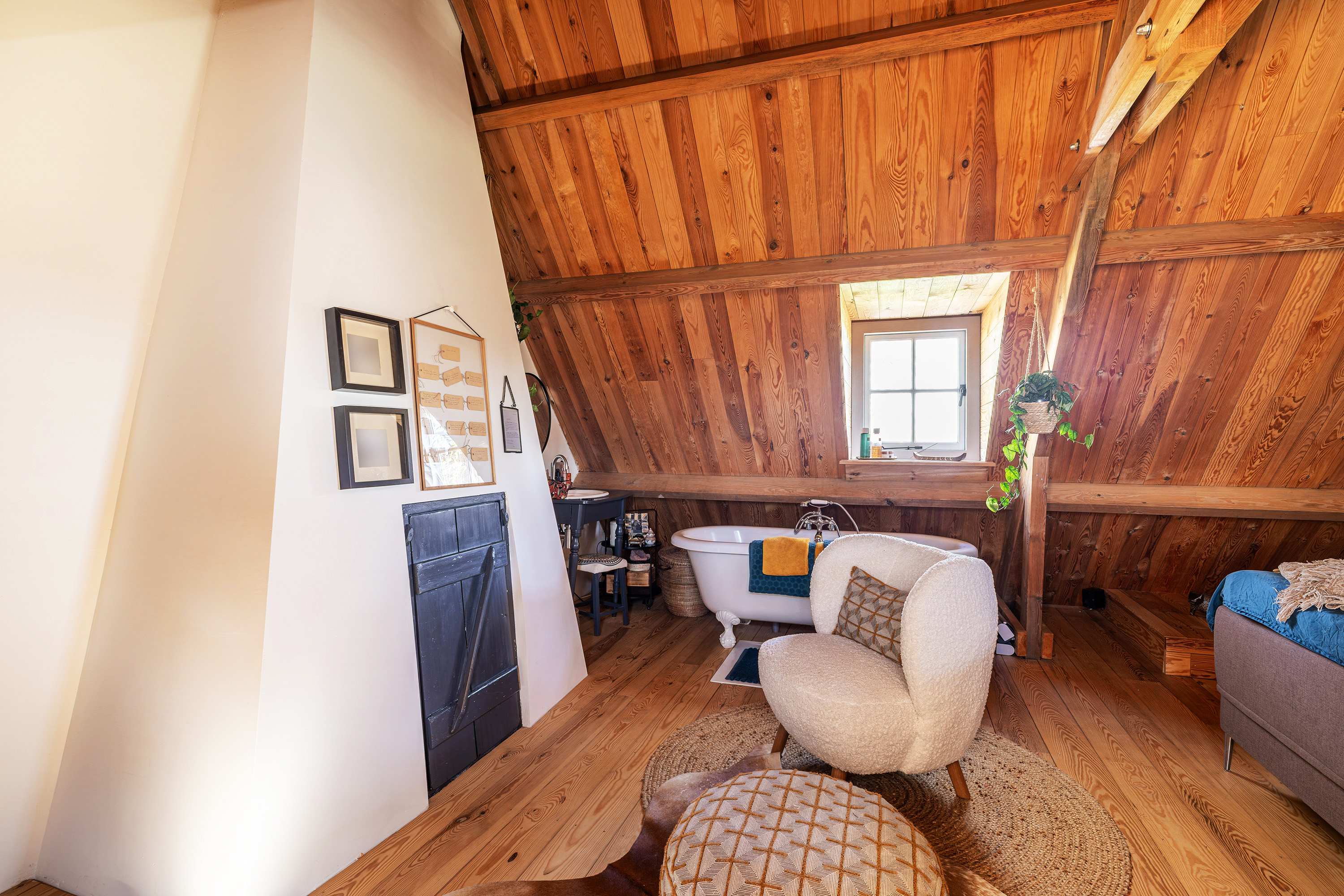 Via de vide bereik je door middel van een op maat gemaakte stalen trap de eerste verdieping. Hier bevindt zich een riante en sfeervolle slaapkamer met ligbad en 3 dakkapellen voor een fijne lichtinval. Verder heeft deze ruimte een prachtige houten kapconstructie met zichtbare gordingen en spanten.