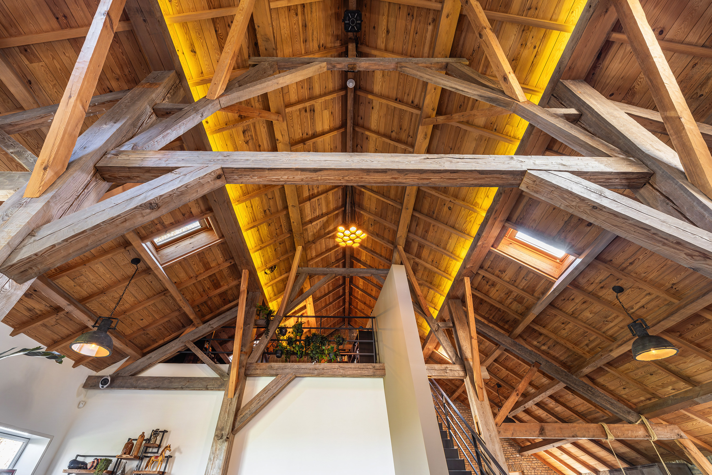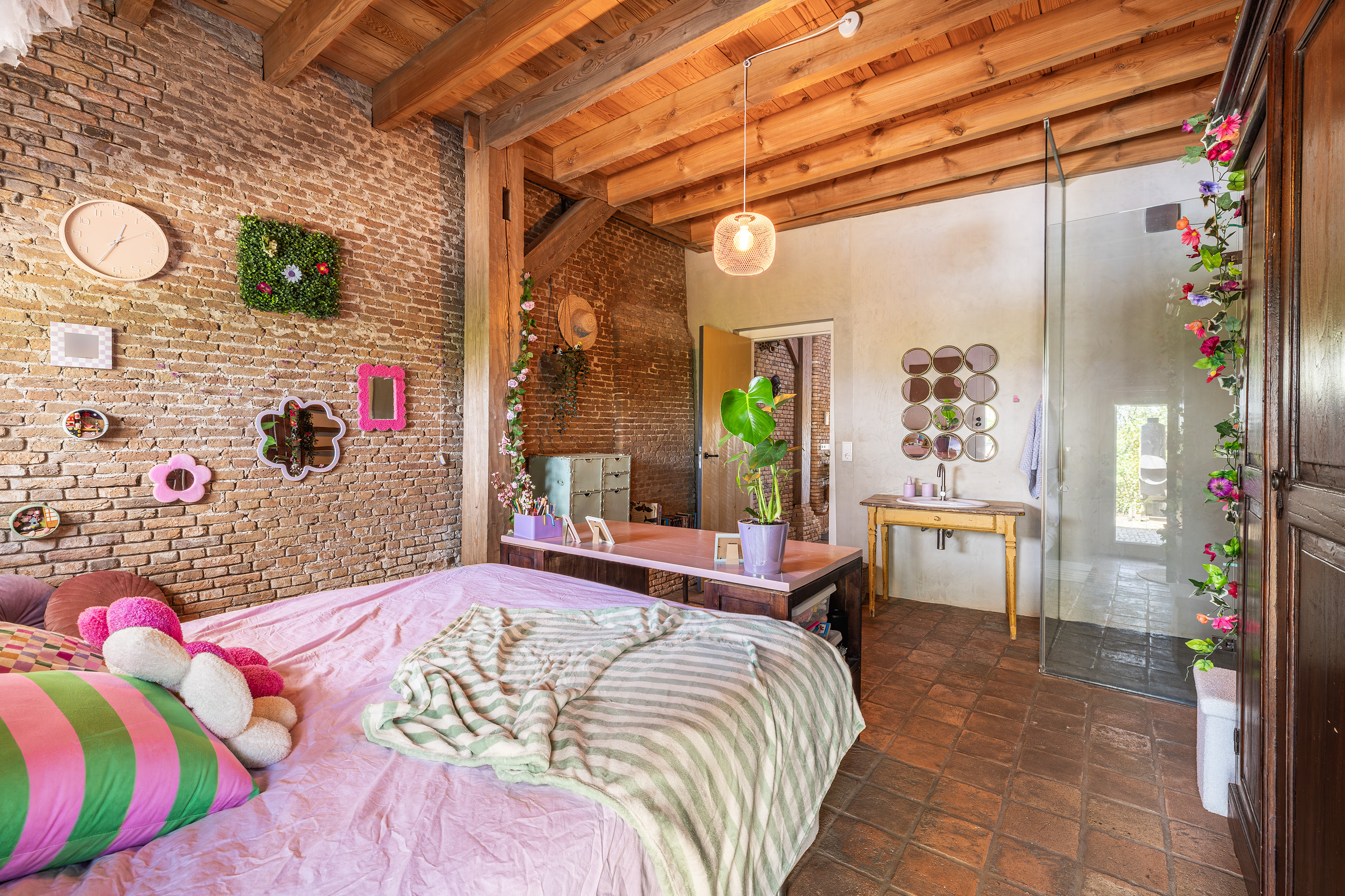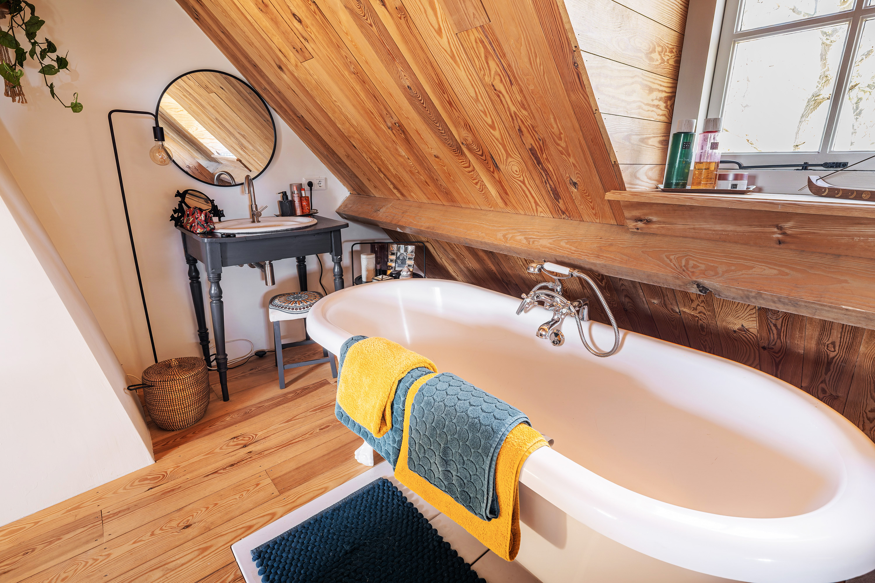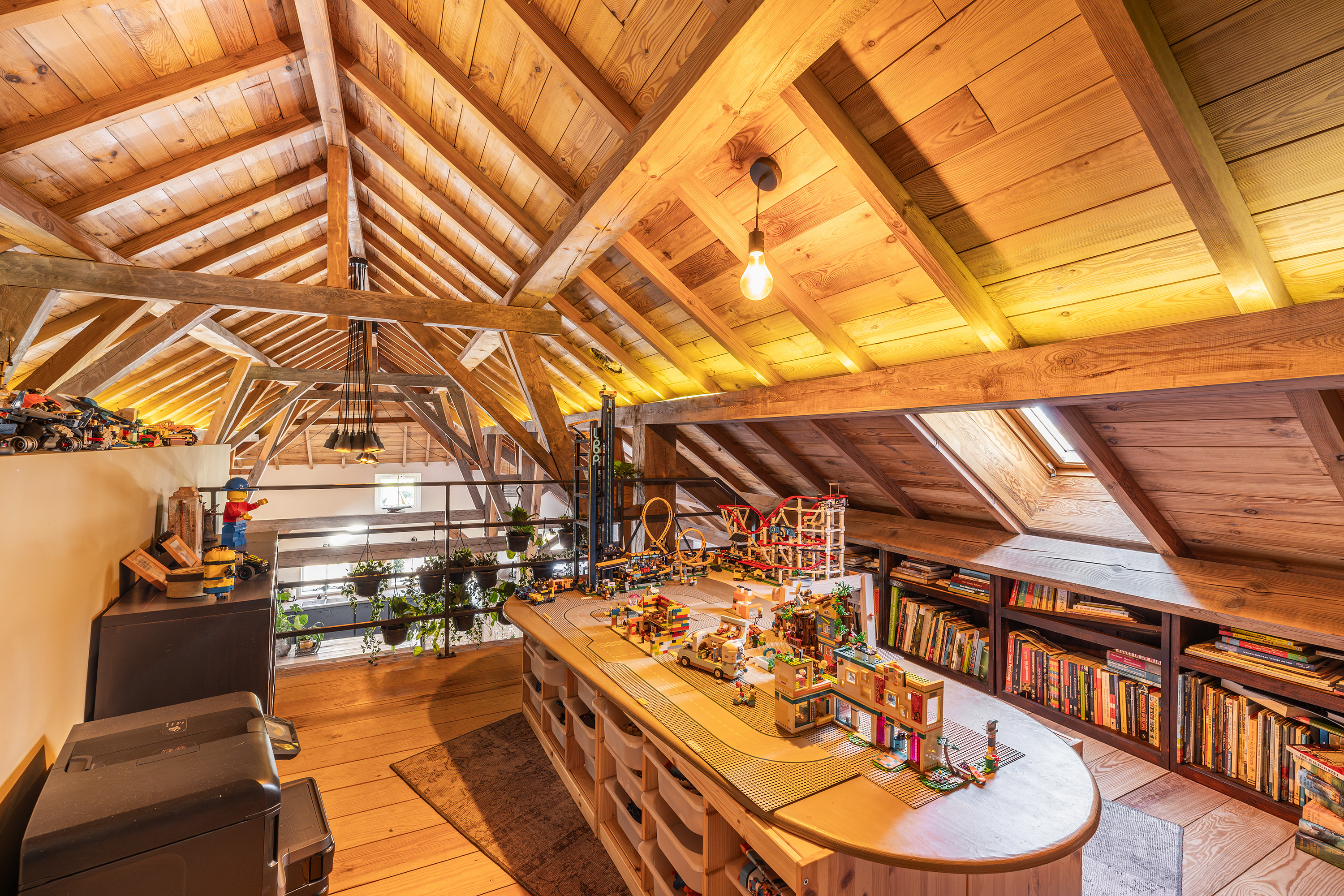 Via de vide bereik je door middel van een op maat gemaakte stalen trap de eerste verdieping. Hier bevindt zich een riante en sfeervolle slaapkamer met ligbad en 3 dakkapellen voor een fijne lichtinval. Verder heeft deze ruimte een prachtige houten kapconstructie met zichtbare gordingen en spanten.