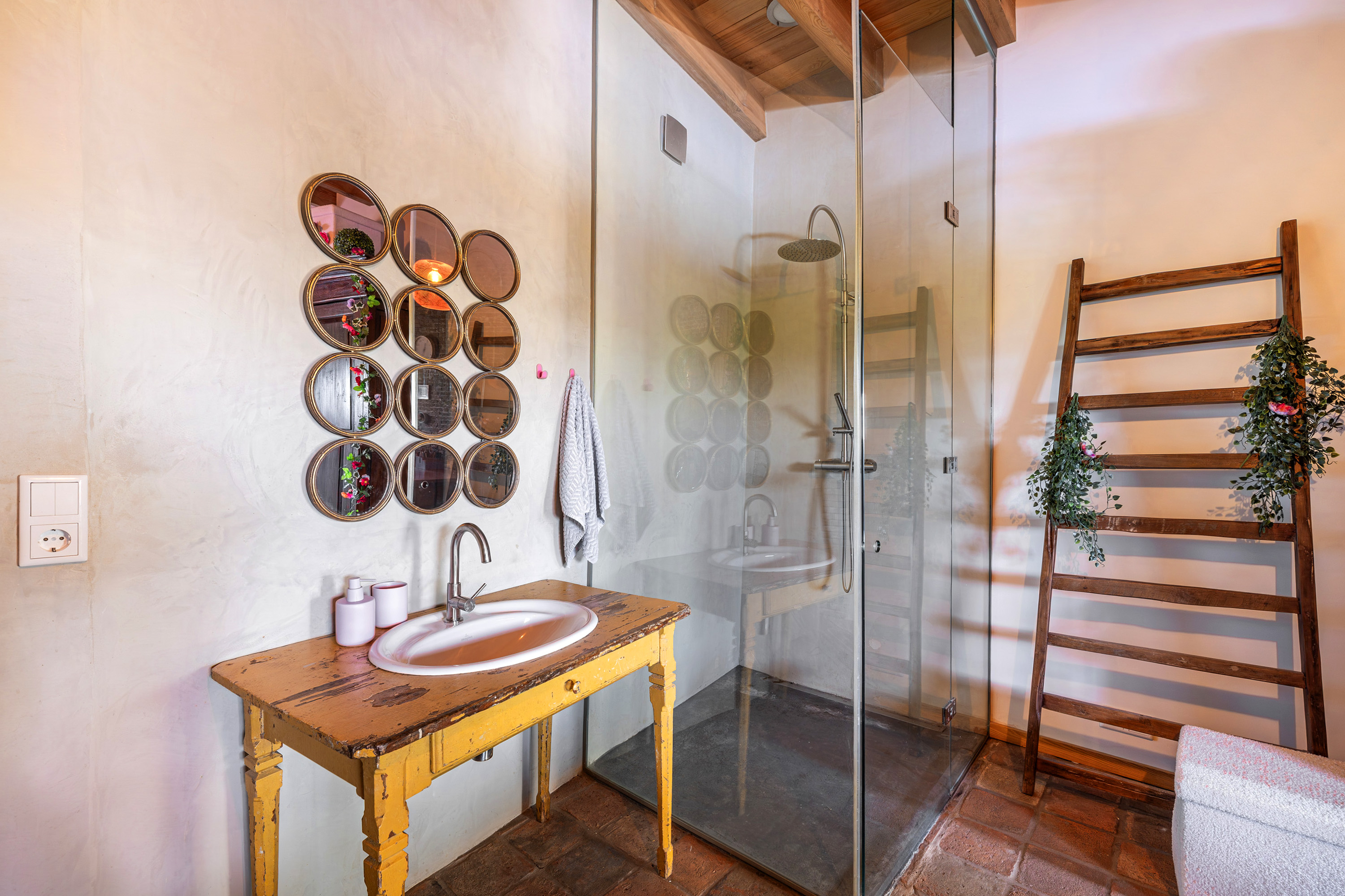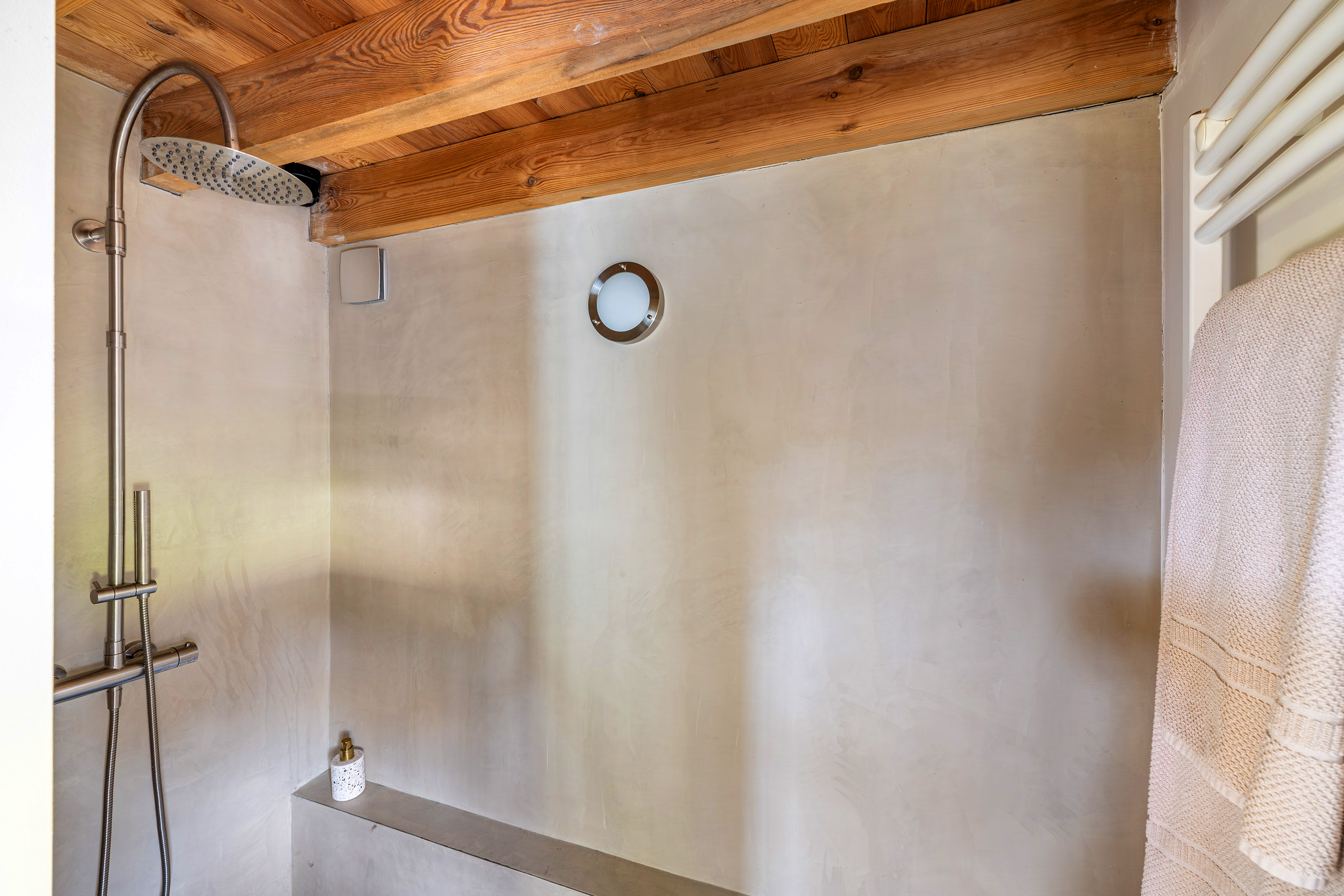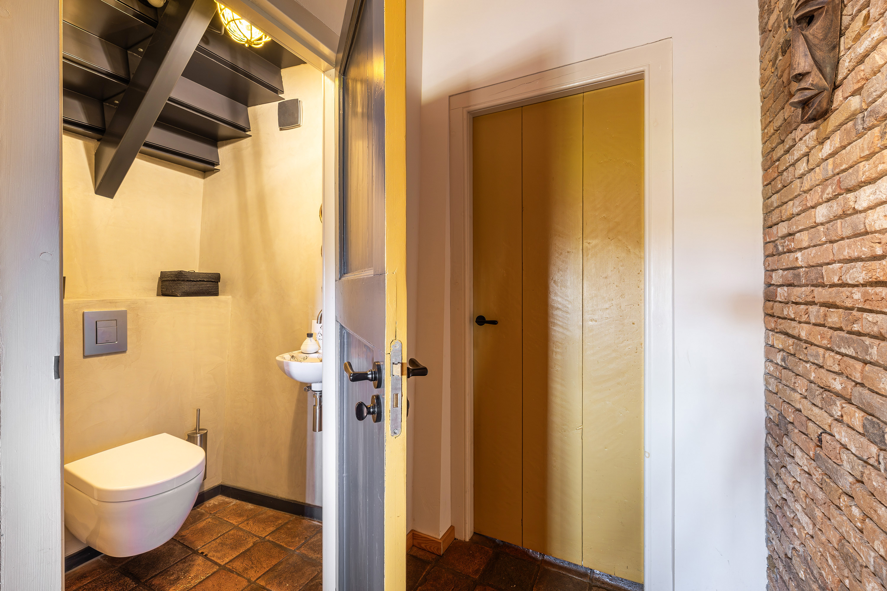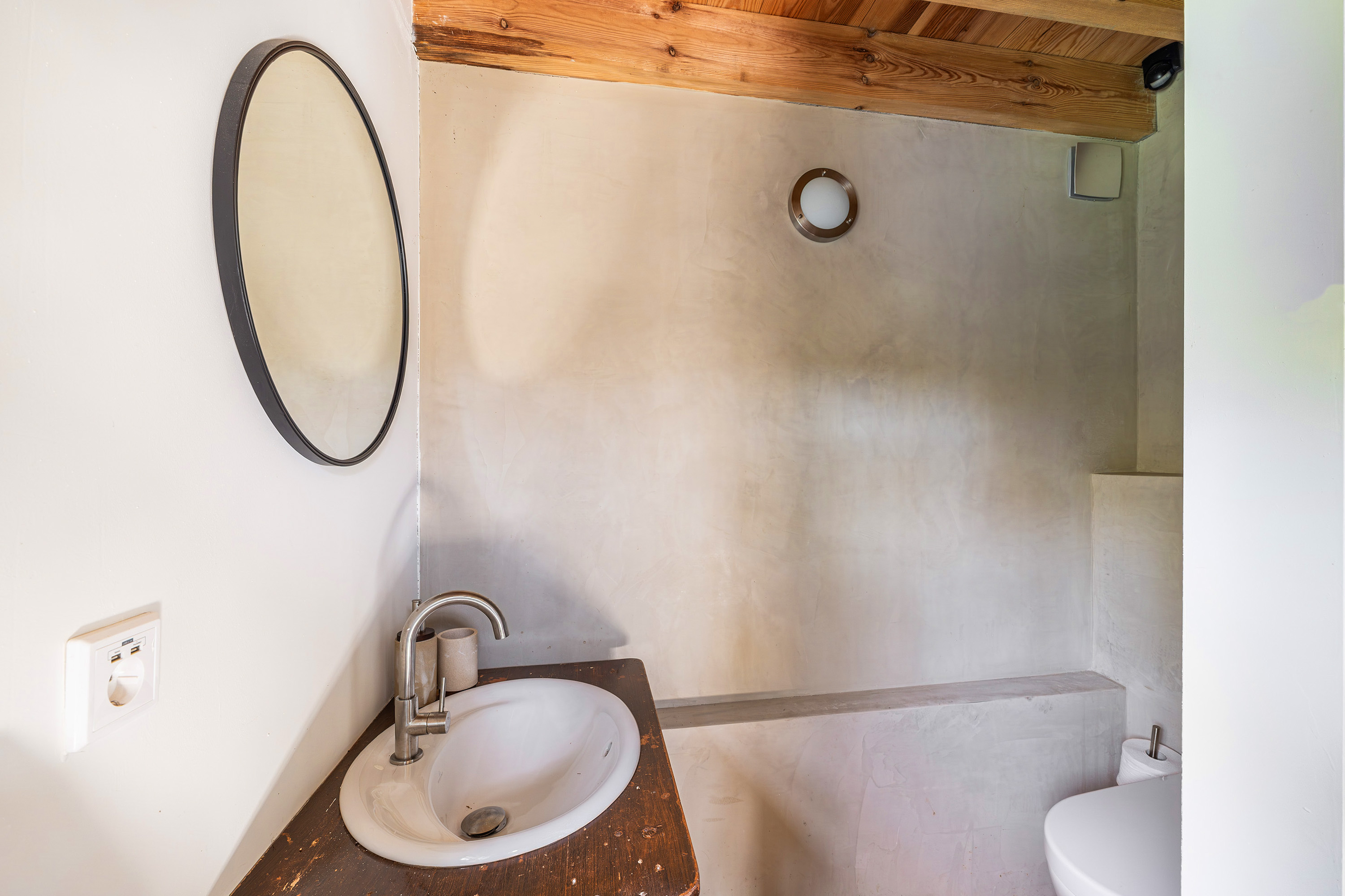 Verder is er aansluitend aan de woonkamer een extra slaapkamer met eigen inloopdouche en wastafel én een directe uitgang naar buiten. Nabij deze slaapkamer bevindt zich tevens een separaat hangend toilet met fonteintje. De gehele begane grond is afgewerkt met karakteristieke oude estrikken tegeltjes, gecombineerd met comfortabele vloerverwarming die tevens voor koeling in de warme perioden zorgt.