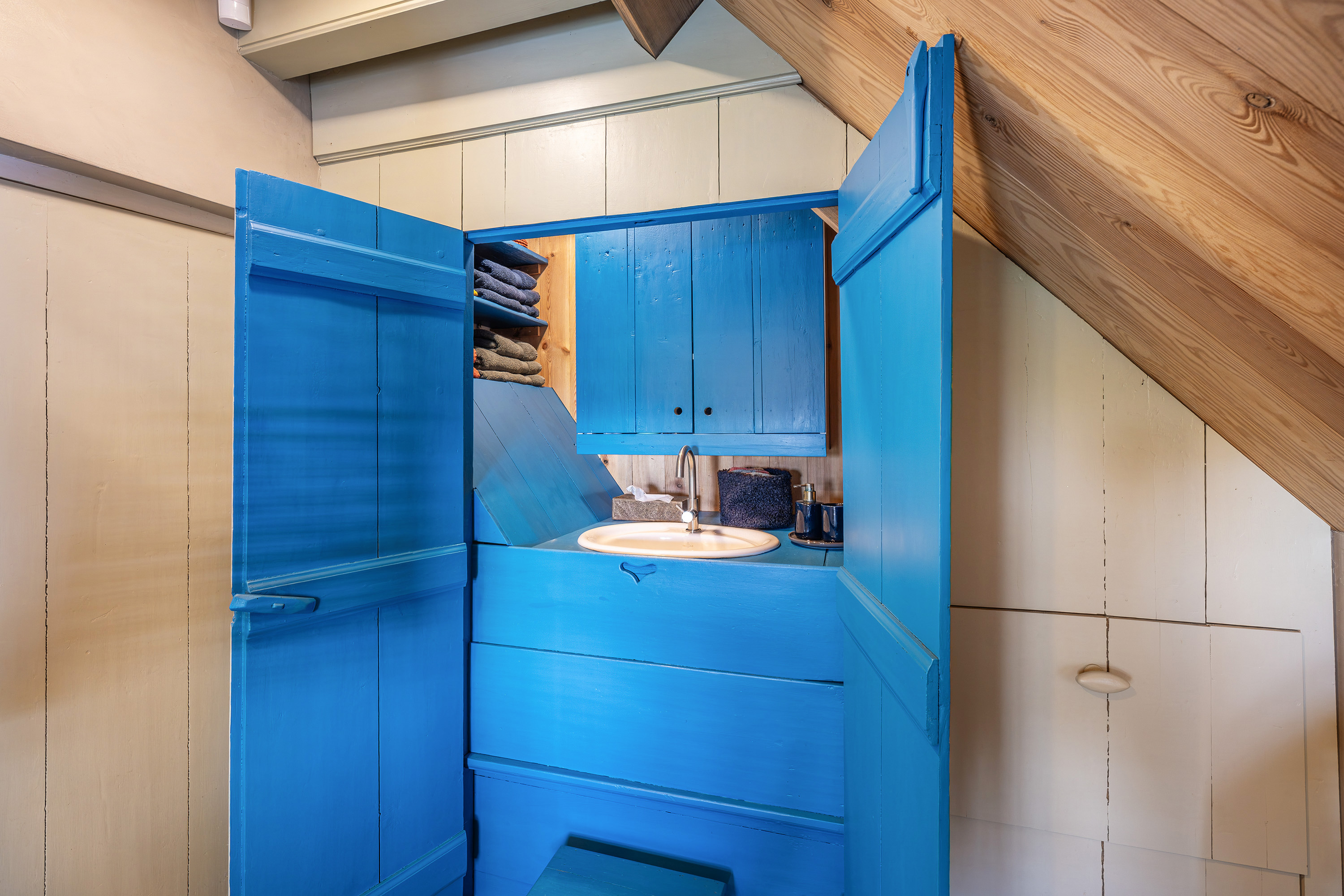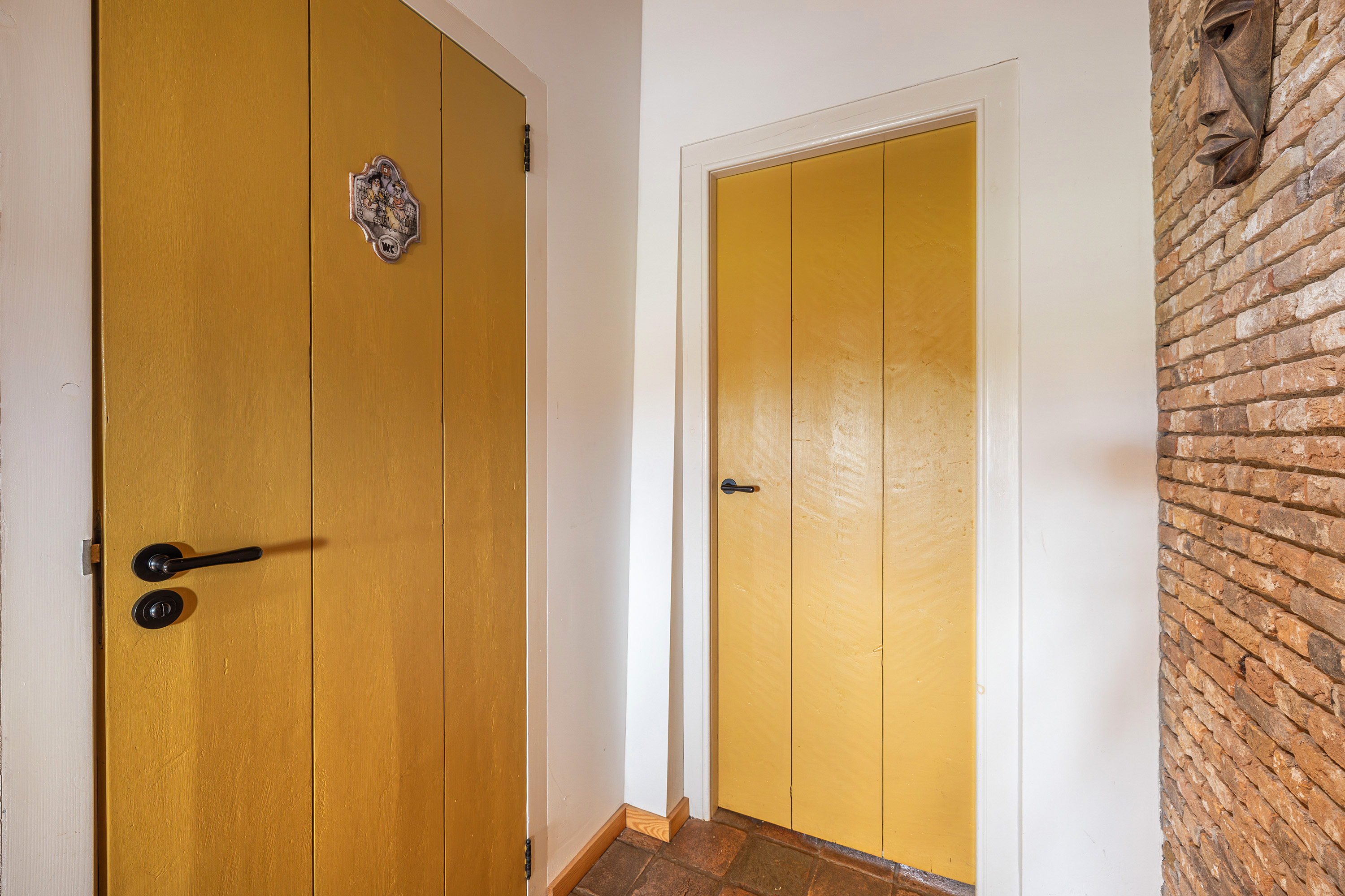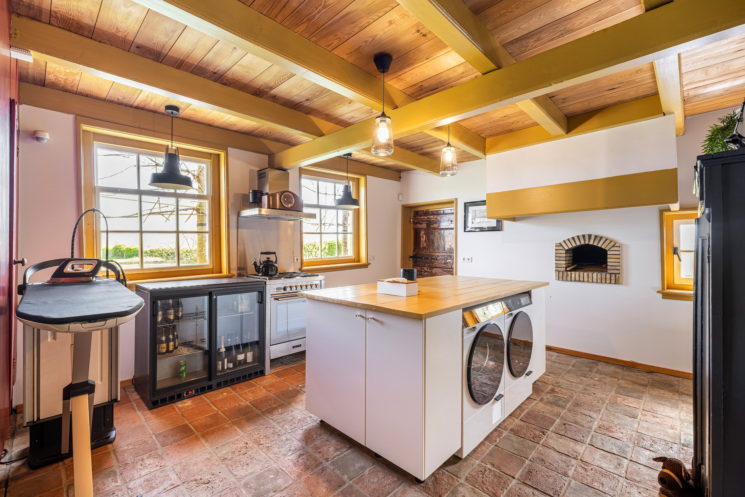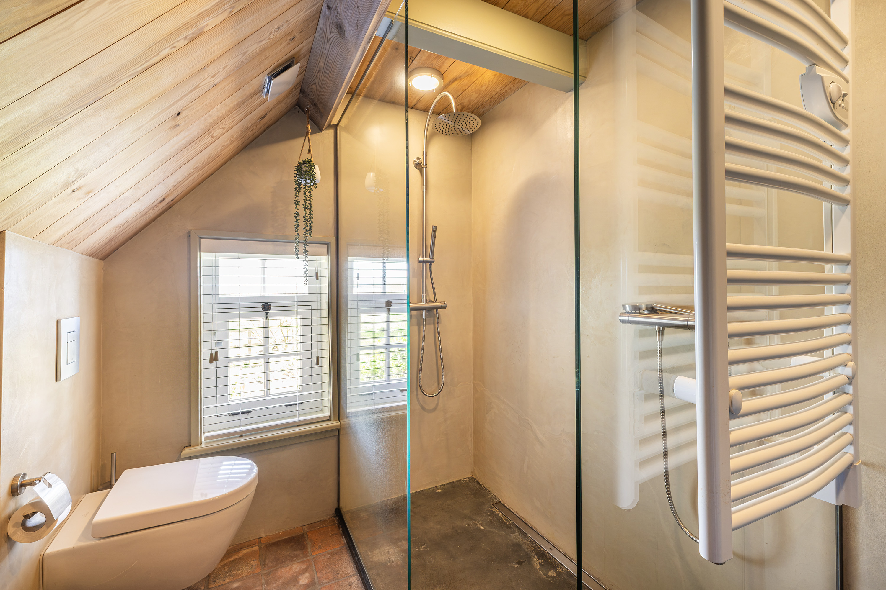Verder is er aansluitend aan de woonkamer een extra slaapkamer met eigen inloopdouche en wastafel én een directe uitgang naar buiten. Nabij deze slaapkamer bevindt zich tevens een separaat hangend toilet met fonteintje. De gehele begane grond is afgewerkt met karakteristieke oude estrikken tegeltjes, gecombineerd met comfortabele vloerverwarming die tevens voor koeling in de warme perioden zorgt.