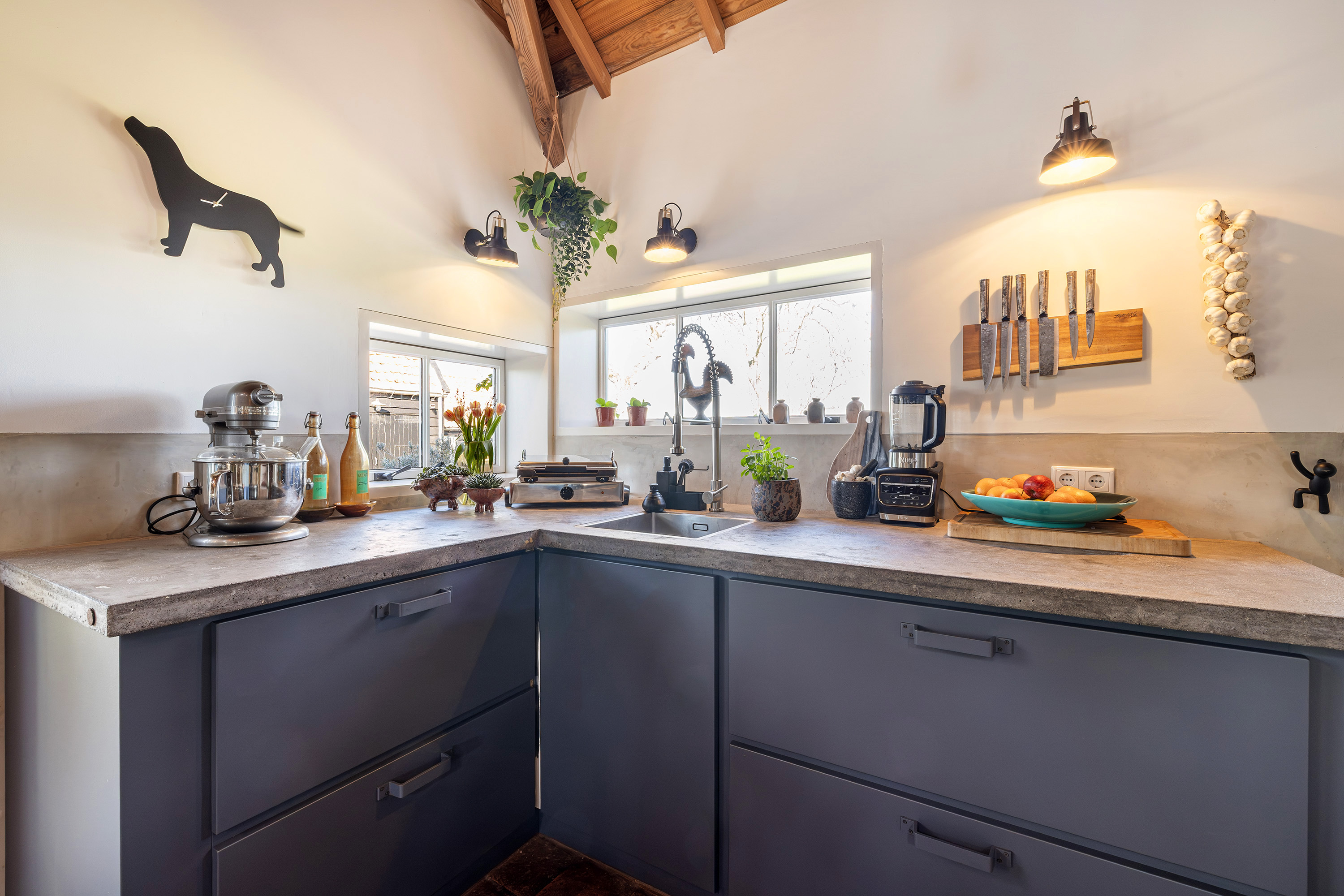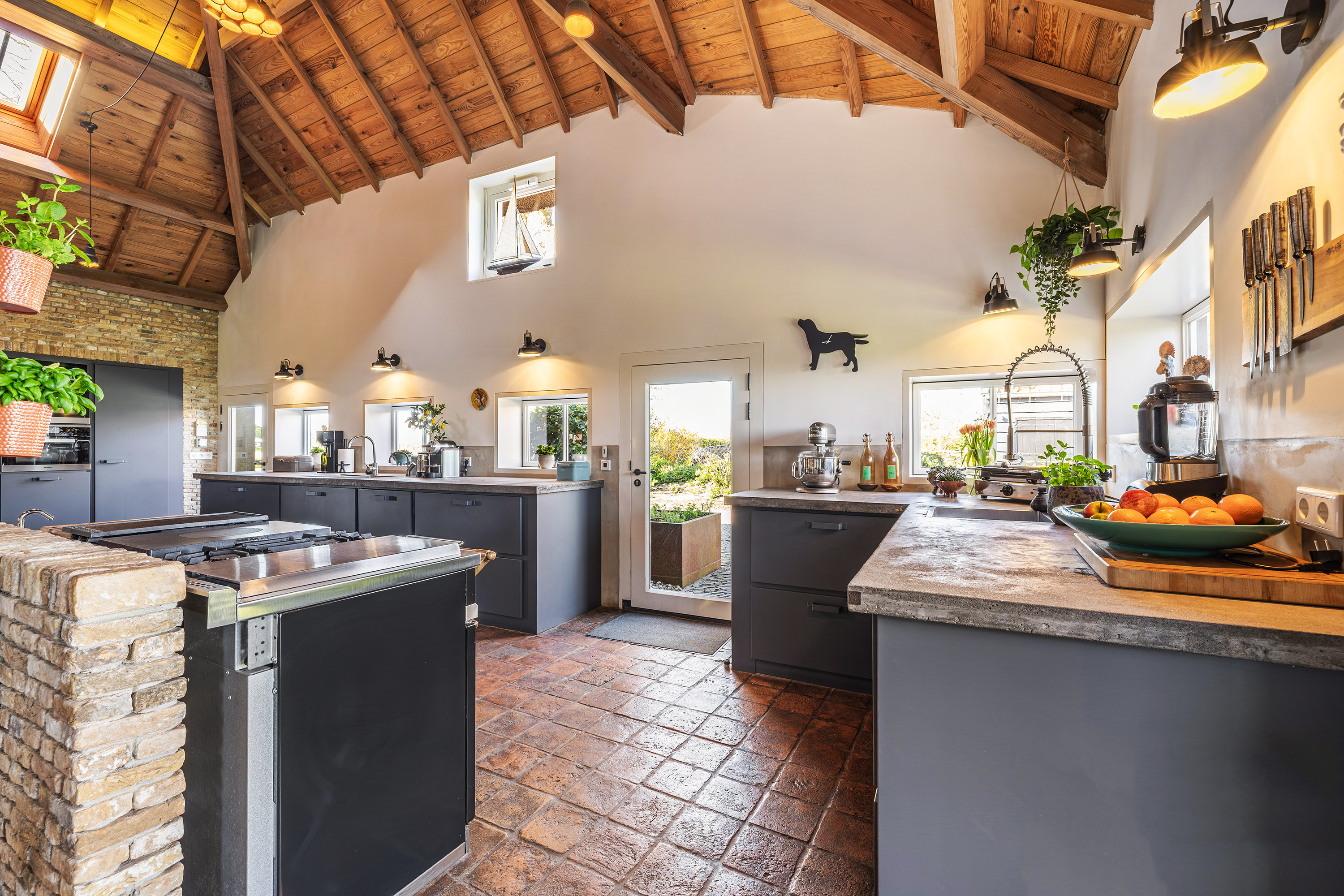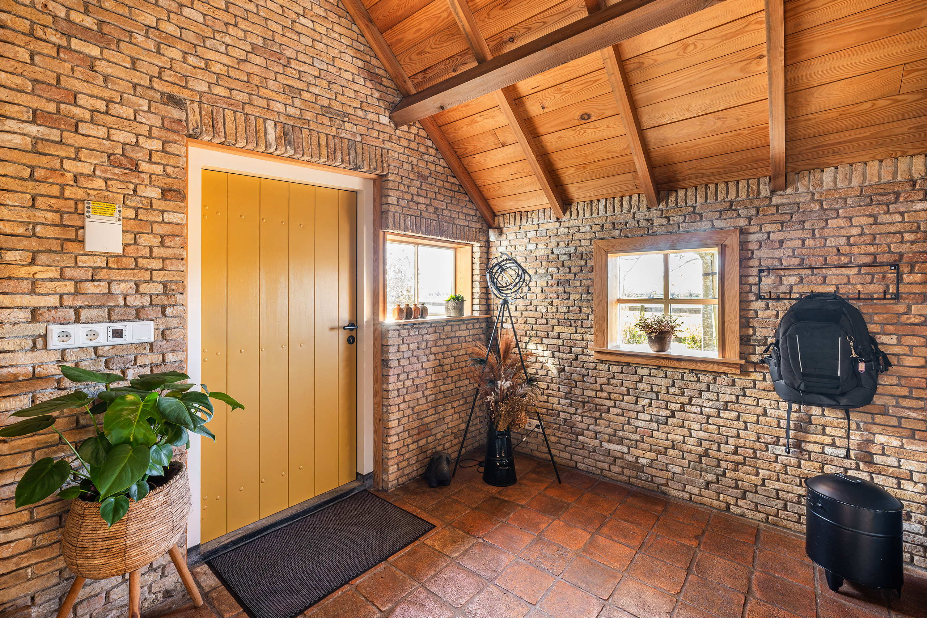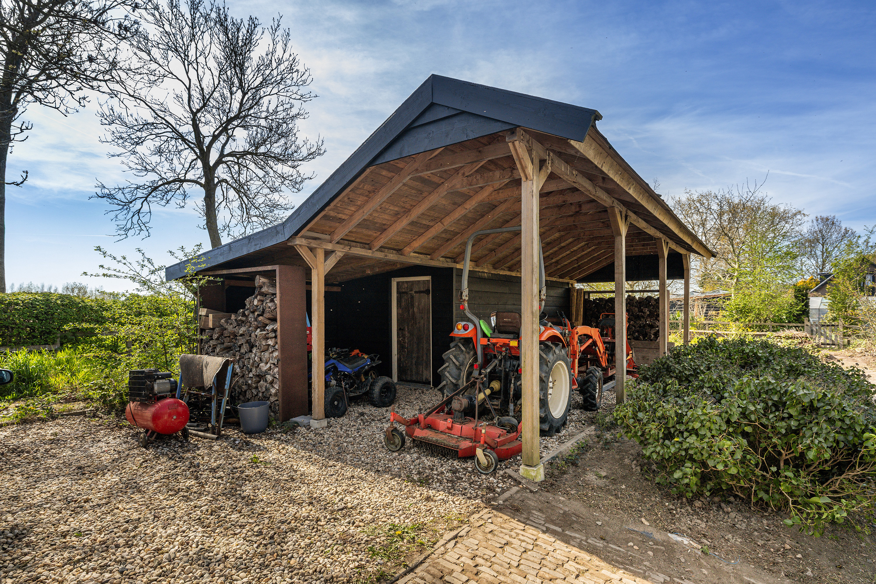 De kapschuur beschikt over een ruimte voor tuinmateriaal, fietsen en alles wat bij het buitenleven hoort. Tegelijkertijd is het een fijne plek om beschut te zitten en te genieten van de omgeving.
