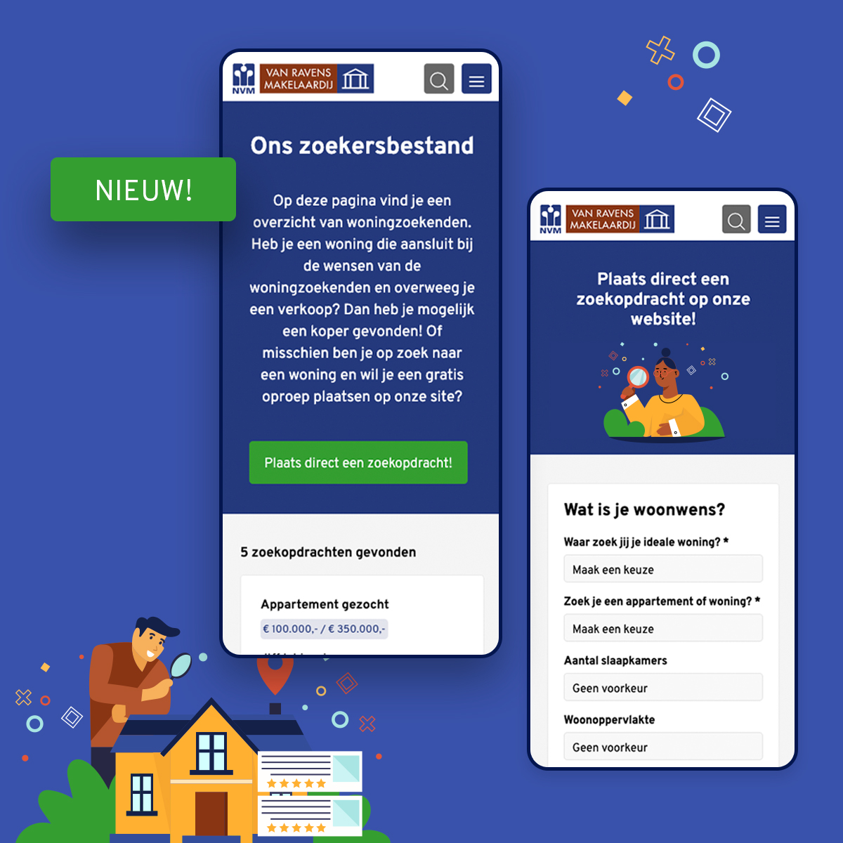 Nieuw en uniek in de regio! Wij brengen partijen graag samen, dat is ons vak. Ben je op zoek naar een woning en wil je een gratis oproep plaatsen op onze site? Of heb je een woning die aansluit bij de wensen van de woningzoekenden en overweeg je een verkoop? Dan heb je mogelijk een koper gevonden! Wij kunnen jullie met elkaar in contact brengen. Wordt het dan een definitieve match, dan zorgen wij voor de afhandeling tegen een aantrekkelijk tarief. https://www.vanravens.nl/zoekopdrachten