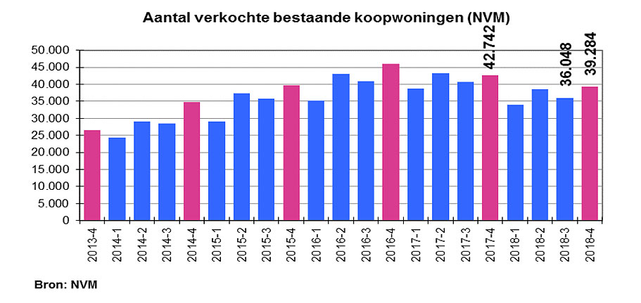 Makelaars van de NVM hebben in het vierde kwartaal van 2018 ruim 8% minder woningen verkocht dan een jaar geleden. Het is het zesde achtereenvolgende kwartaal dat het aantal transacties lager uitkomt in vergelijking met het jaar ervoor. In totaal verkochten de NVM-makelaars het afgelopen kwartaal bijna 39.300 woningen, 3.500 minder dan een jaar eerder. De laatste vier kwartalen registreerde de NVM bijna 148.000 transacties van bestaande koopwoningen bij haar makelaars. Voor de totale markt betekent dit 214.000 transacties. Dat is 10,7% minder dan een jaar eerder. De gemiddelde transactieprijs is in het vierde kwartaal 2018 gestegen tot een recordniveau van 298.000 euro. Vergeleken met een jaar eerder zijn woningen daarmee 10,3% duurder geworden. Maar liefst 38% van de verkochte woningen ging boven de vraagprijs weg.