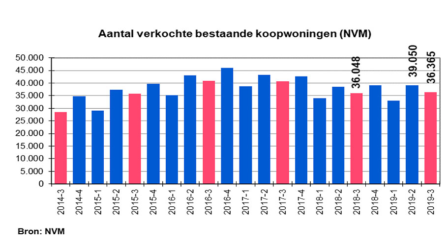 Afgelopen week publiceerde de NVM de derde kwartaalcijfers van 2019. Voor Nederland als geheel komt de krapte-indicator dit kwartaal uit op 3,1. Een krapte-indicator van 3,1 houdt in dat de consument voor elke aankoop uit 3,1 concurrerende woningen uit het aanbod kan kiezen. De transactieprijzen van woningen zijn sinds het begin van de crisis in Nederland met gemiddeld 23,8% gestegen. De gemiddelde prijs van een woning in Nederland in het tweede kwartaal van 2019 komt uit op € 442.000,-.